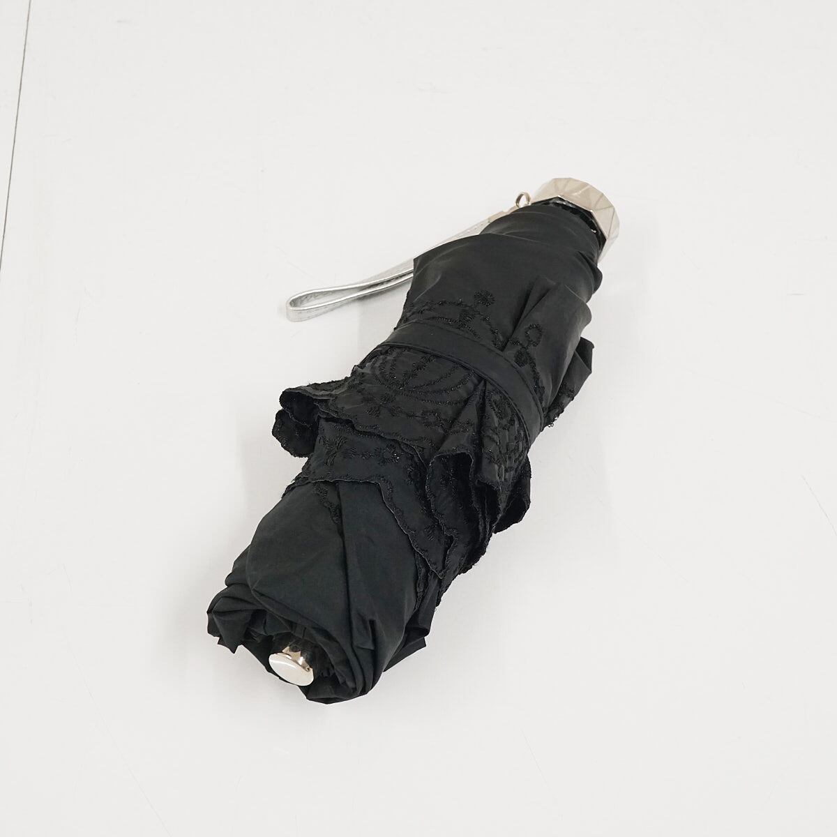 ブラックの生地のアウトラインにエレガントな刺繍をたっぷりと施した折りたたみパラソルです。