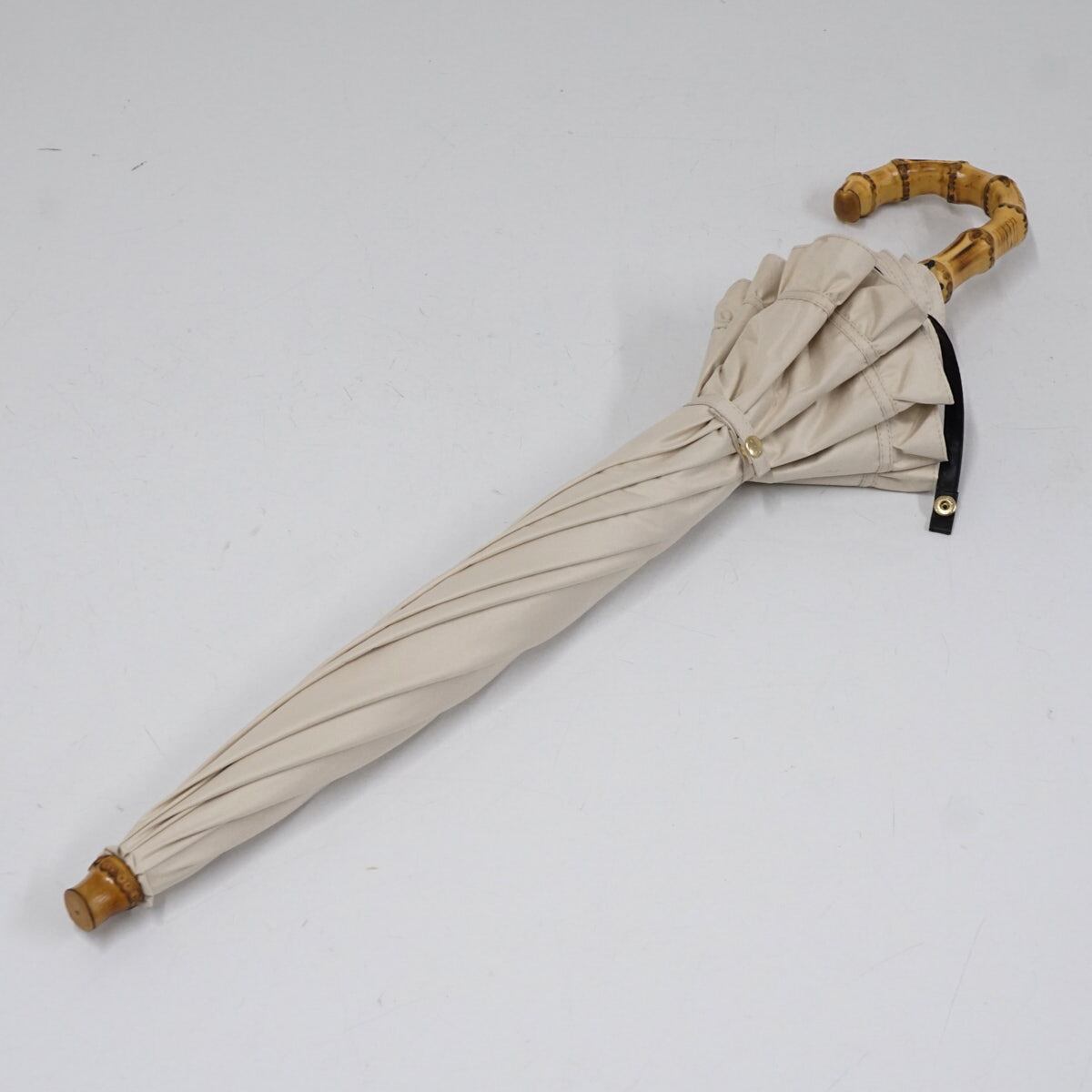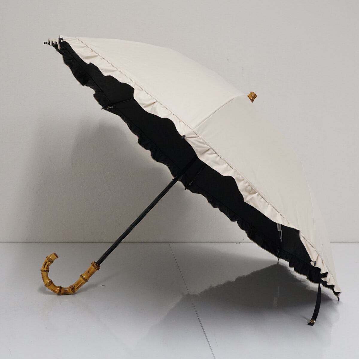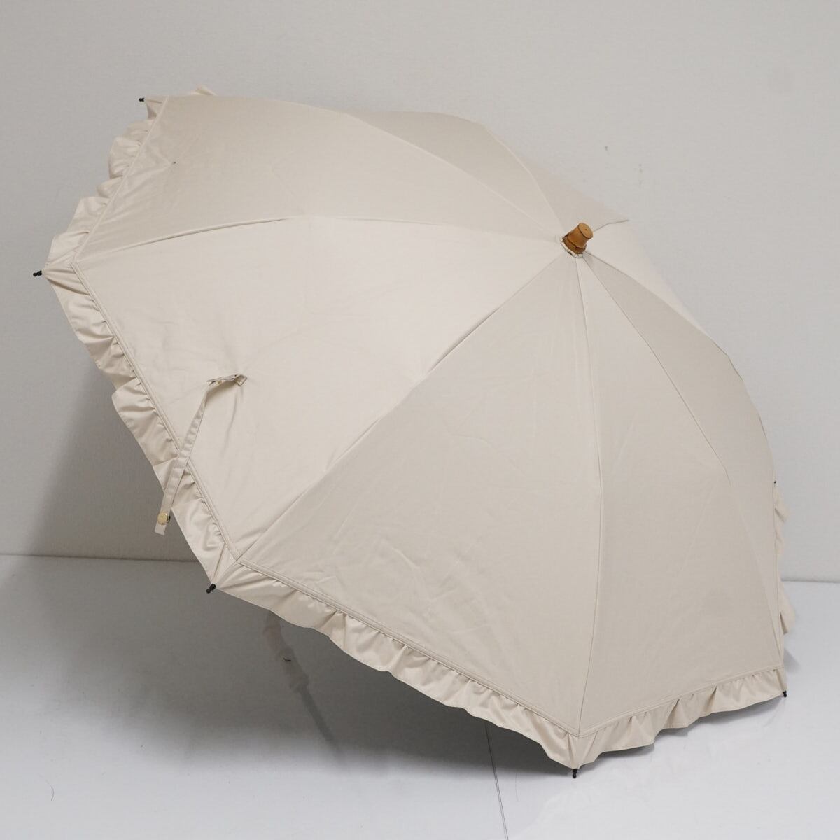 ベージュ無地の生地にボリュームのあるフリルで囲んだデザインの日傘です。