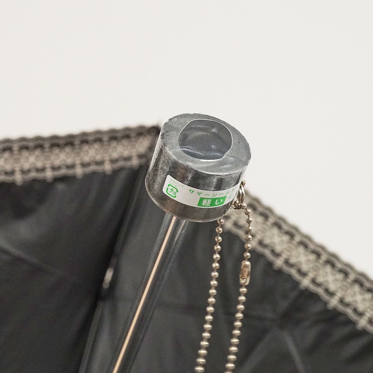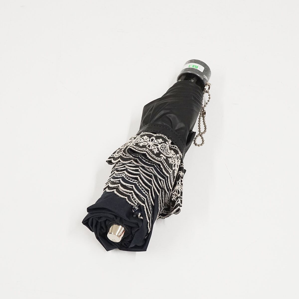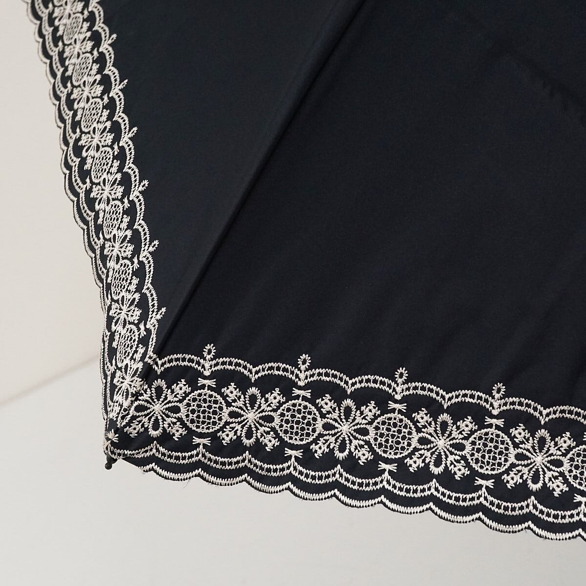 生地の外周にエレガントな刺繍をたっぷりと施した上品な折りたたみパラソルです。