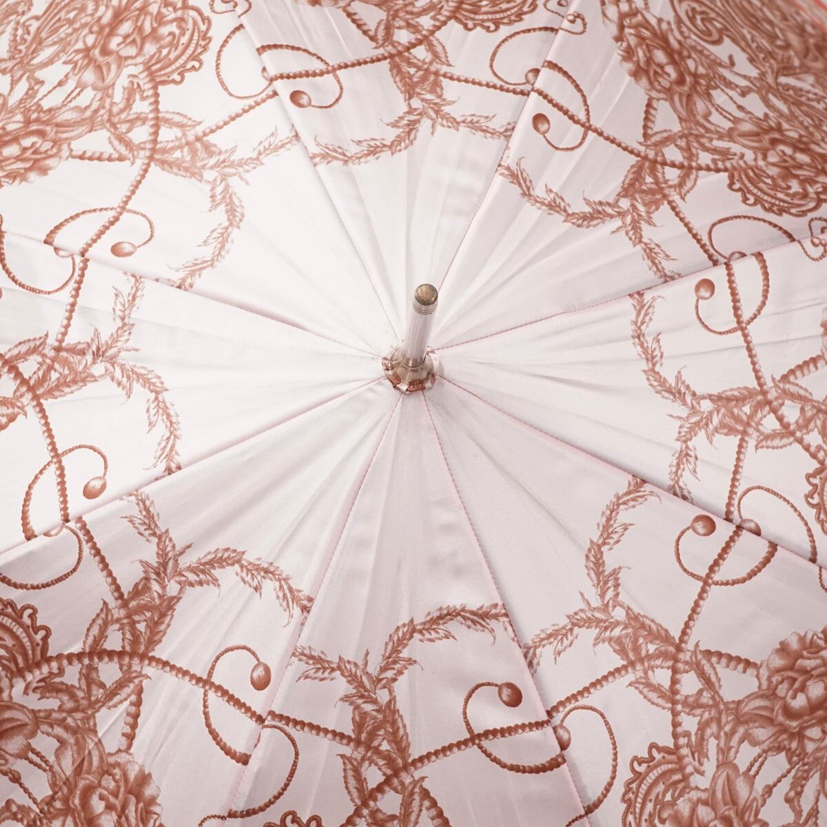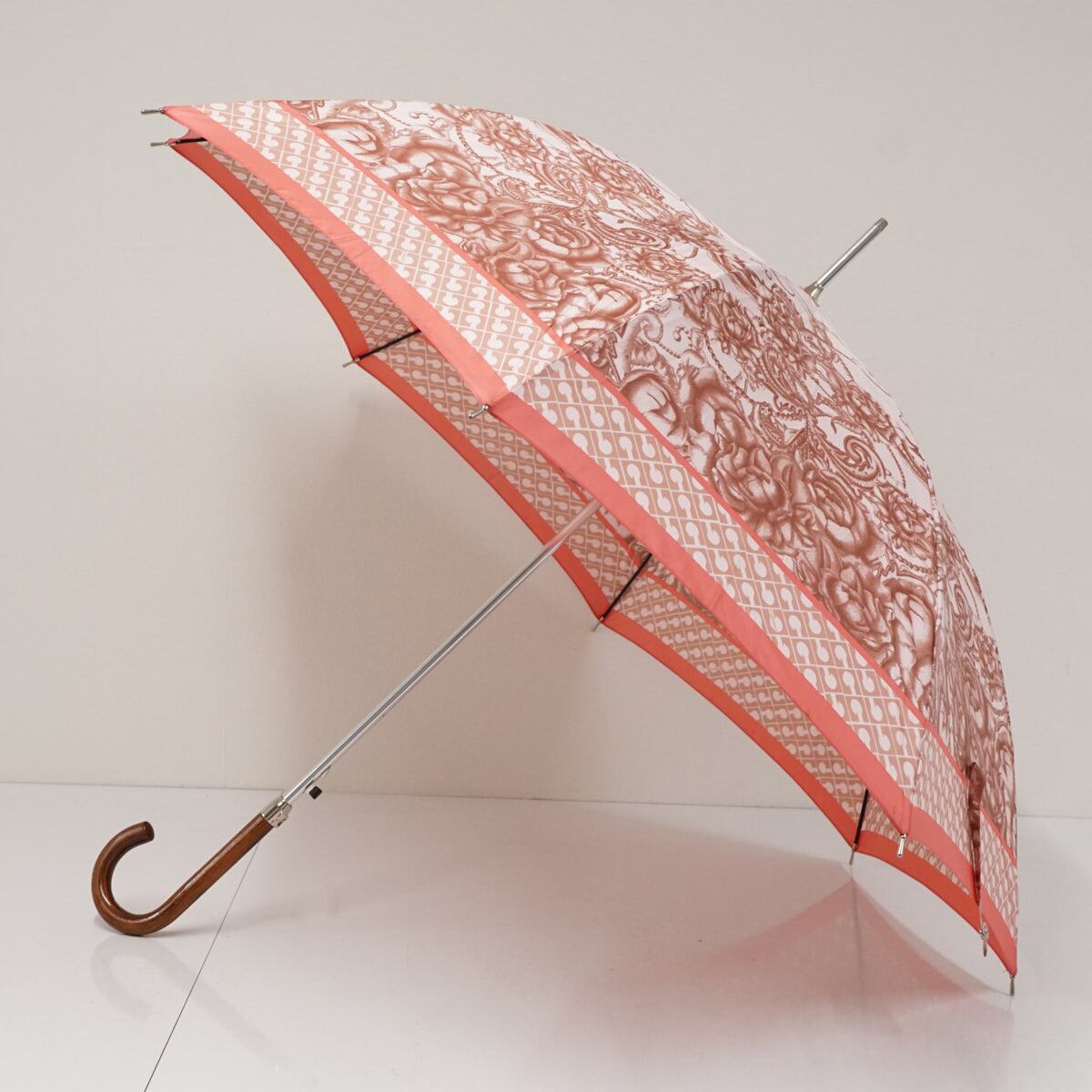 バラ模様の生地の縁にモノグラムとピンクのラインをデザインした傘です。