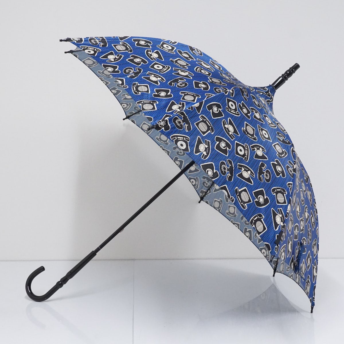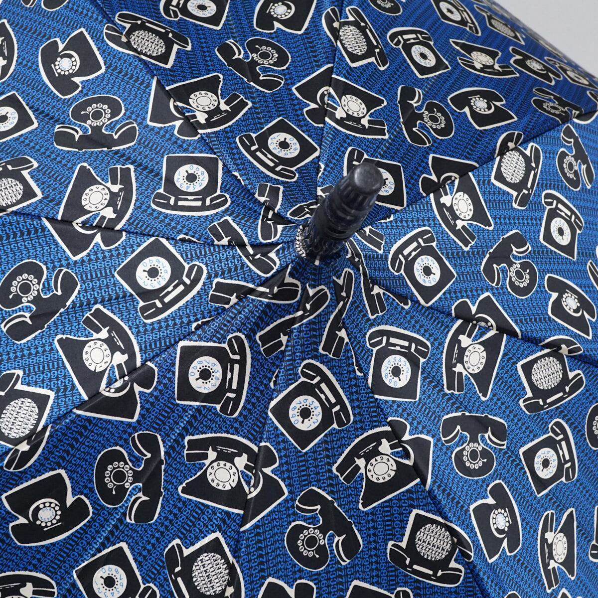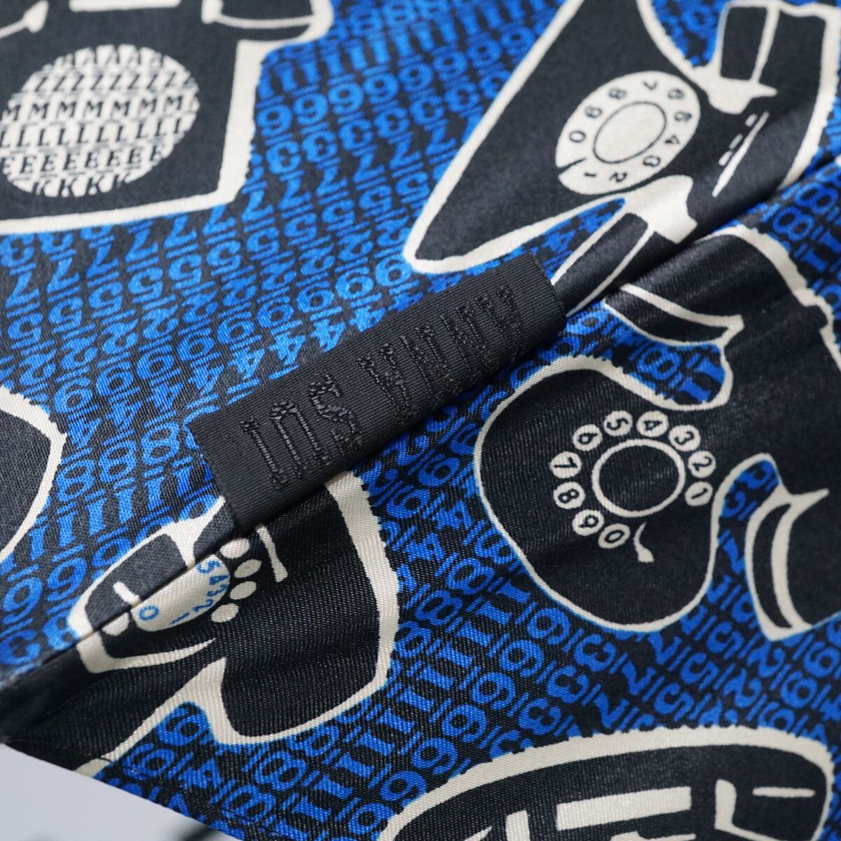 ブルーの生地に、個性的な黒電話と数字の総柄が描かれています。
