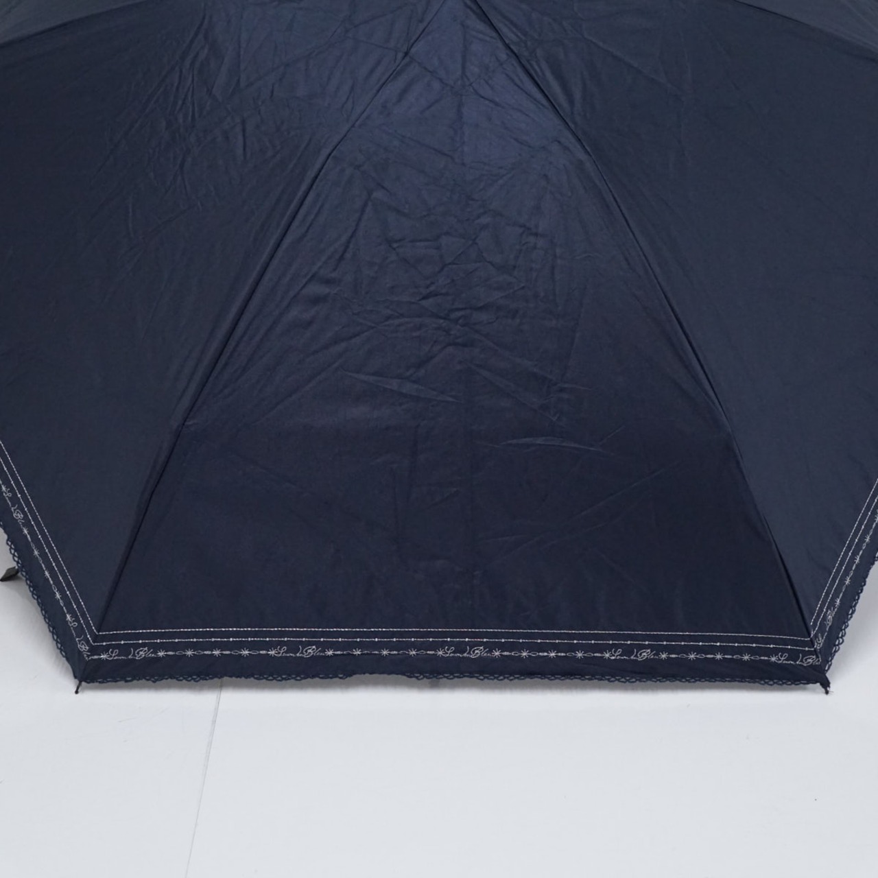 ネイビーの生地の縁にシルバーの糸で刺繍を施した晴雨兼用のパラソルです。