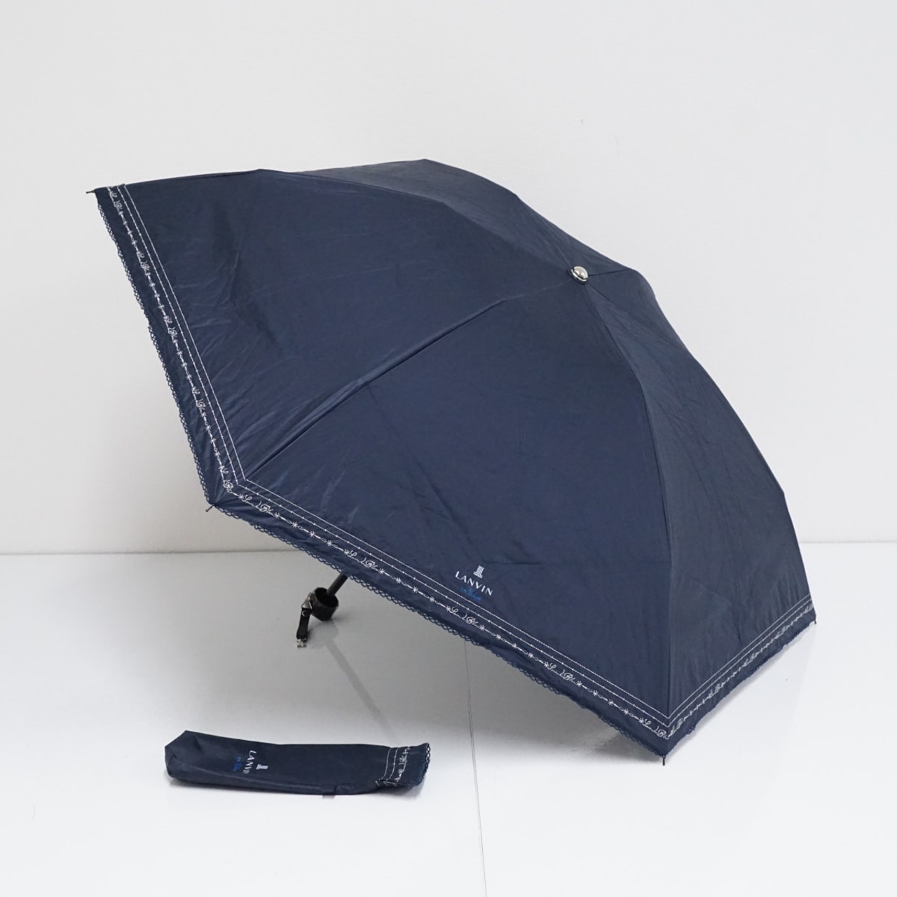 折りたたみ日傘 LANVIN en Bleu ランバンオンブルー USED美品 ロゴプリント すそ刺繍 グラス骨 シンプル 50cm FS9078
