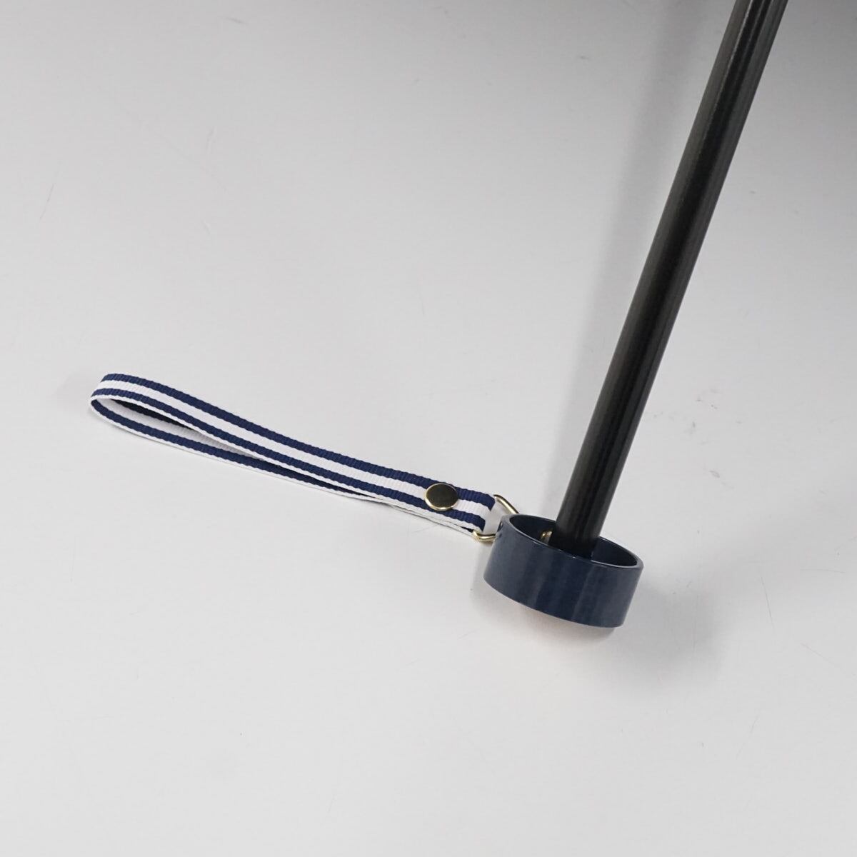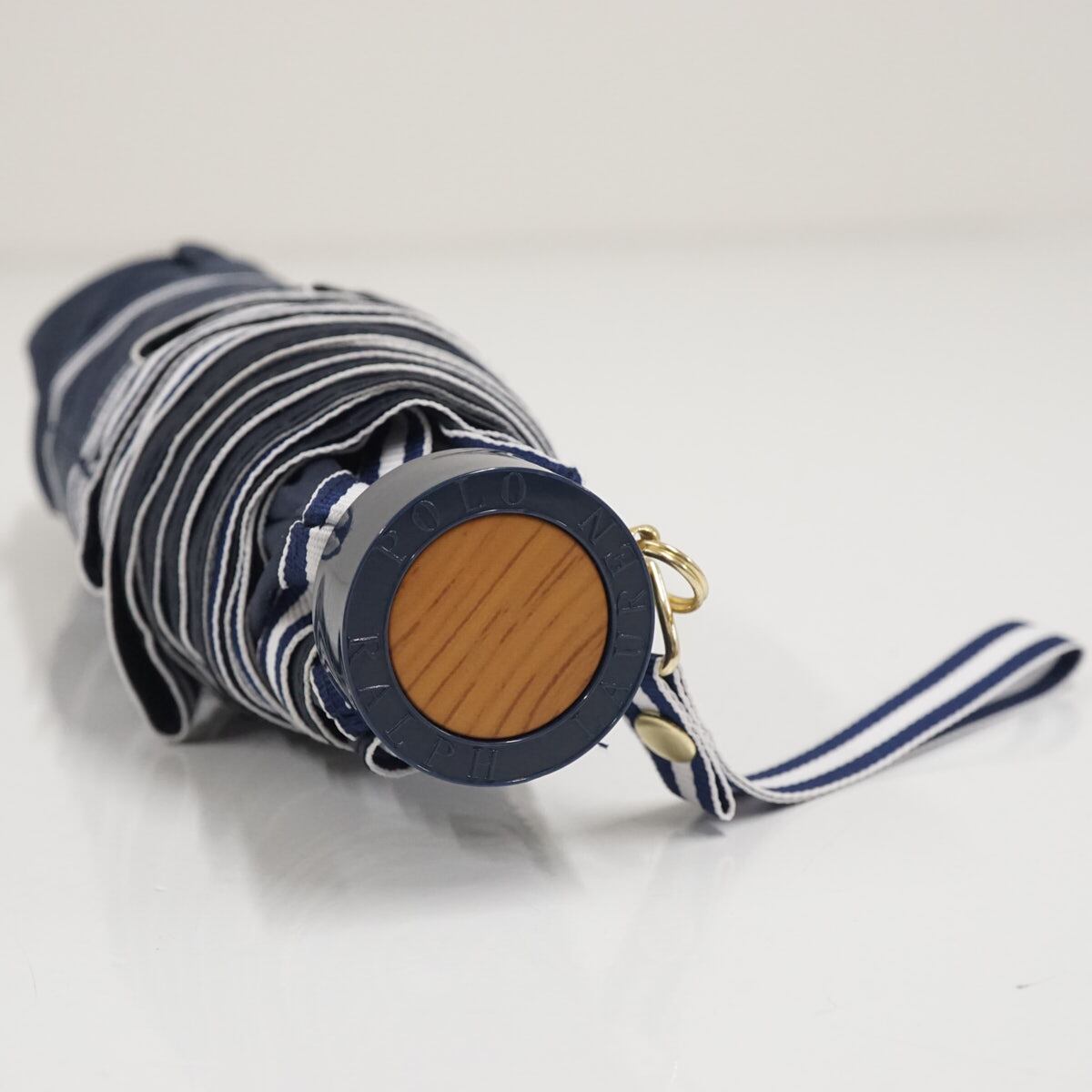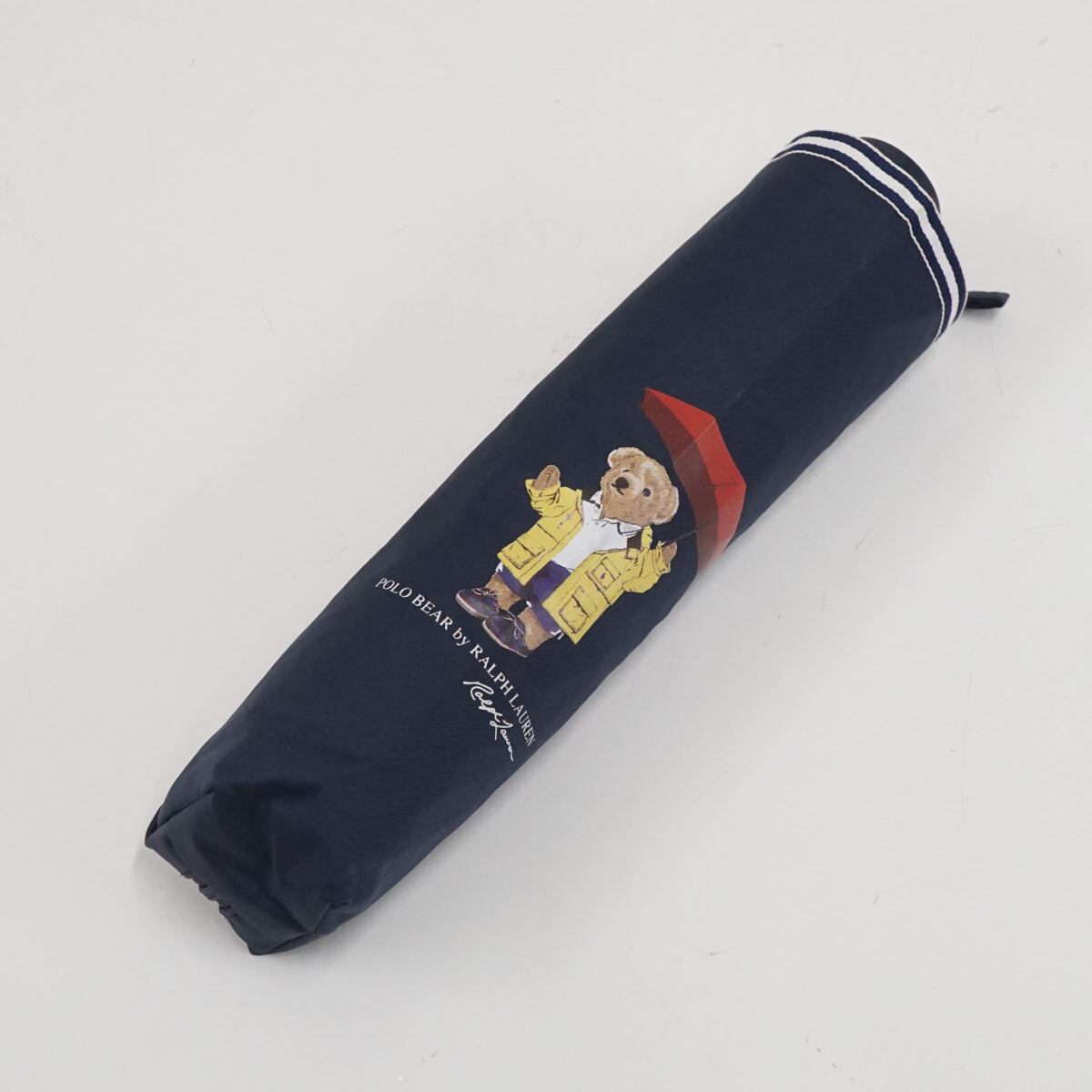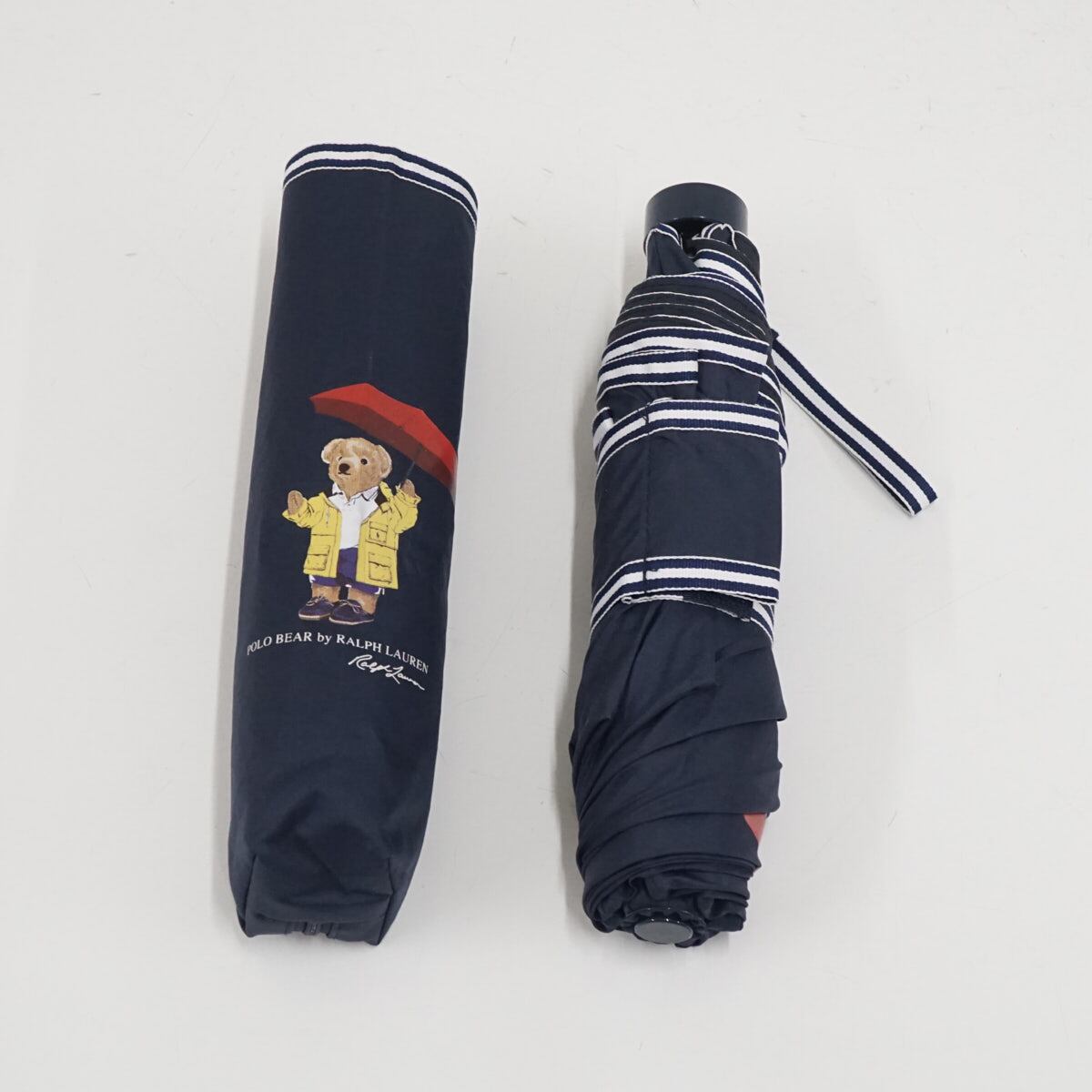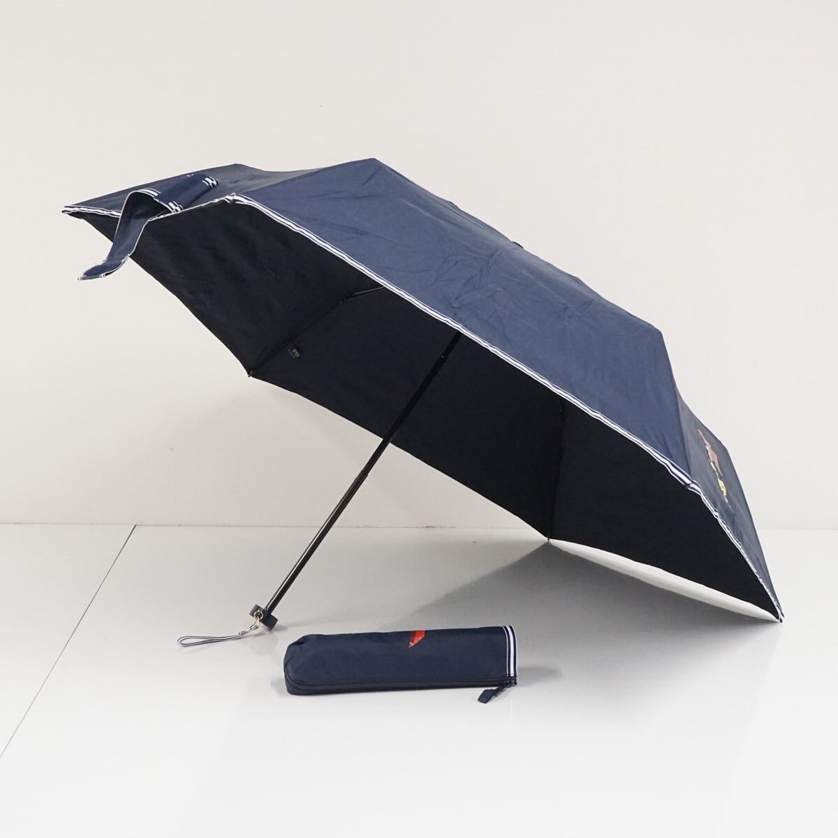 ネイビーの生地に、ポロベアのプリントとボーダーの縁取りが可愛らしい折りたたみパラソルです。