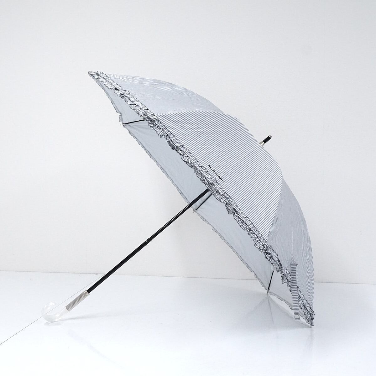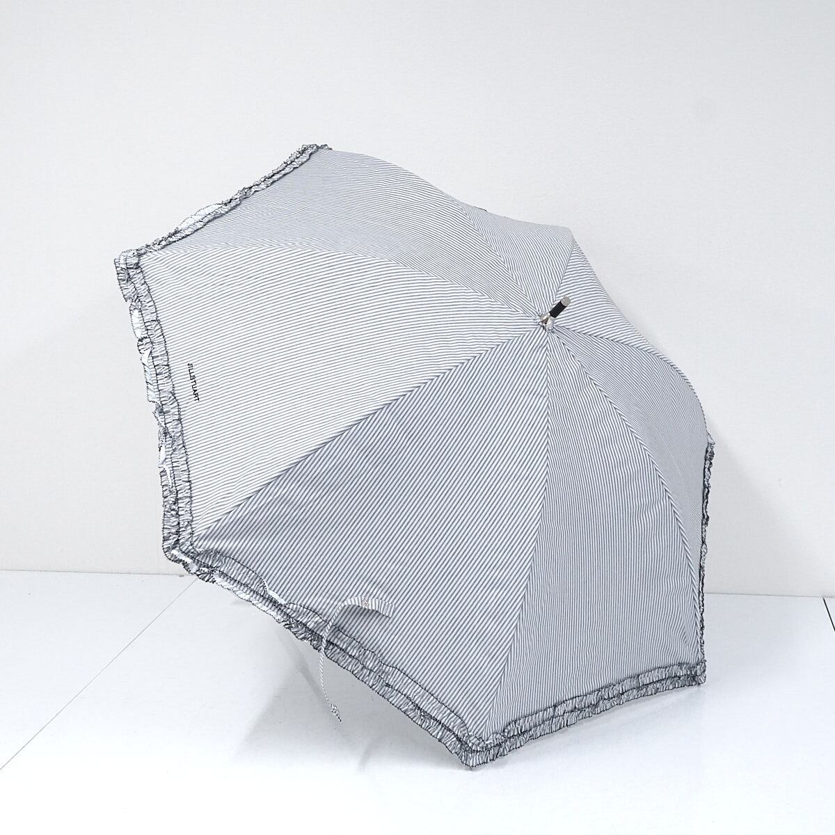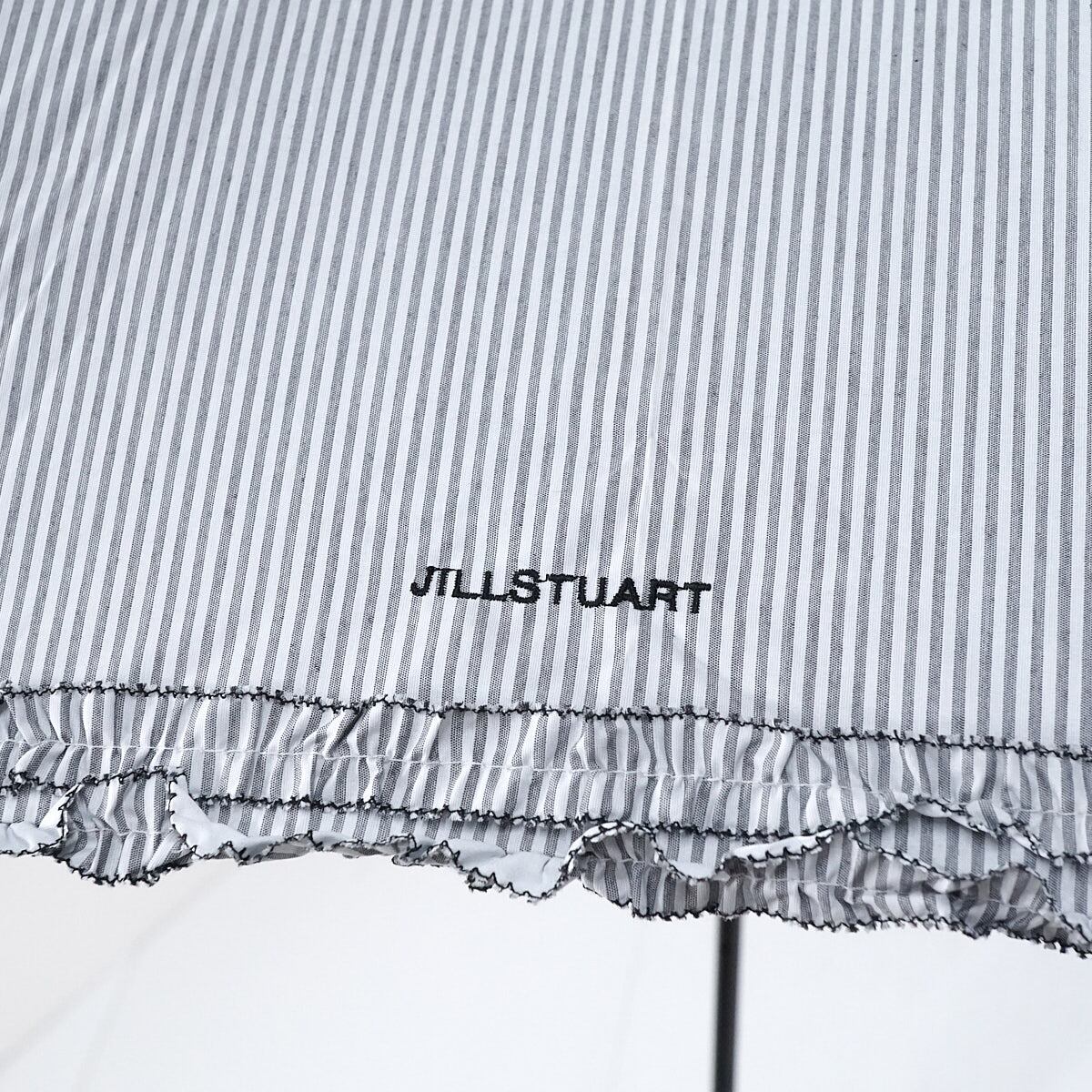 晴雨兼用日傘 JILL STUART ジルスチュアート USED美品 ストライプ 二段フリル グレー ロゴ刺繍 遮光 遮熱 UV グラス骨 50cm S2997