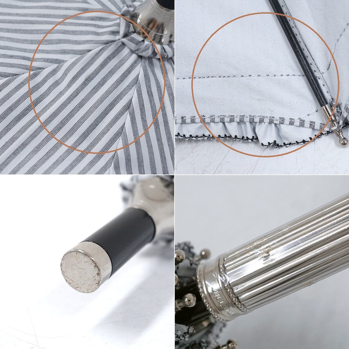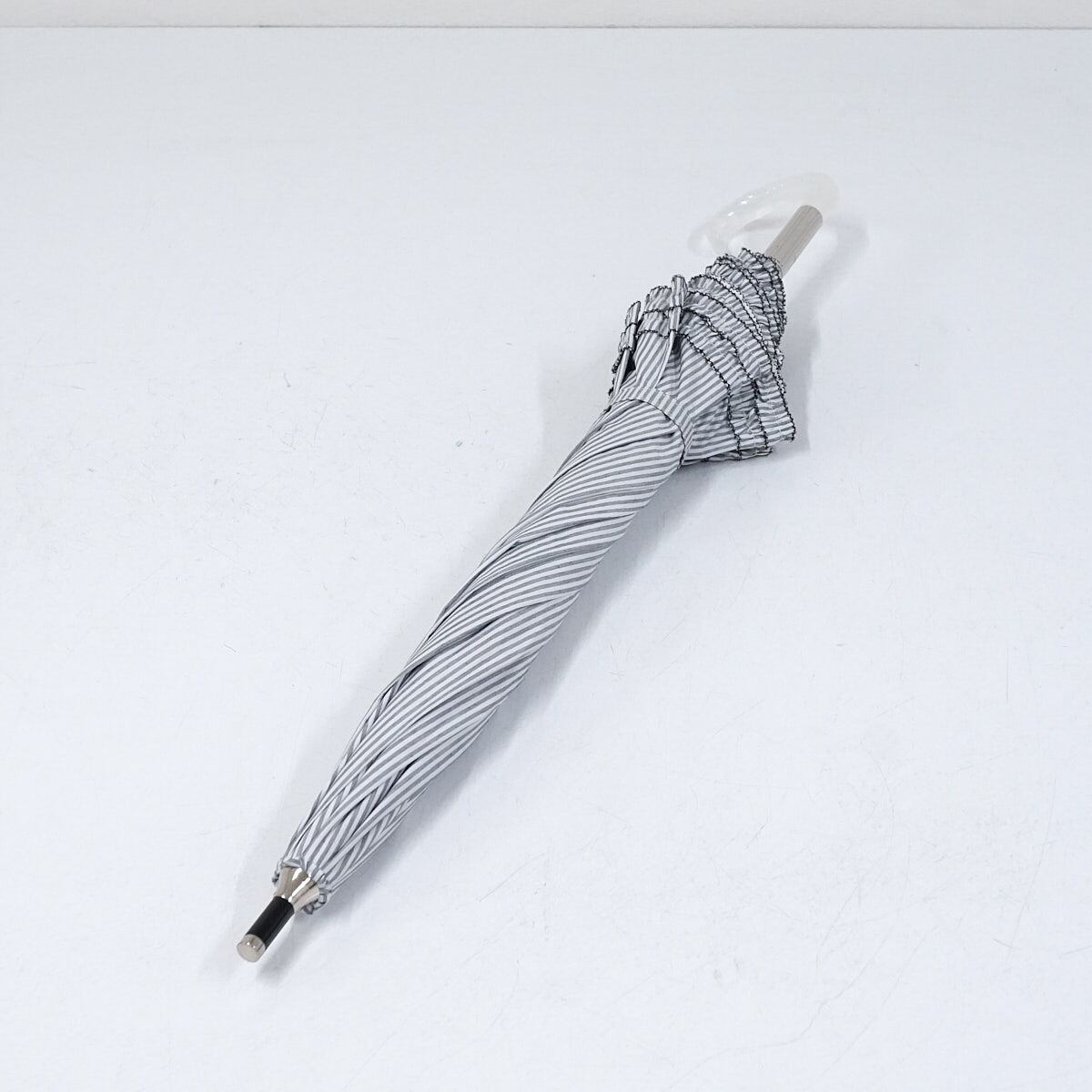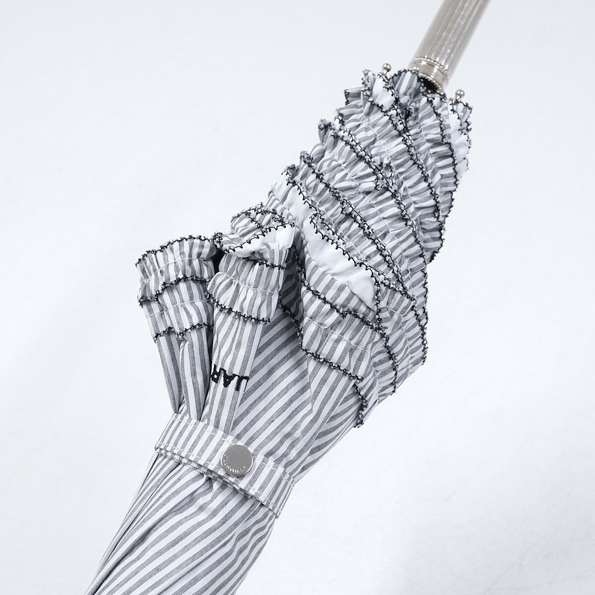 晴雨兼用日傘 JILL STUART ジルスチュアート USED美品 ストライプ 二段フリル グレー ロゴ刺繍 遮光 遮熱 UV グラス骨 50cm S2997