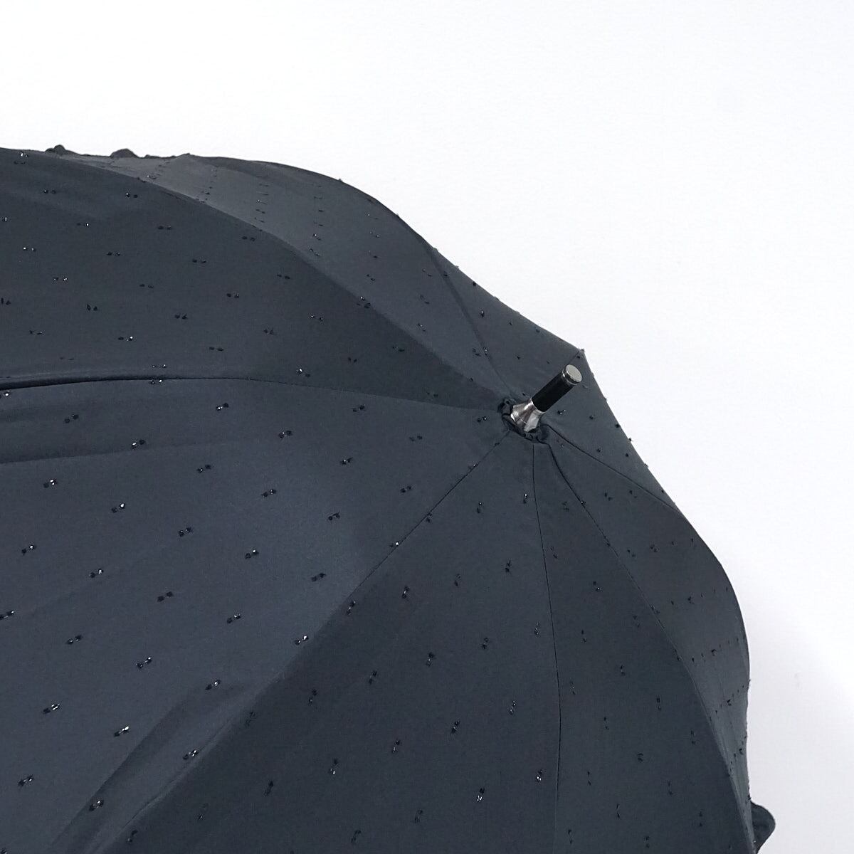 生地のカラーはブラックで、ラメ糸を使用したドットと外周のフリルが可愛らしい逸品です。