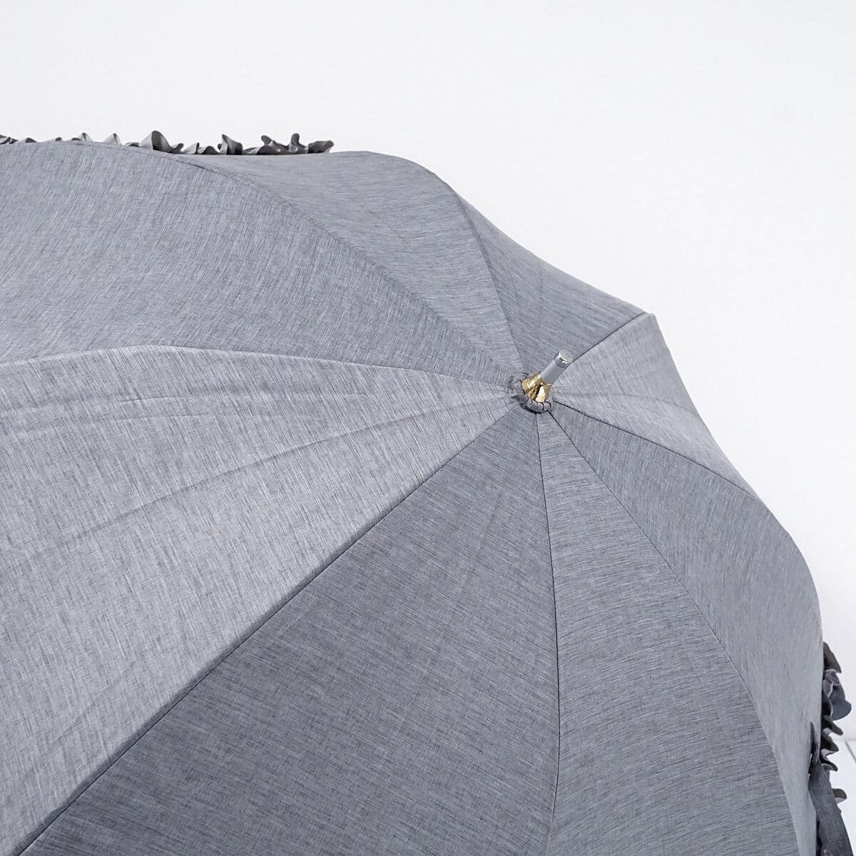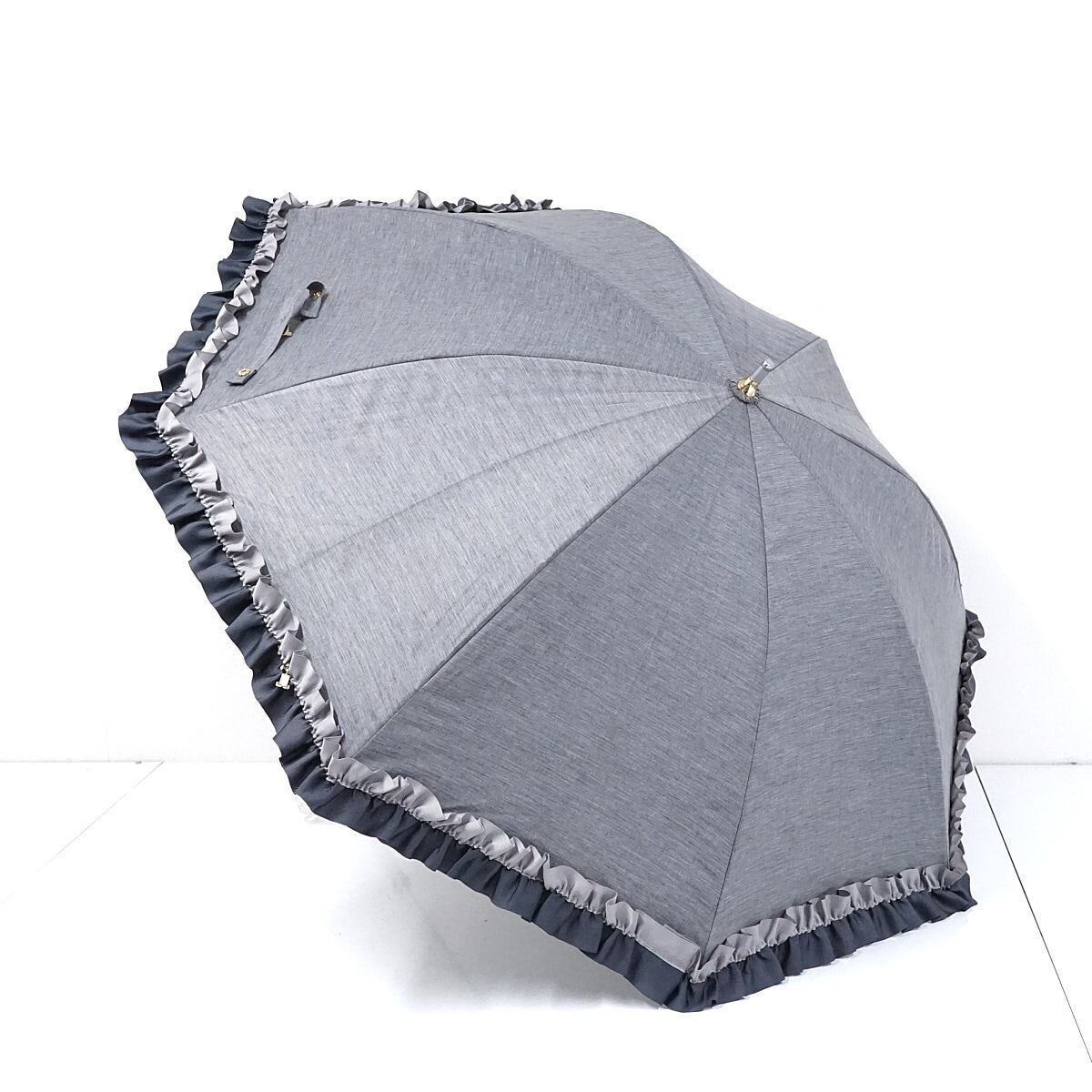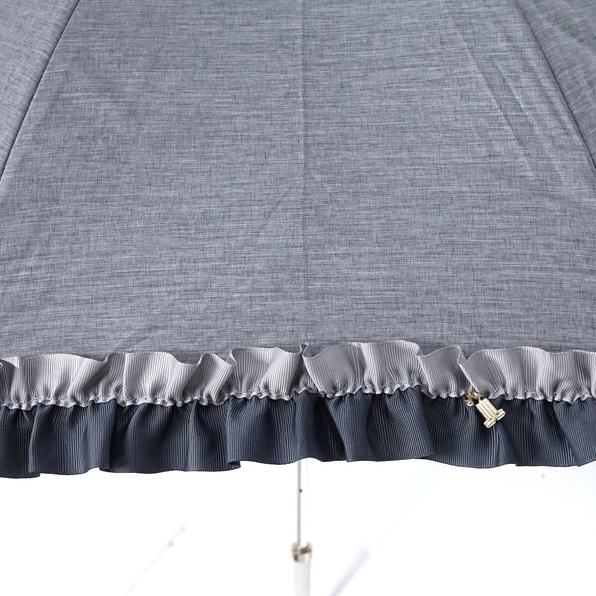 落ち着いたカラーリングと、印象的なグログランフリルが甘いアクセントとなったパラソルです。
