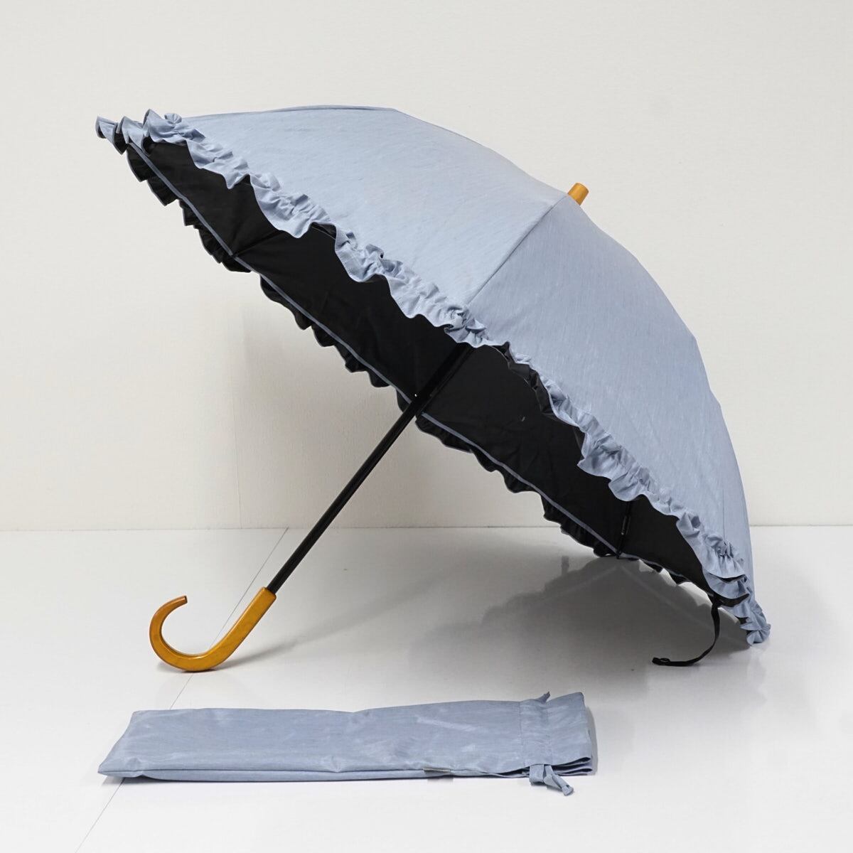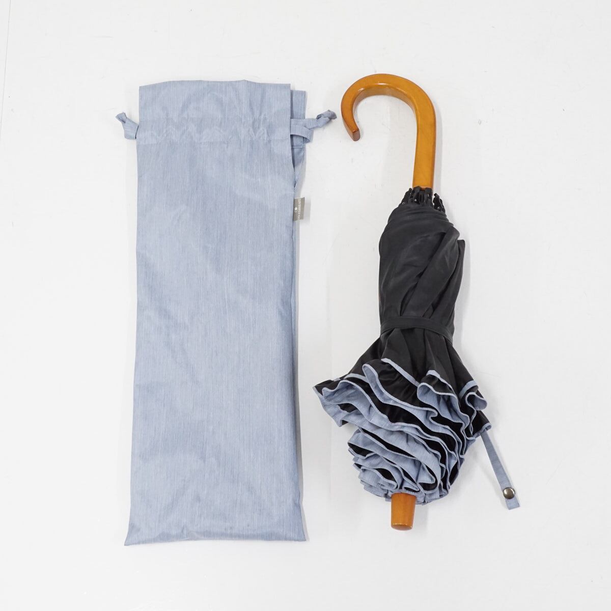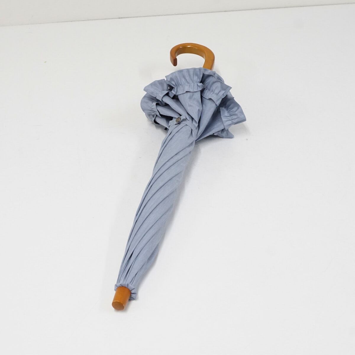 サンバリア100 完全遮光折日傘 USED品 2段 フリル フロストブルー 折りたたみ傘 UV 遮熱 50cm FS9485