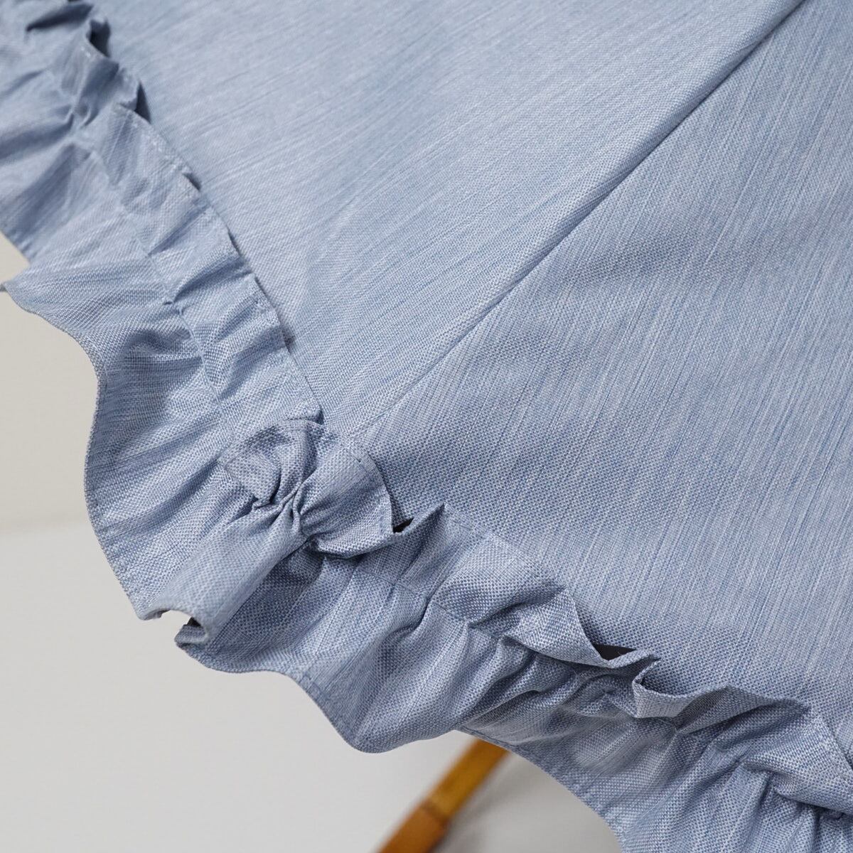 フロストブルー(シャンブレー)生地の外周にフリルをあしらったフェミニンなデザインです。