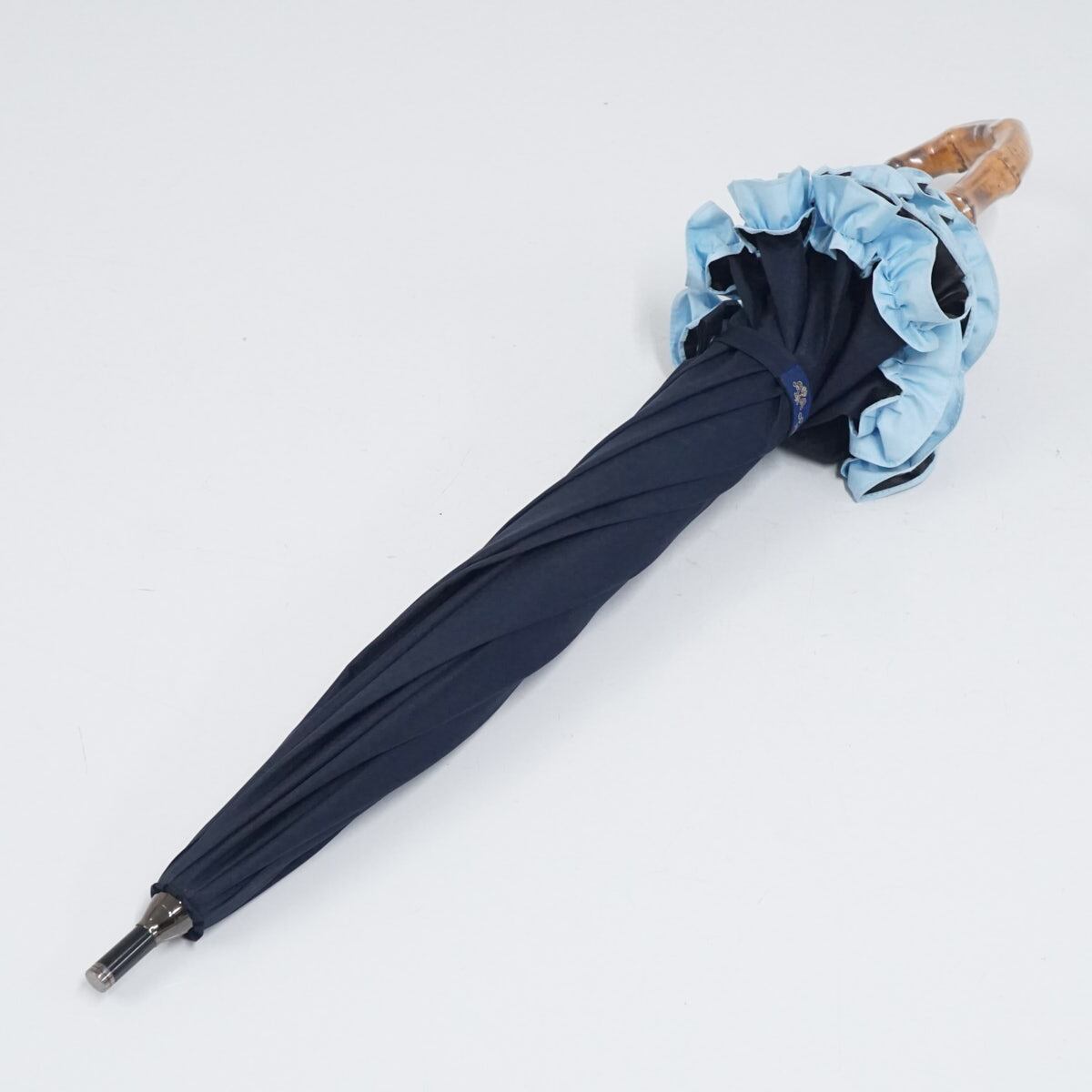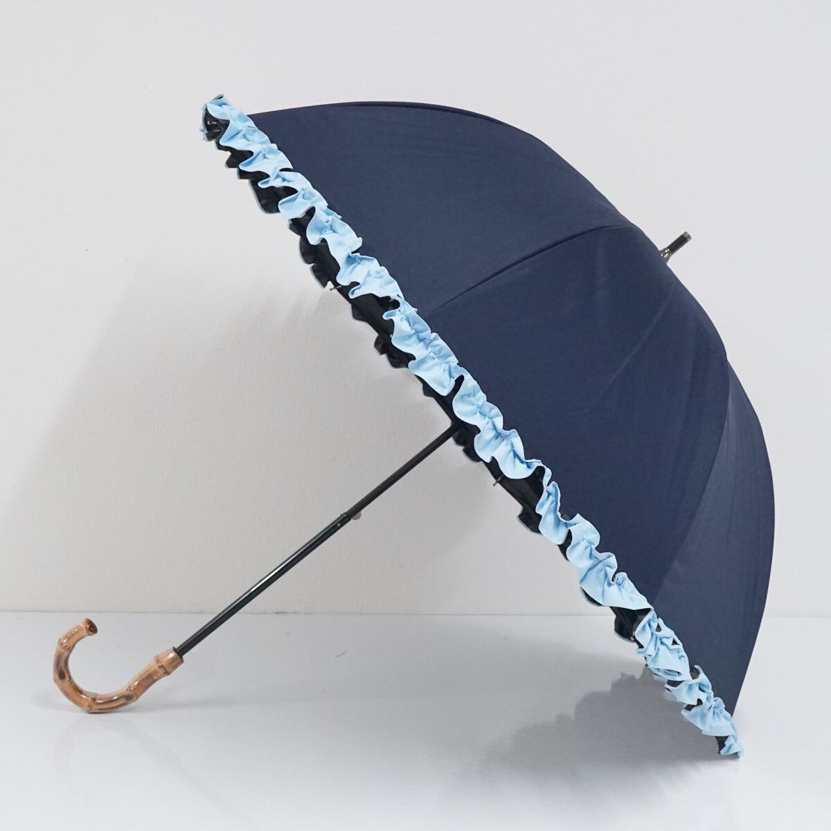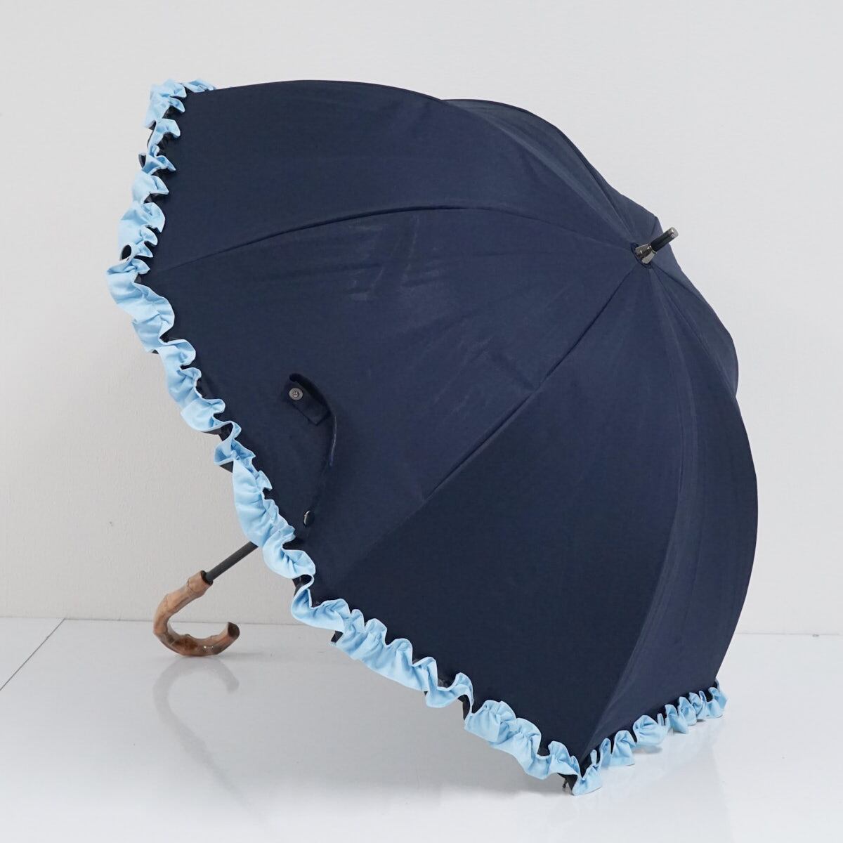 芦屋ロサブラン 完全遮光日傘 USED美品 ショートサイズ シングル フリル ネイビー ライトブルー 遮光 遮熱 UV 50cm S3032