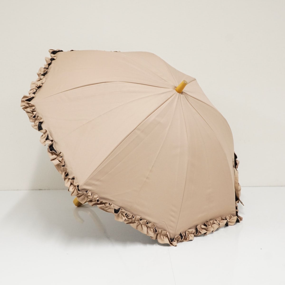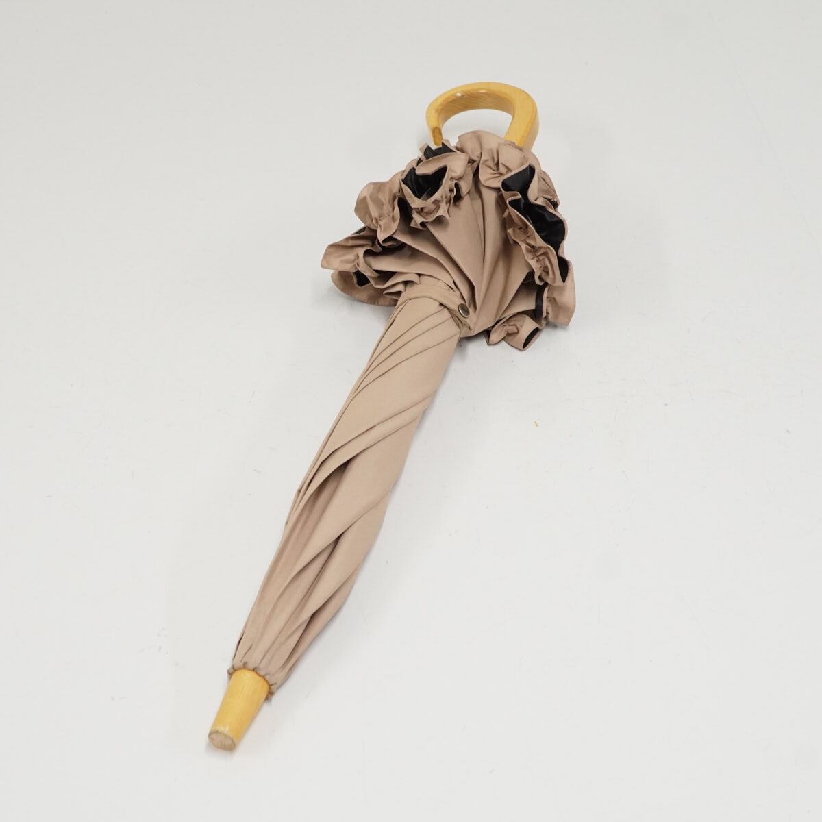 ピンクベージュの無地生地にフリルをあしらった可愛らしく上品なデザインです。