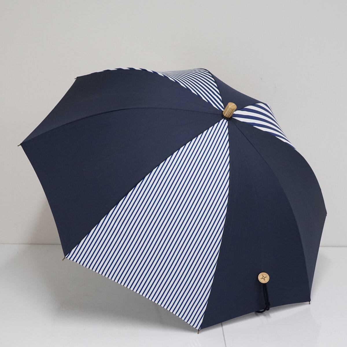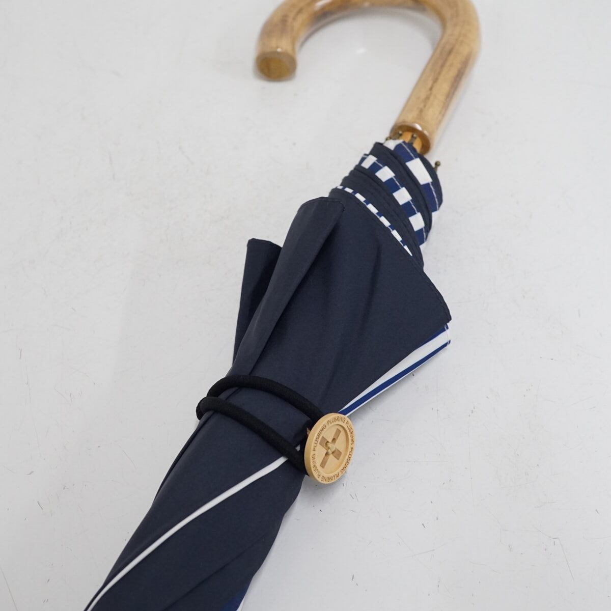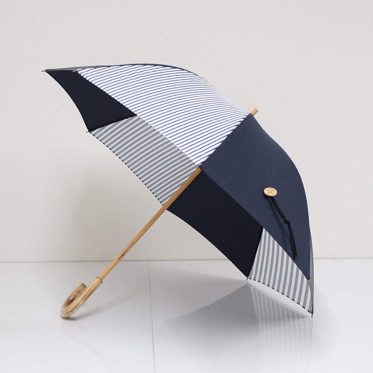 傘 +RING プラスリング USED美品 ブルー ネイビー ストライプ パッチワーク ショートサイズ 晴雨兼用 木製手元 52cm A3030