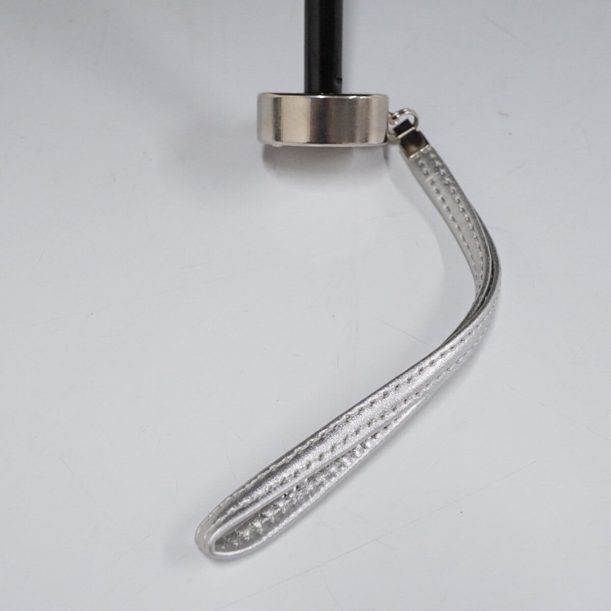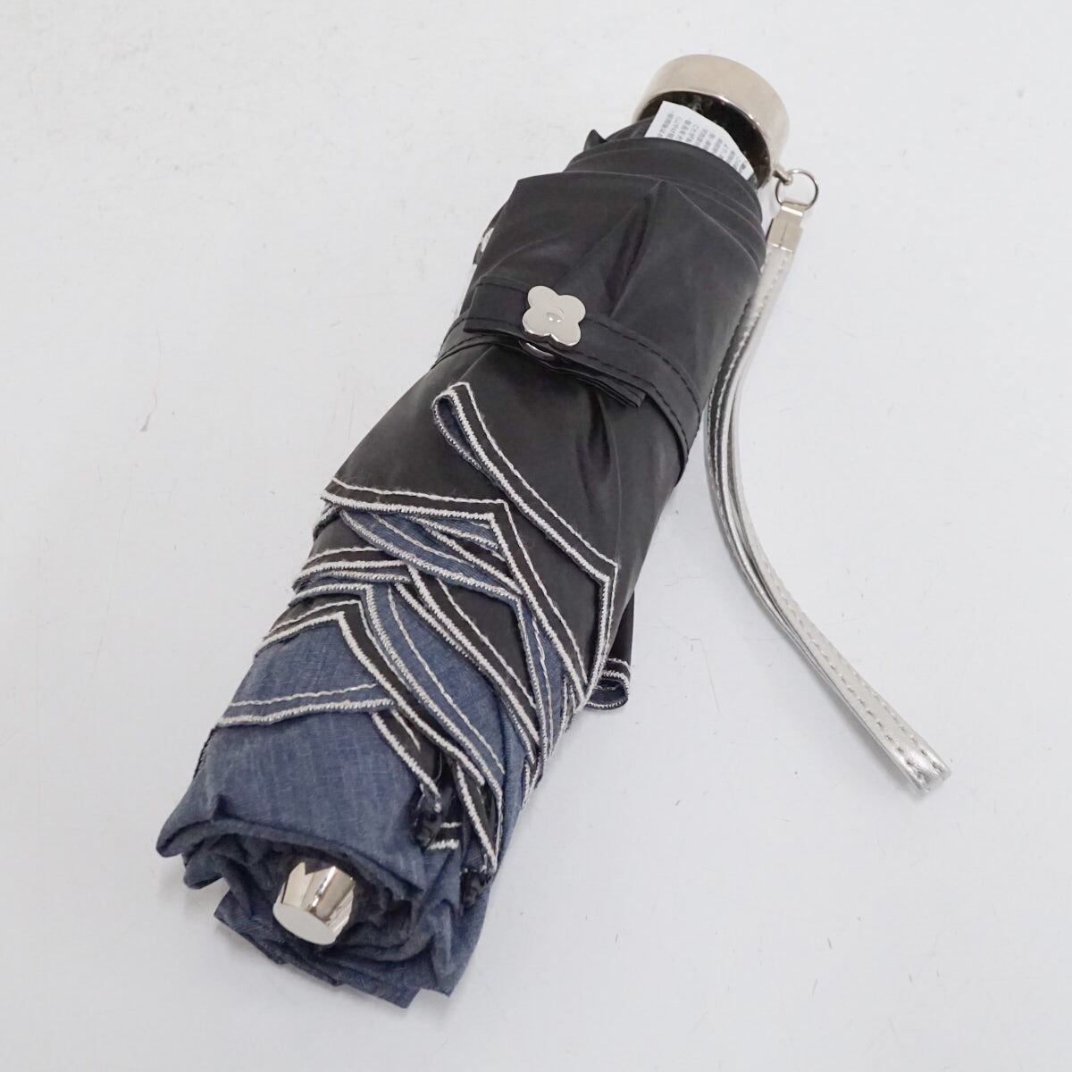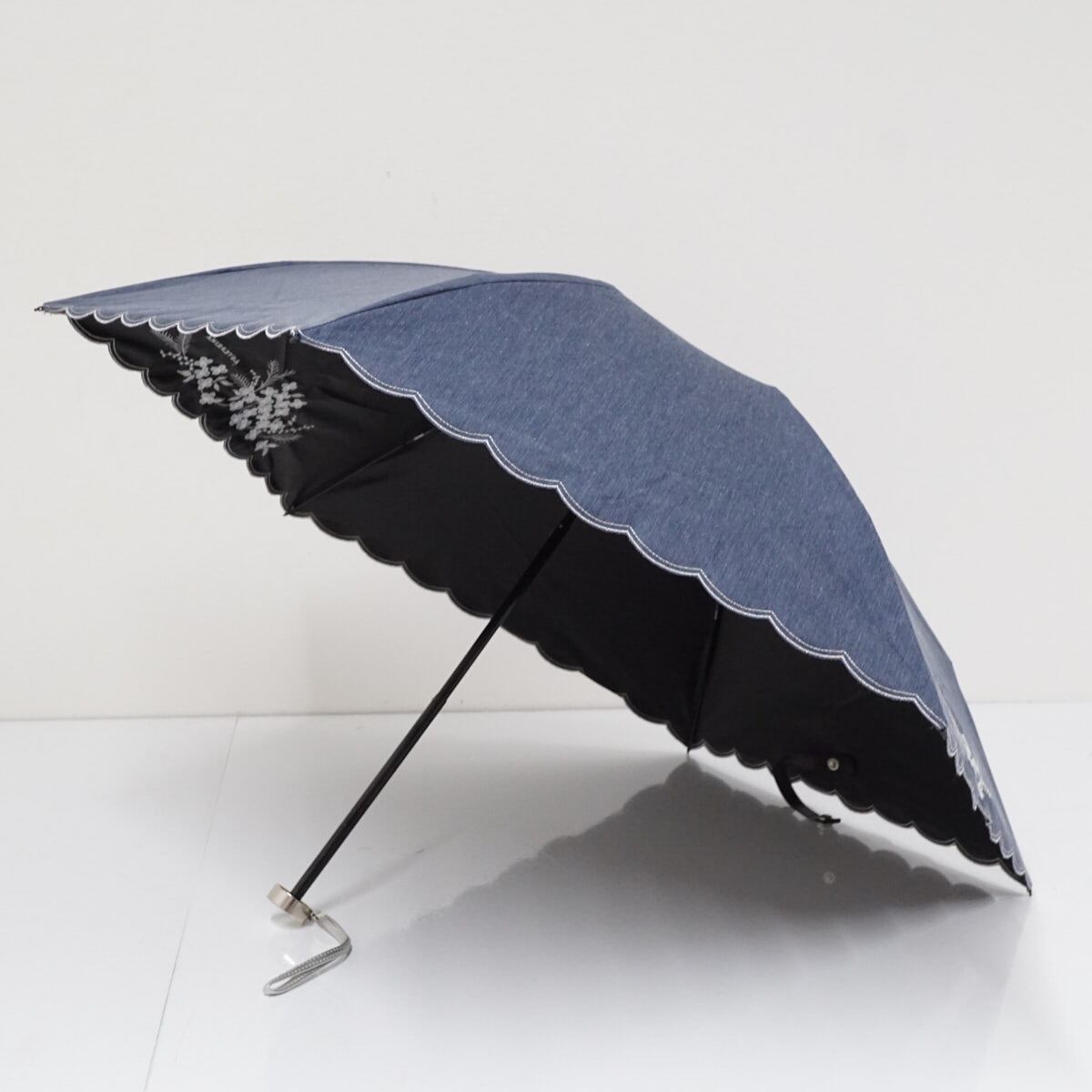 デニムブルー色の生地に、ホワイト・シルバーの糸で刺繍を施した折りたたみパラソルです。