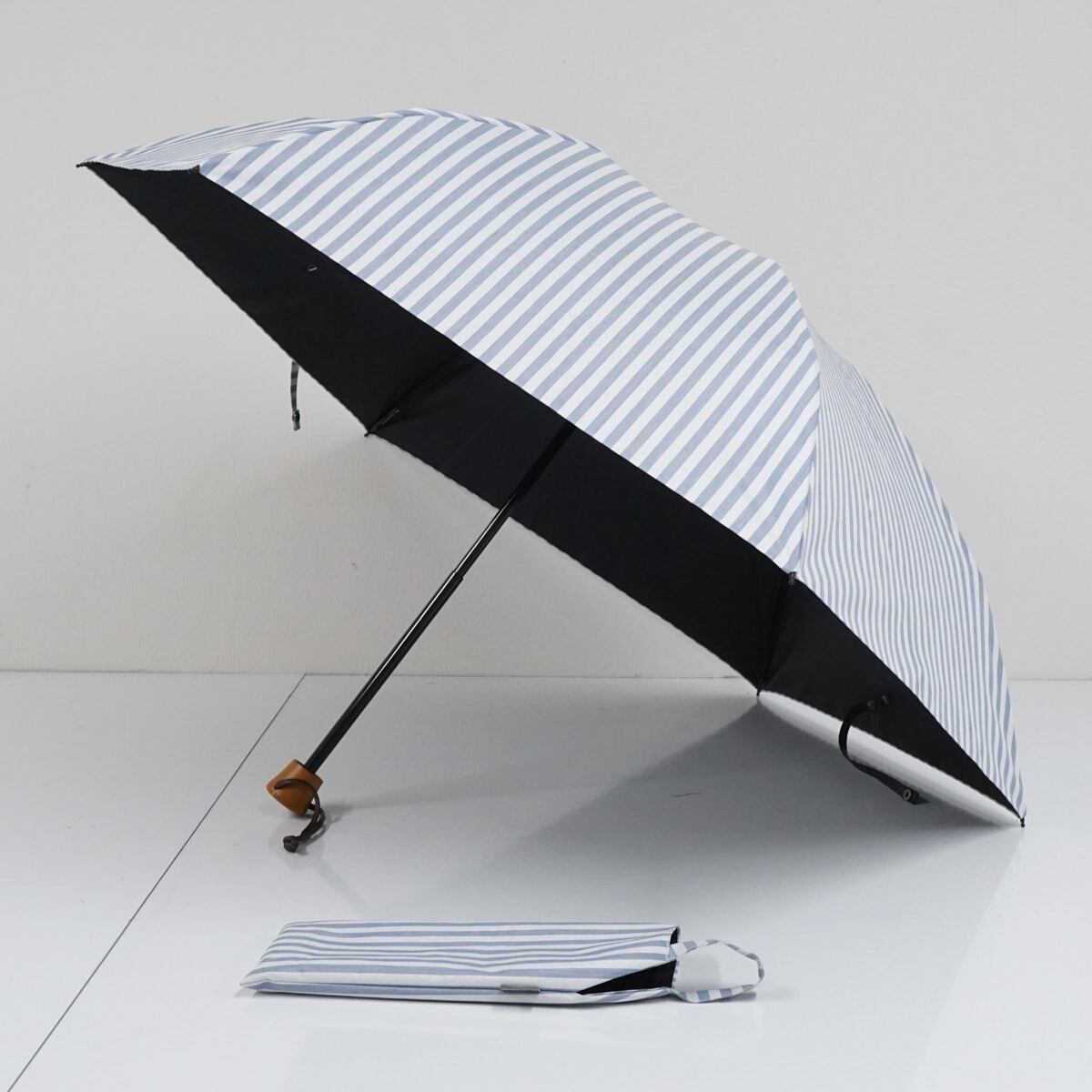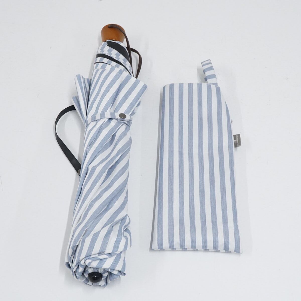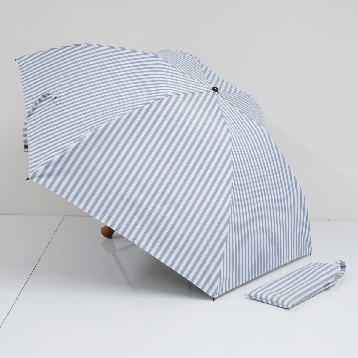 サンバリア100 完全遮光折日傘 USED美品 3段折 ストライプ ブルー 折りたたみ 日傘 UVカット 遮熱 55cm FS9236