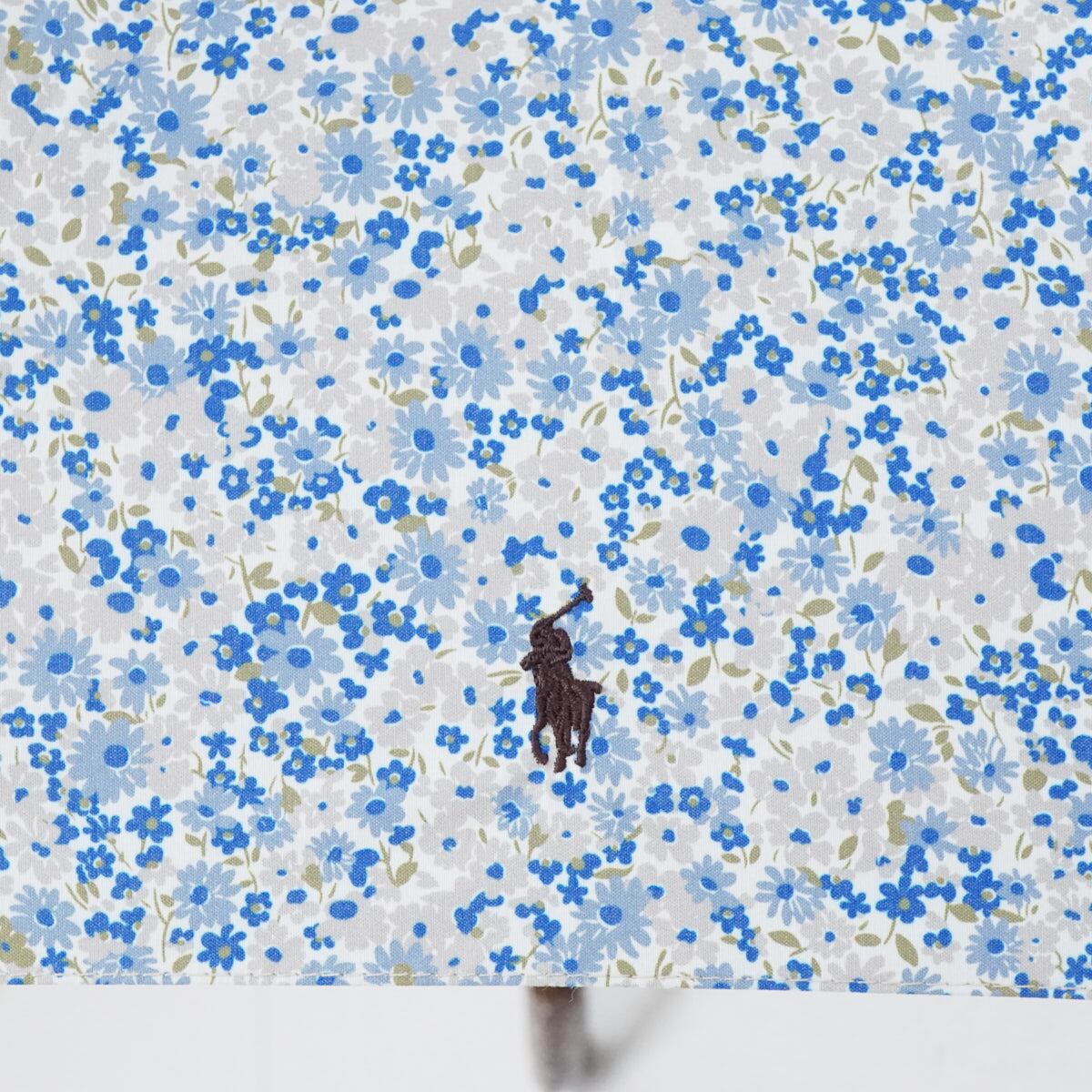 ブルー系の小花柄がフェミニンなデザインで、ワンポイントでポロ刺繍を入れています。