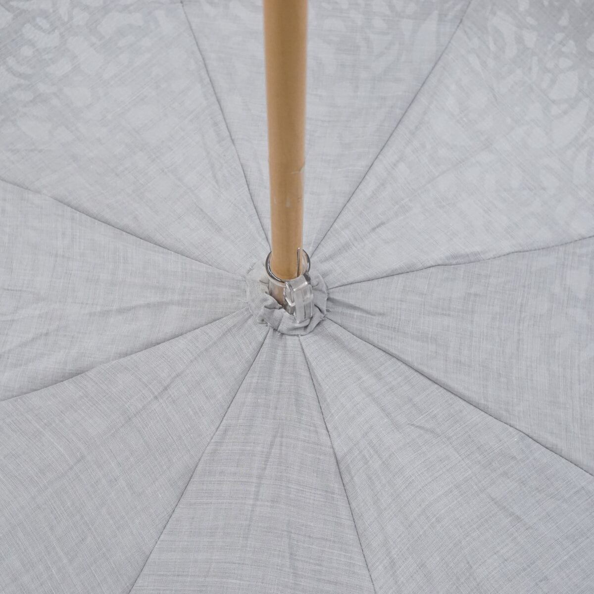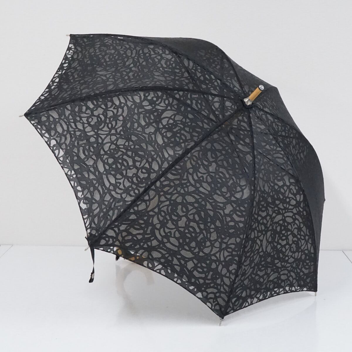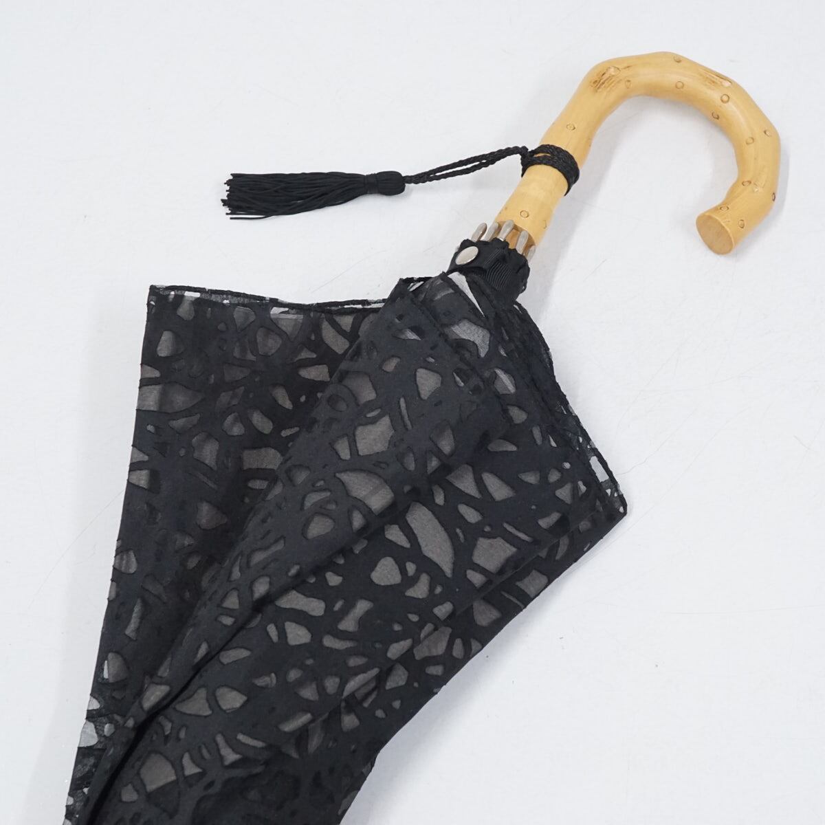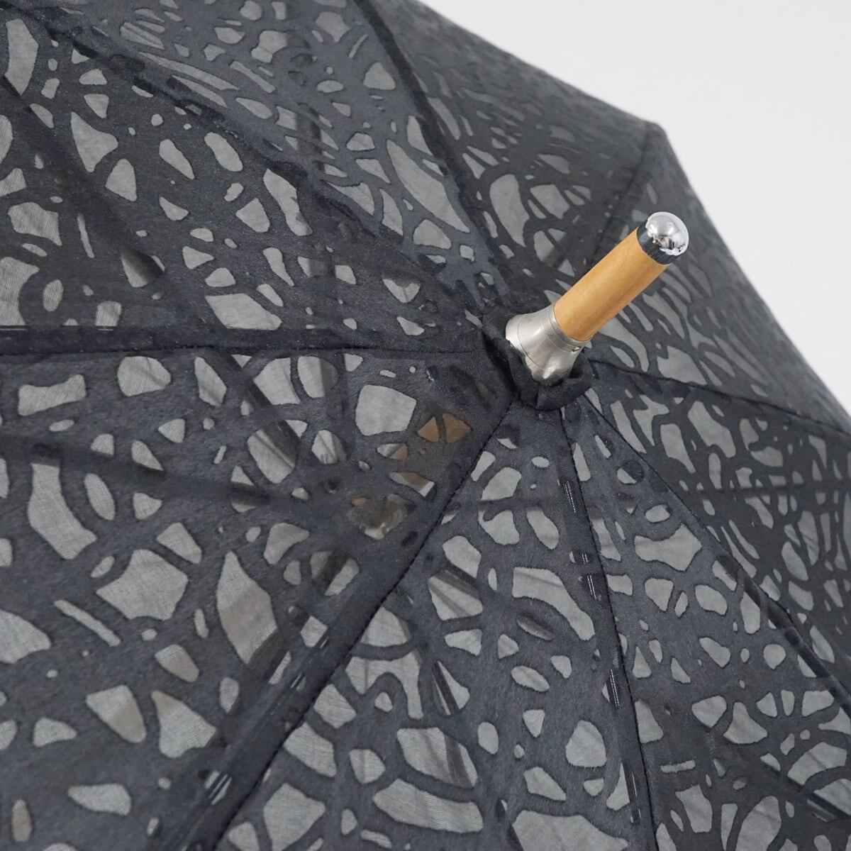 透け感のあるブラックの生地に内側はグレーのかわず張りデザインのパラソルです。