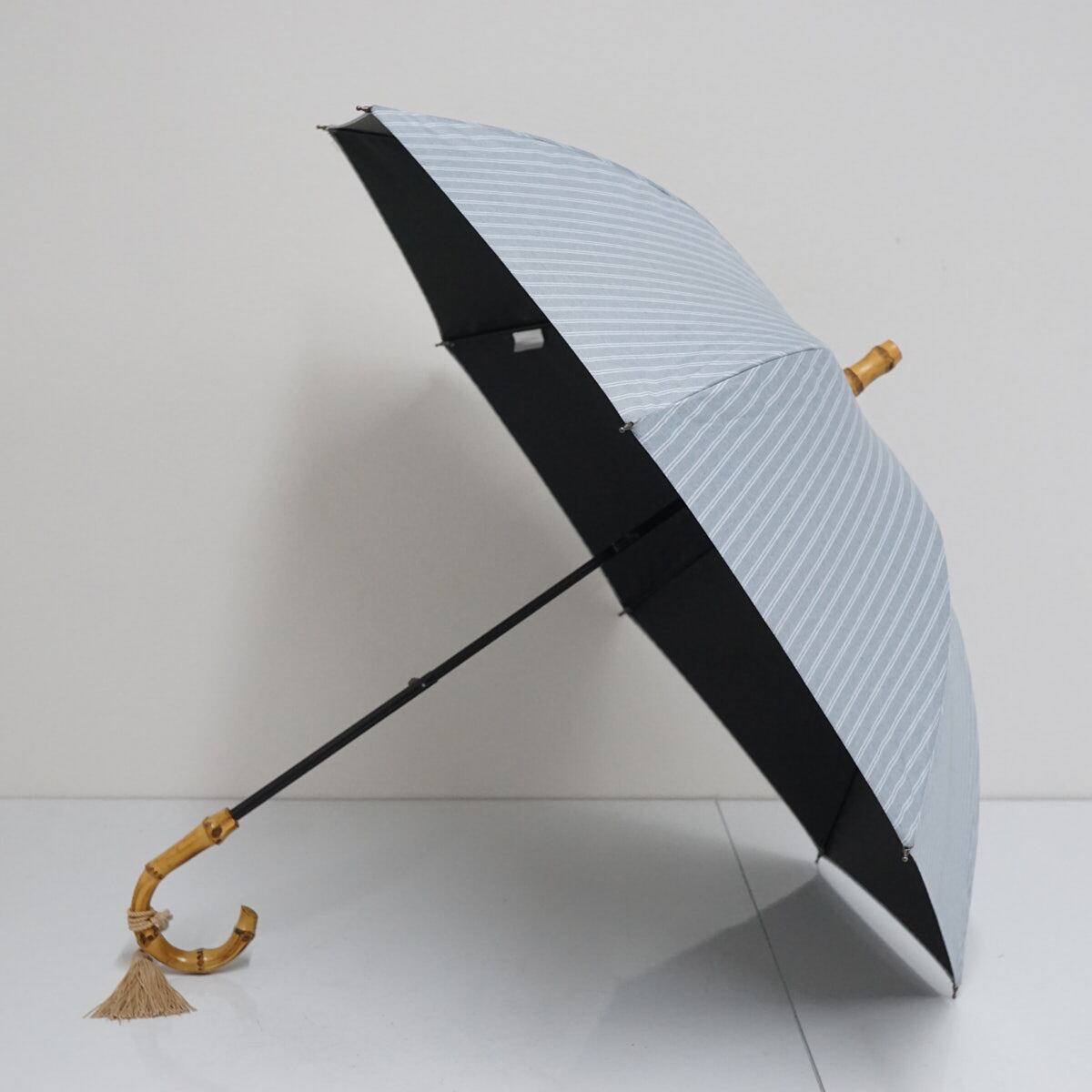 晴雨兼用日傘 utatane ウタタネ USED美品 一級遮光 ストライプブルー バンブーハンドル タッセル付 グラス骨 UV 47cm S3086