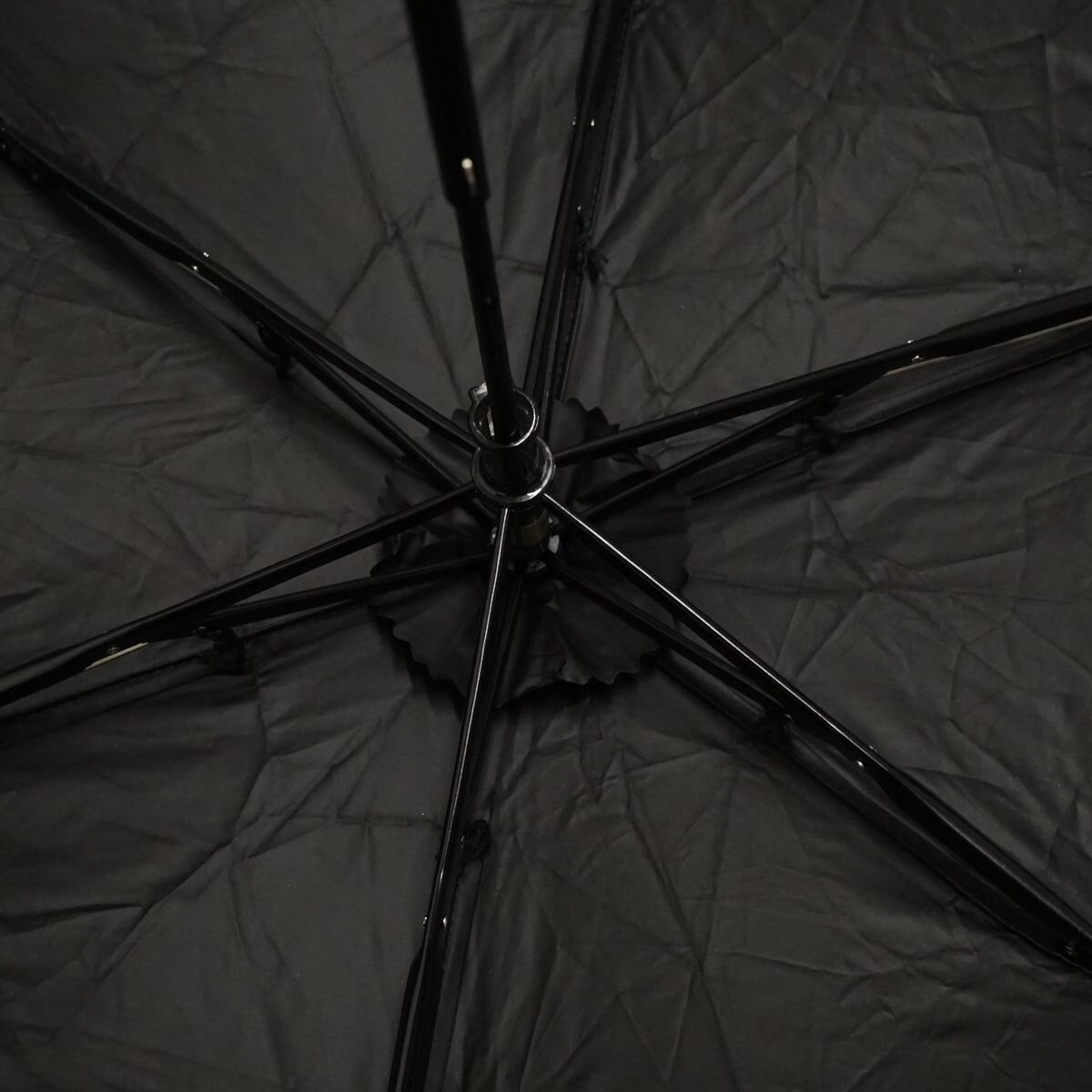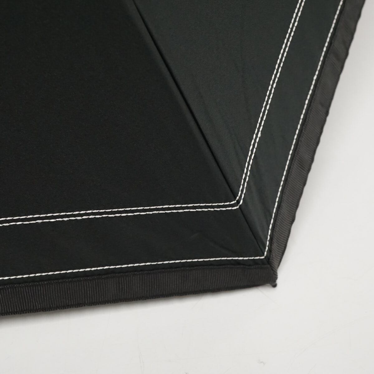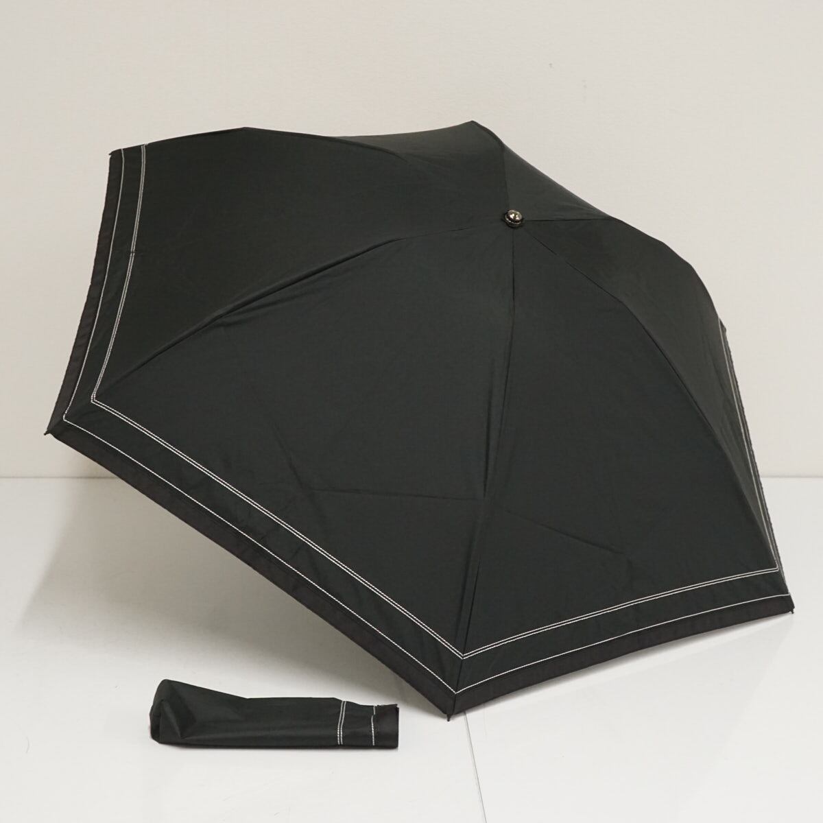ブラックの生地にホワイトの糸でラインを入れた、シンプルな折りたたみパラソルです。