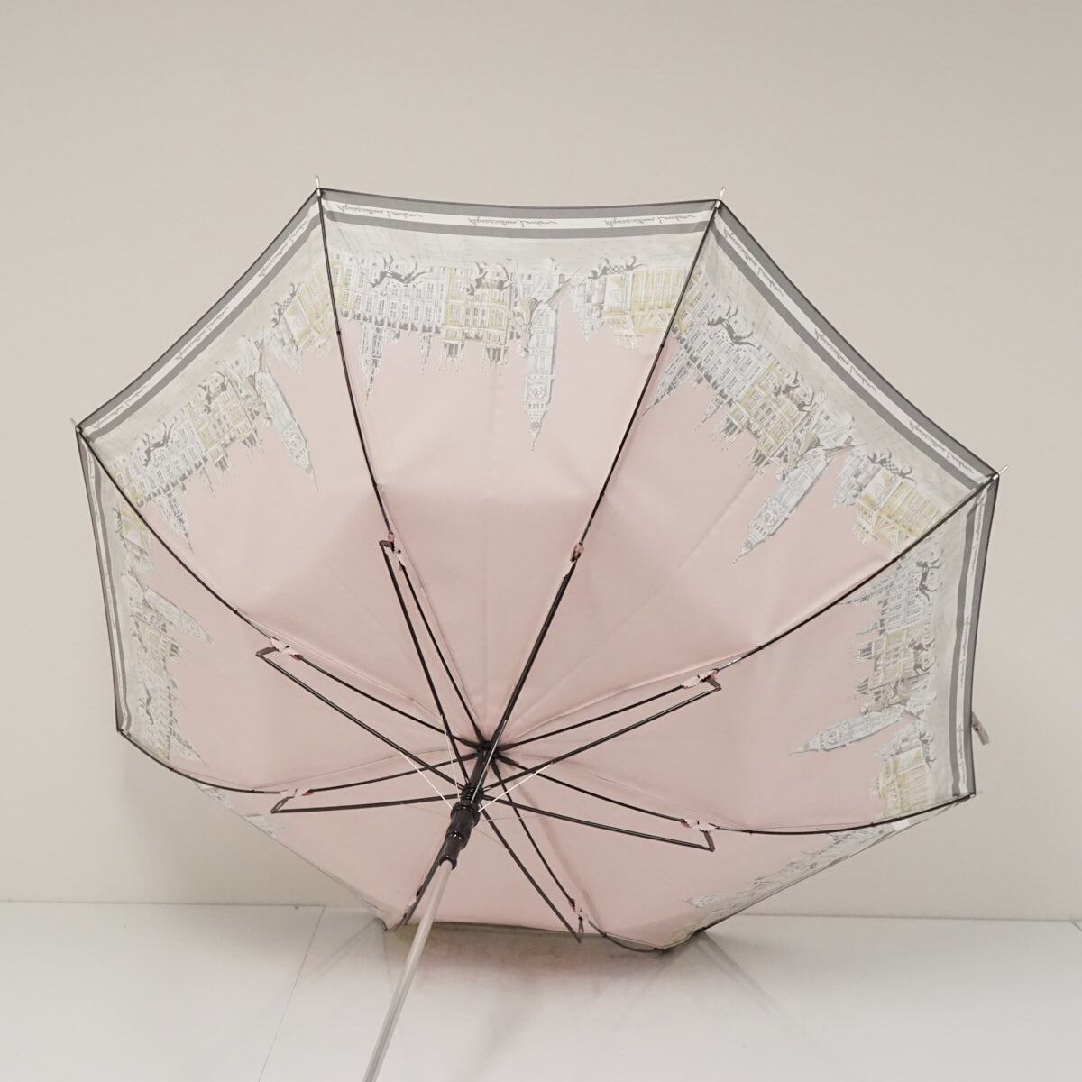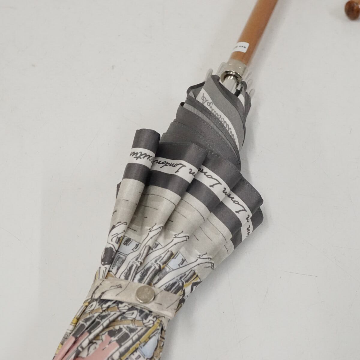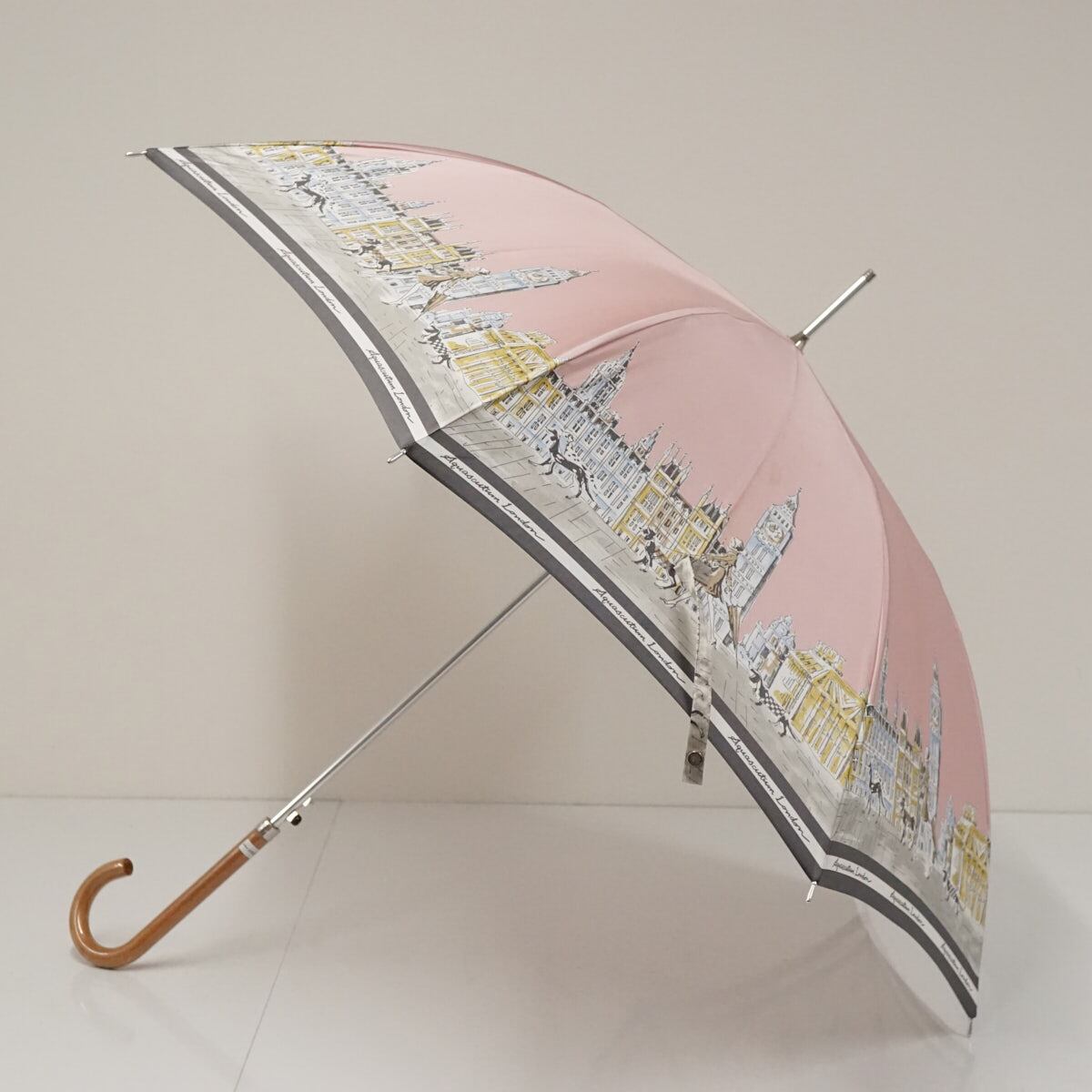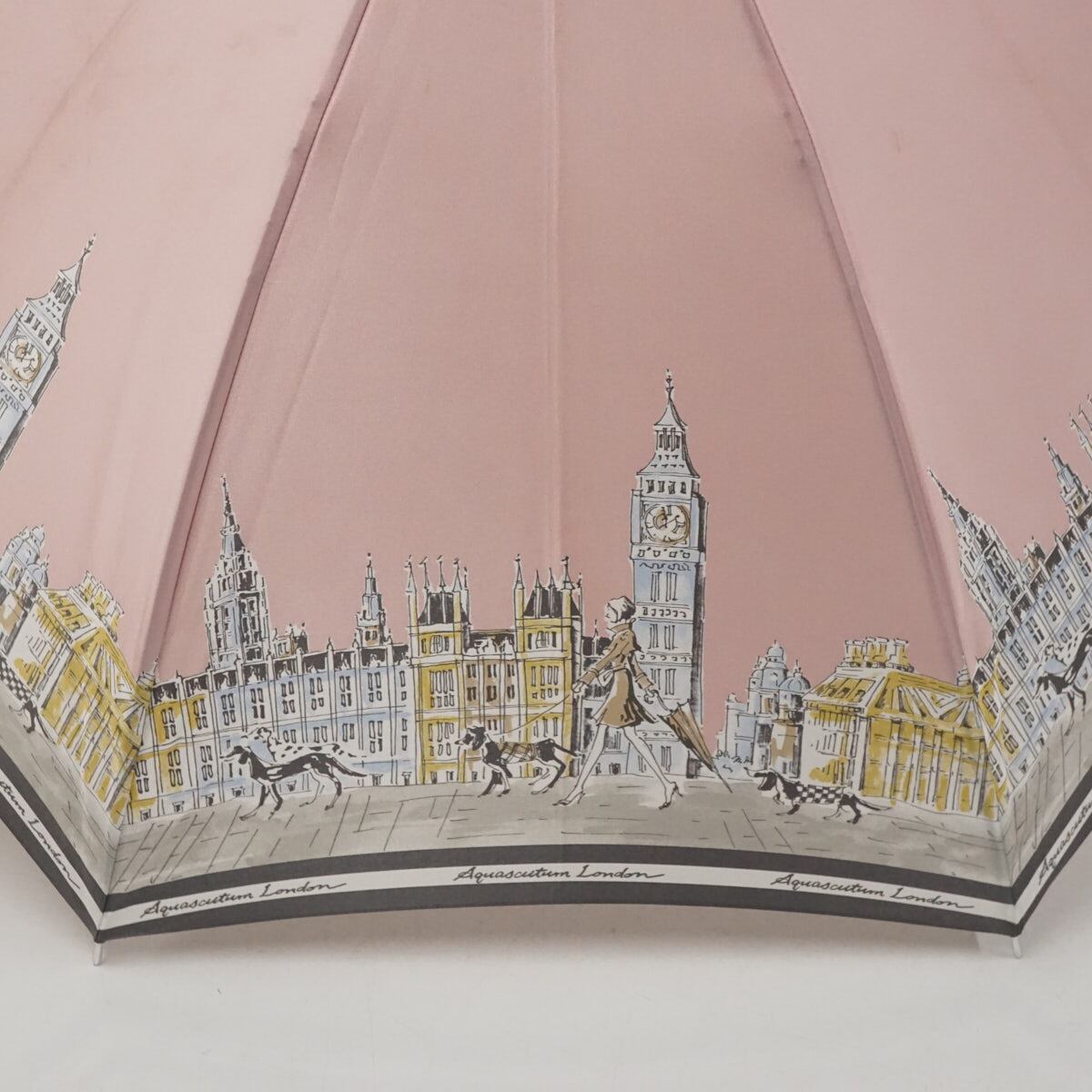 耐風傘 Aquascutum アクアスキュータム USED品 街並み 女性 犬 イラスト ジャンプ グラス骨 日本製 ピンク 60cm A3092