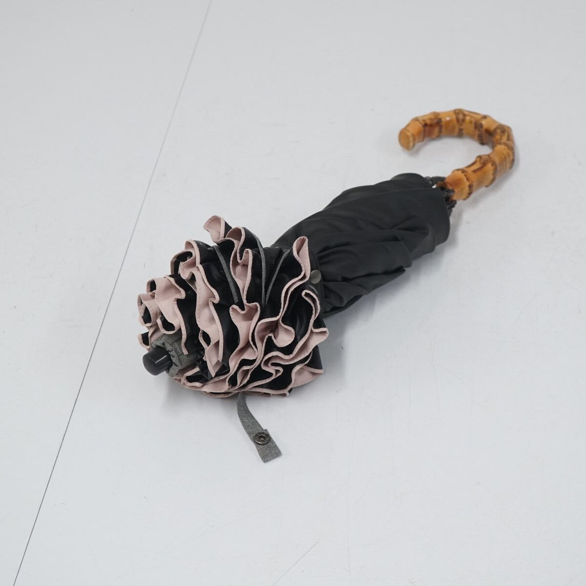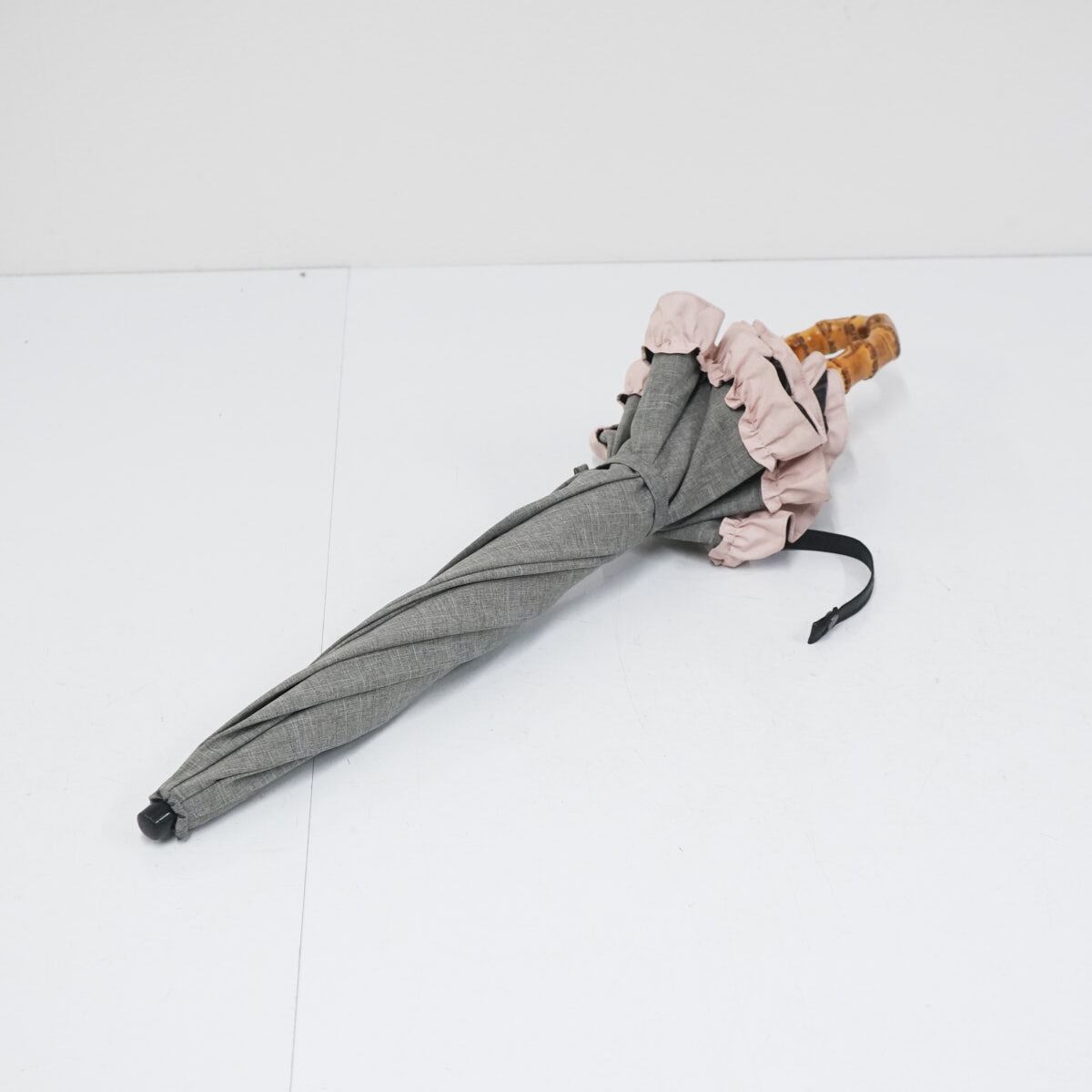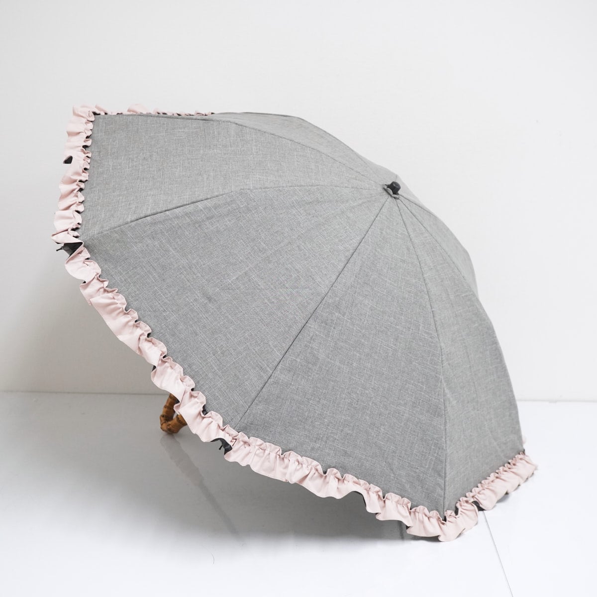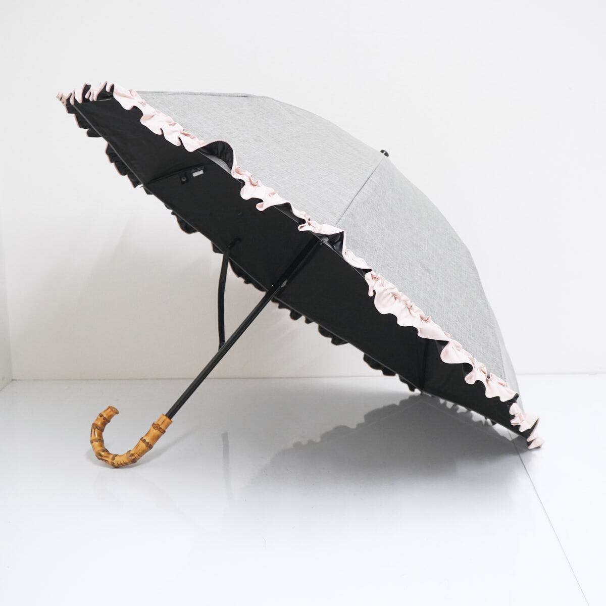 折りたたみ 日傘 完全遮光 芦屋ロサブラン USED美品 2段折 フリル ダンガリーグレー×ピンク 寒竹手元 UV 遮熱 50cm FS9293