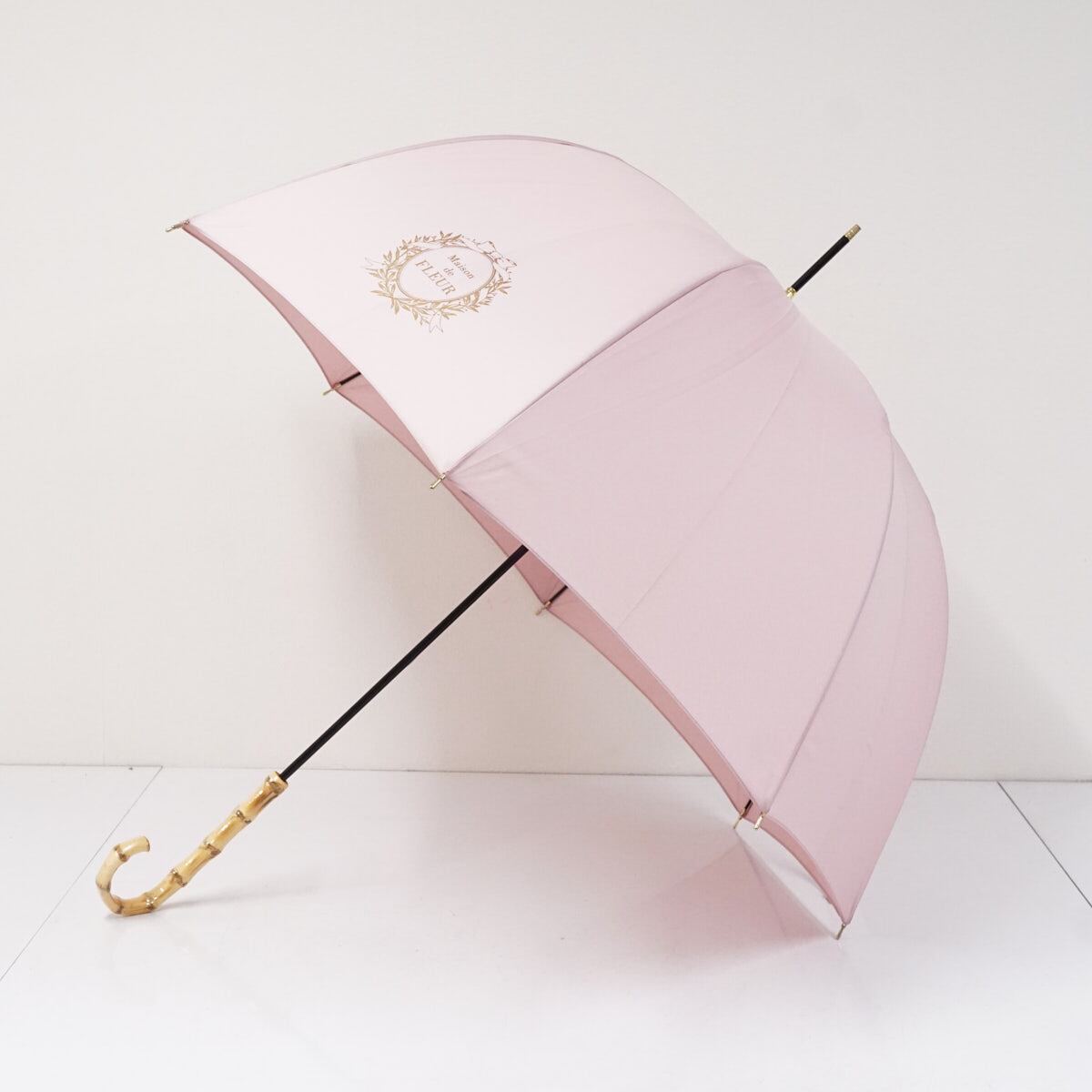 ライトピンクの生地に「Maison de FLEUR」のロゴプリントがエレガントに映えるアンブレラです。