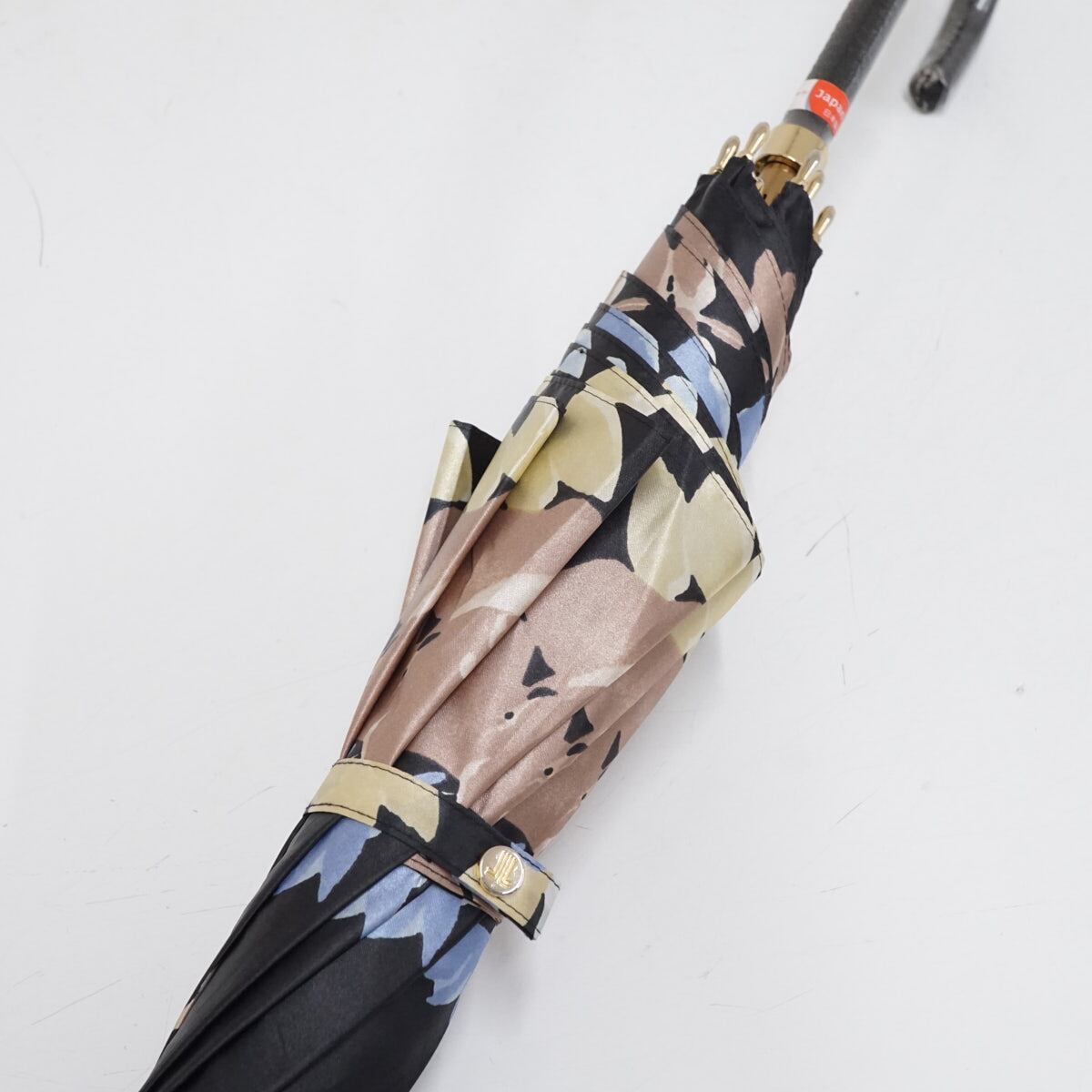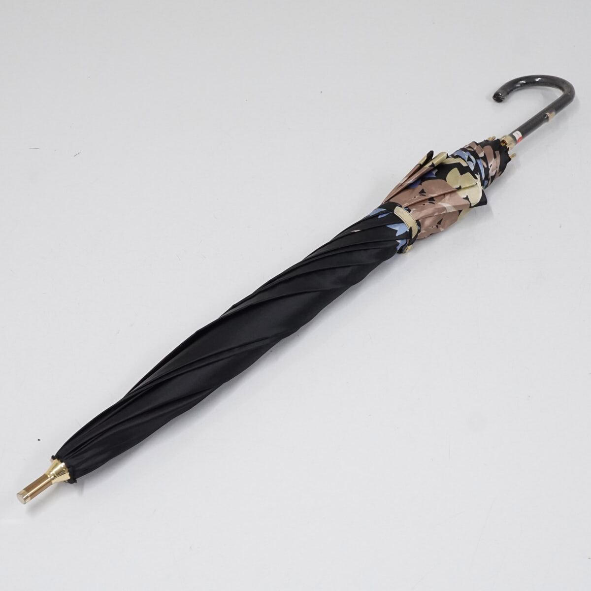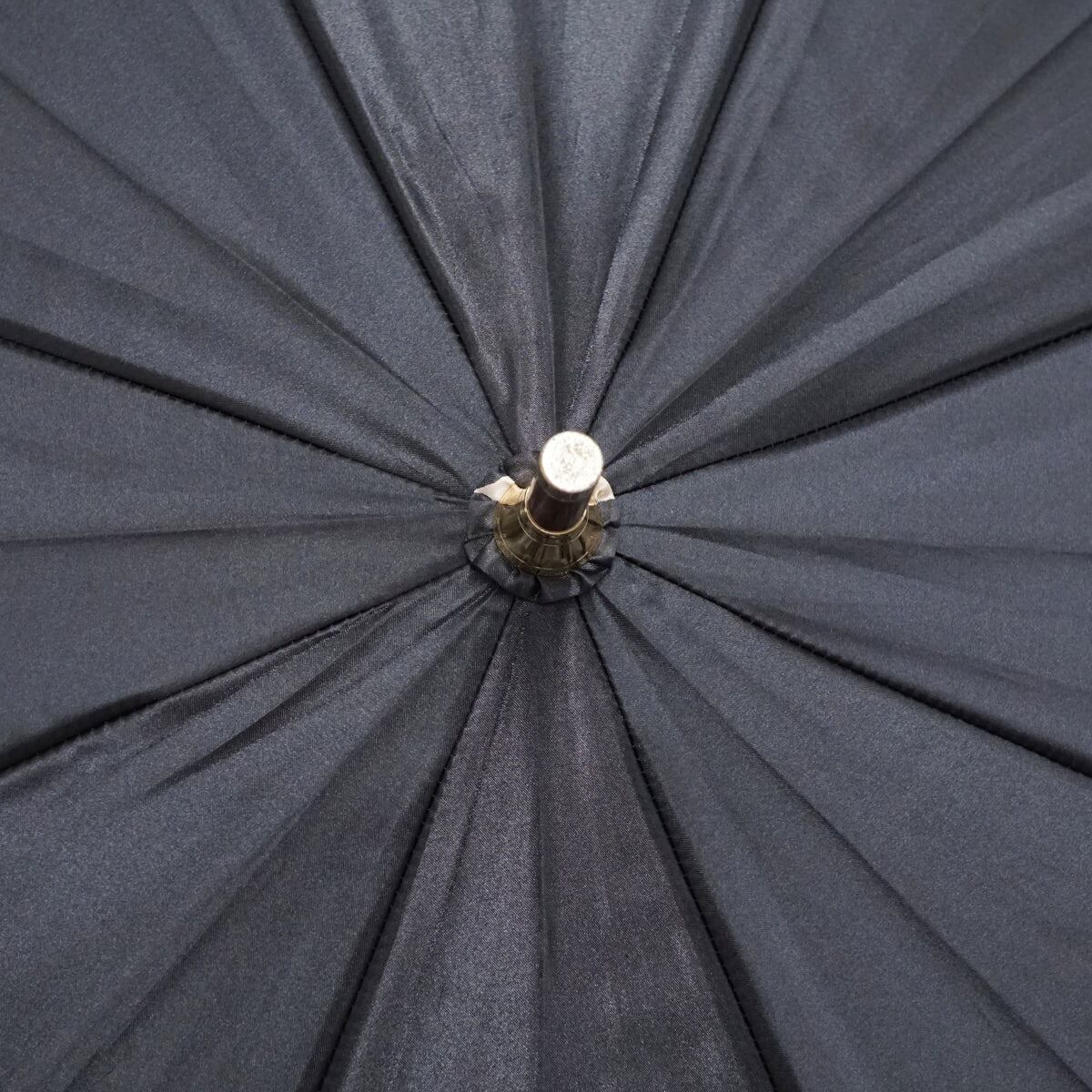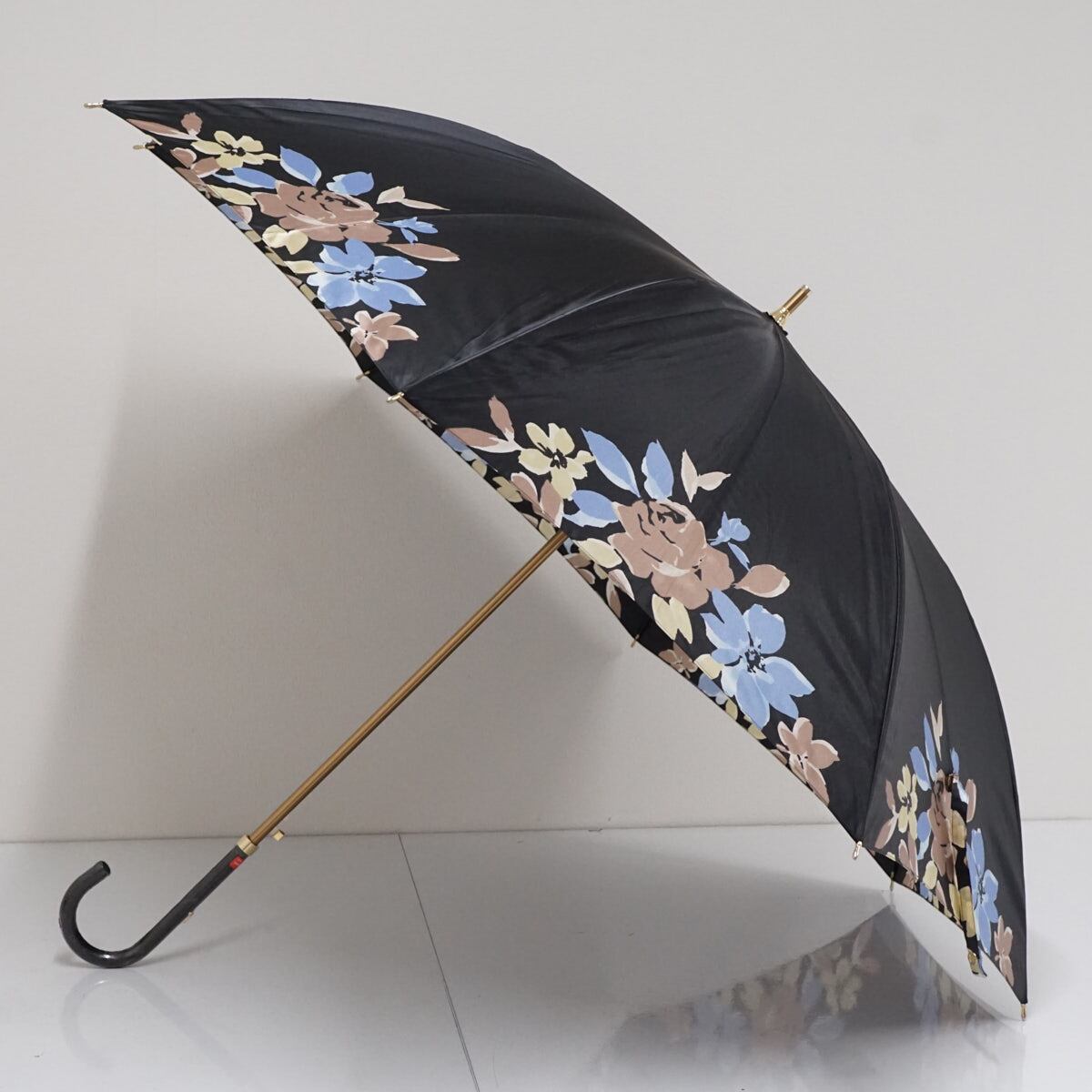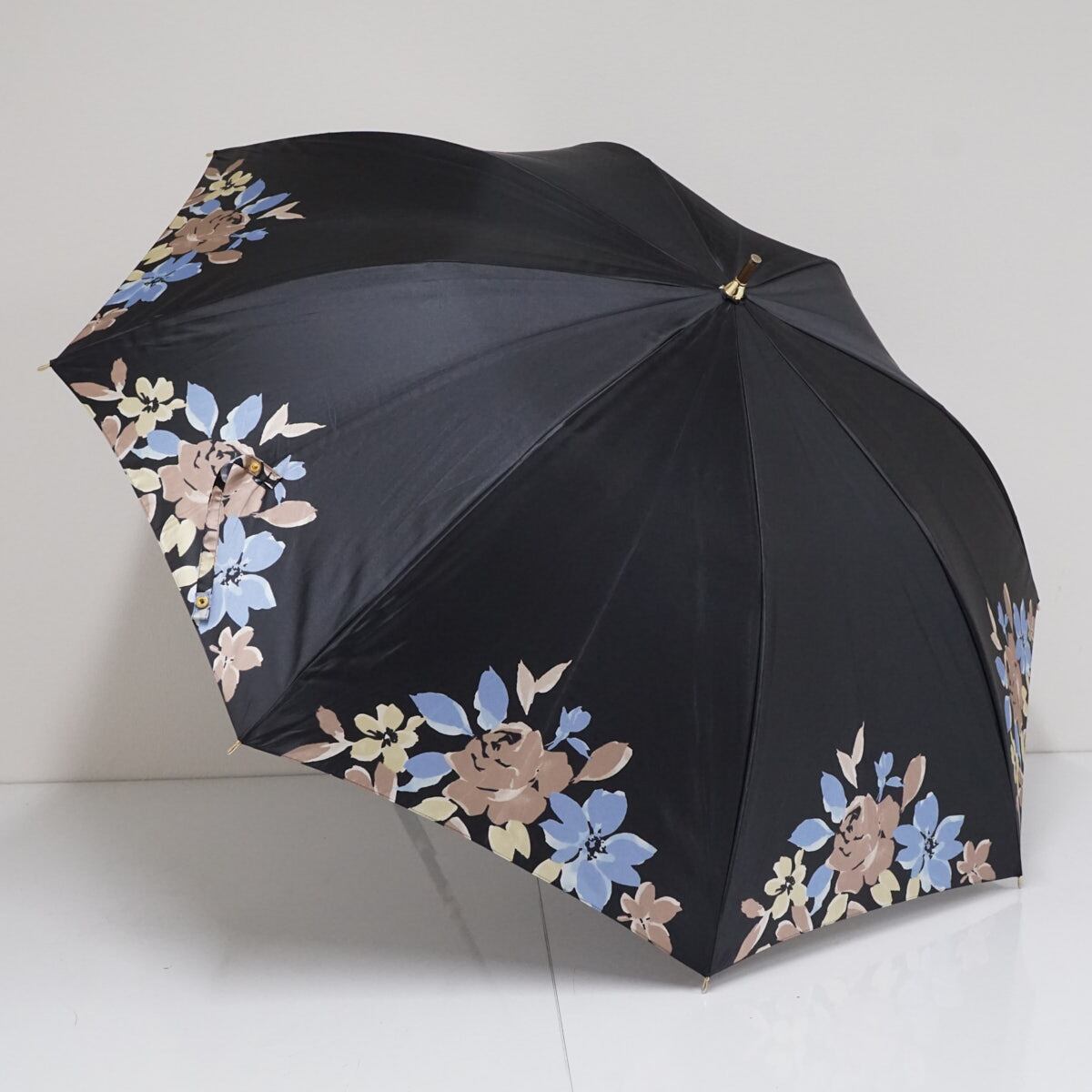 上品な光沢のあるブラックの生地にフラワープリントを施したエレガントなアンブレラです。