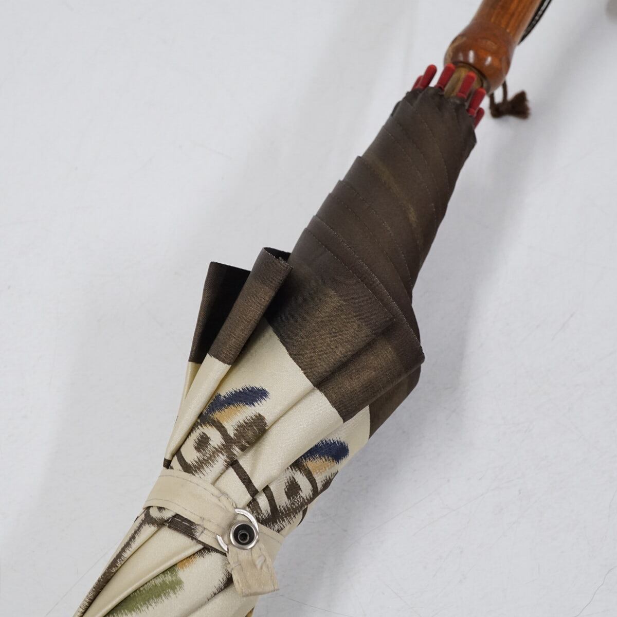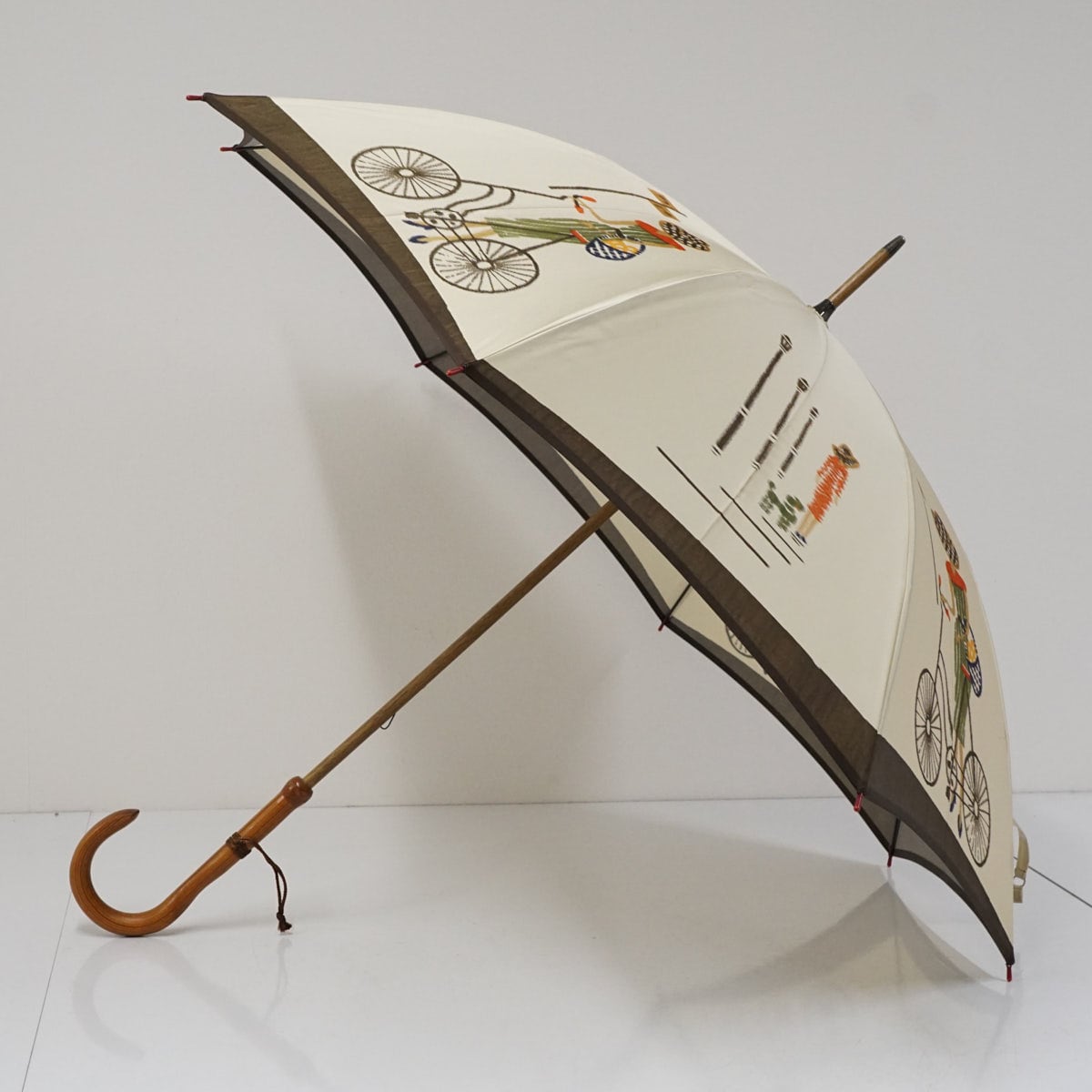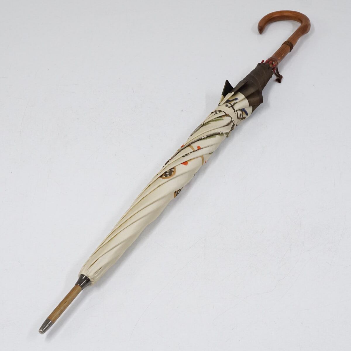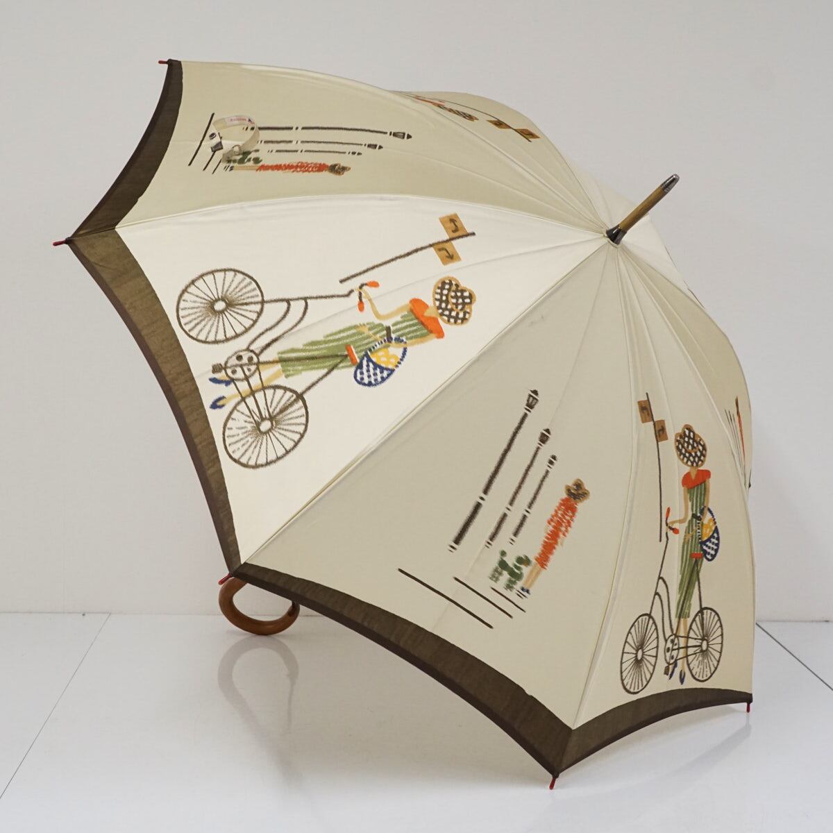 高級傘 モンブランヤマグチ USED品 自転車 ベージュ ほぐし織 アート 絵画 天然木 60cm S3147