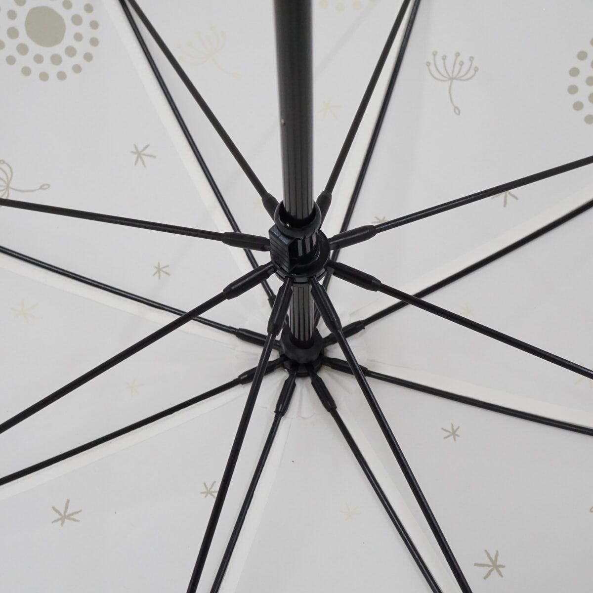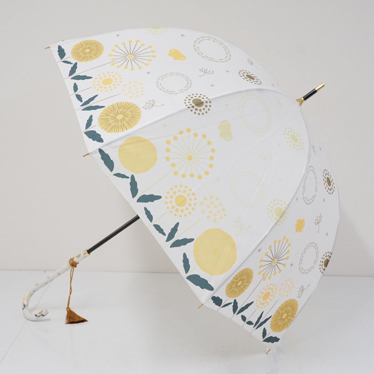 タンポポと綿毛たちが傘全体に描かれ、優しく温かみのあるデザインです。