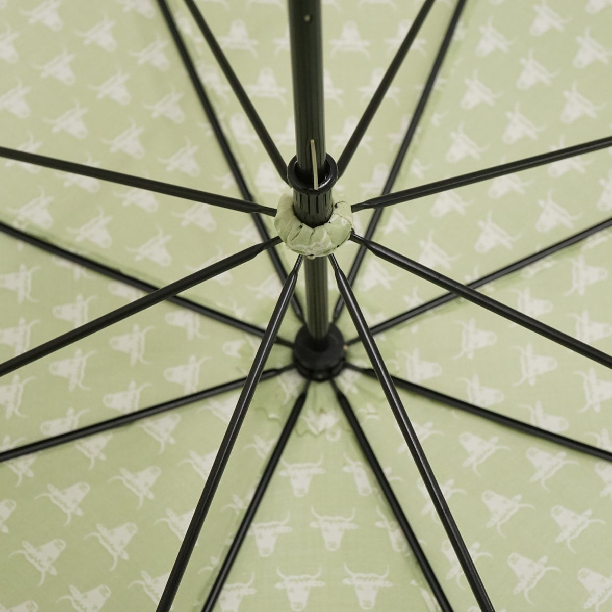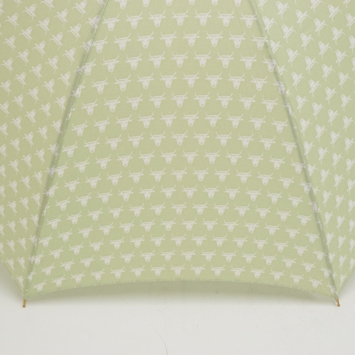 ライトグリーンの爽やかな色味に、牛の顔のプリントを全体に施したデザインです。