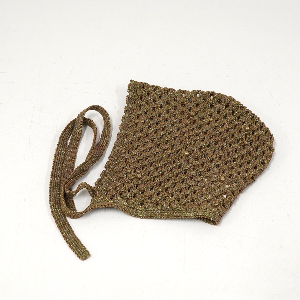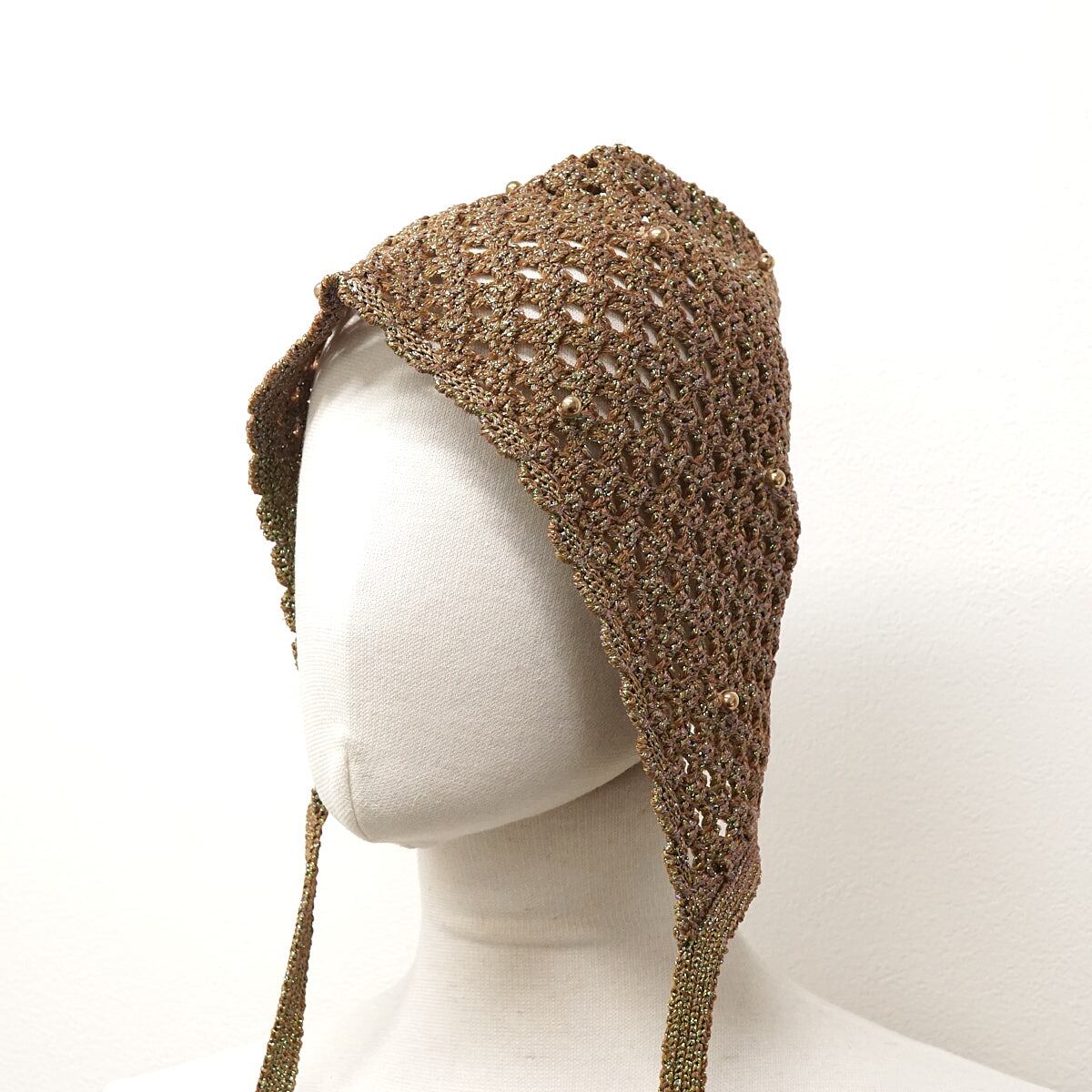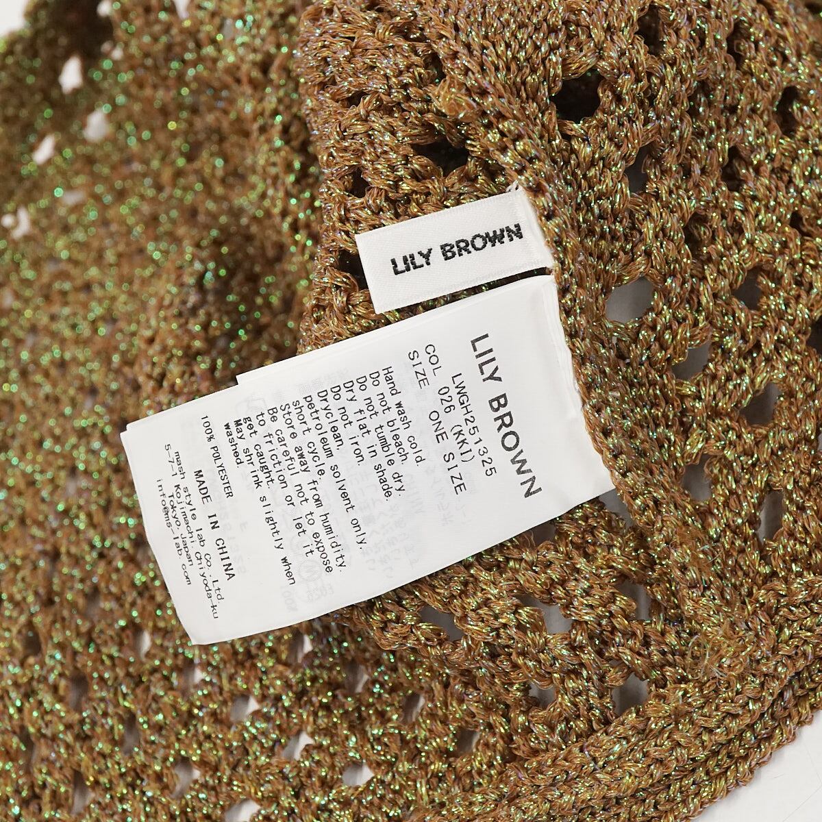 LILY BROWN リリーブラウン クロシェボンネット USED美品 KKI クロシェ編み ビーズ カーキ ラメ レトロ フリーサイズ X7736