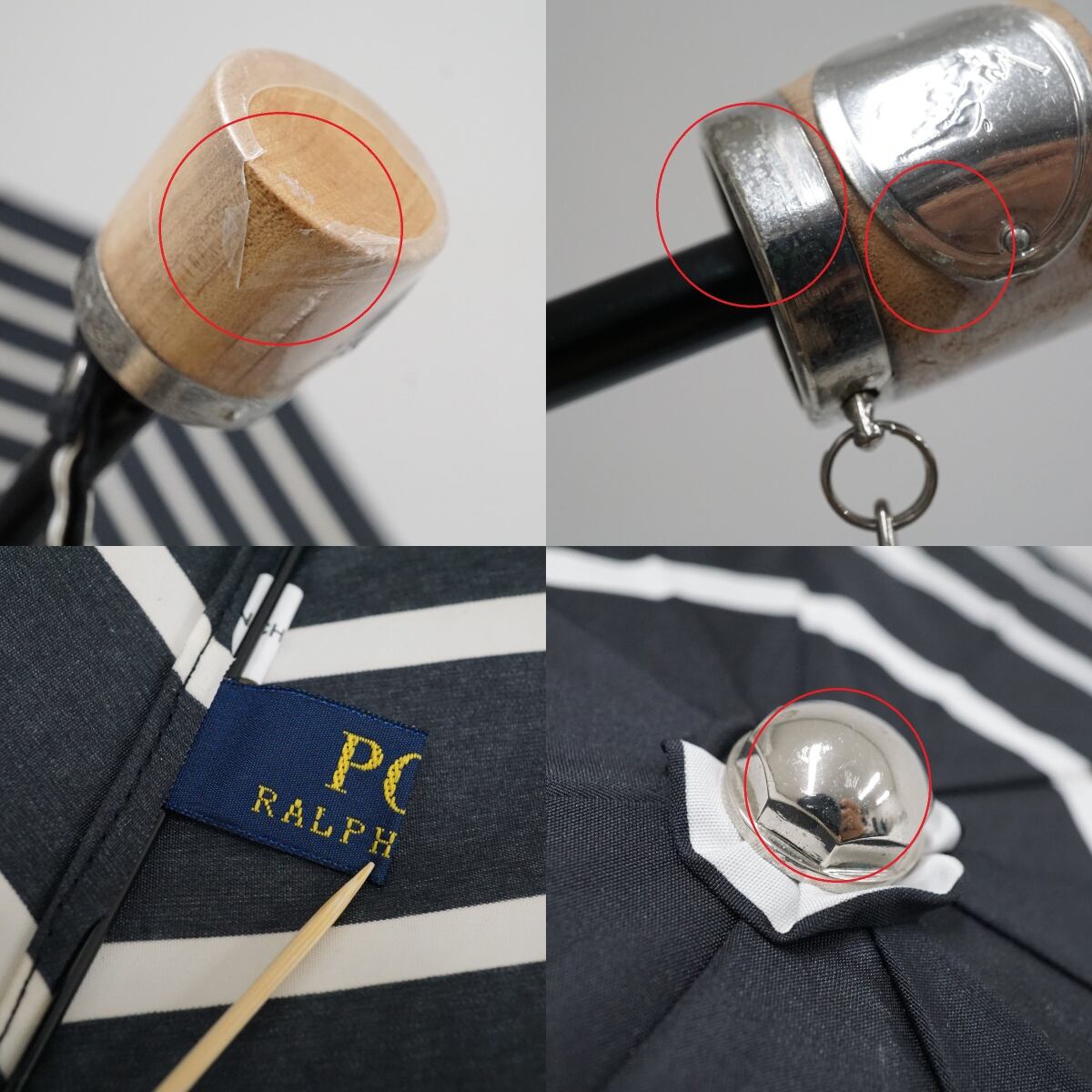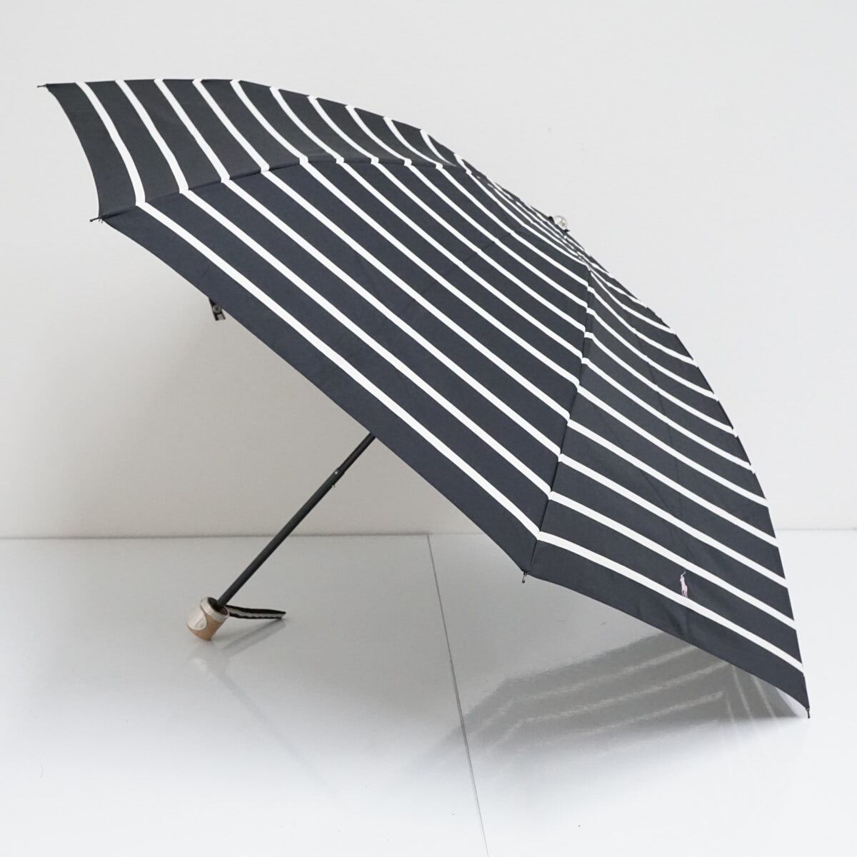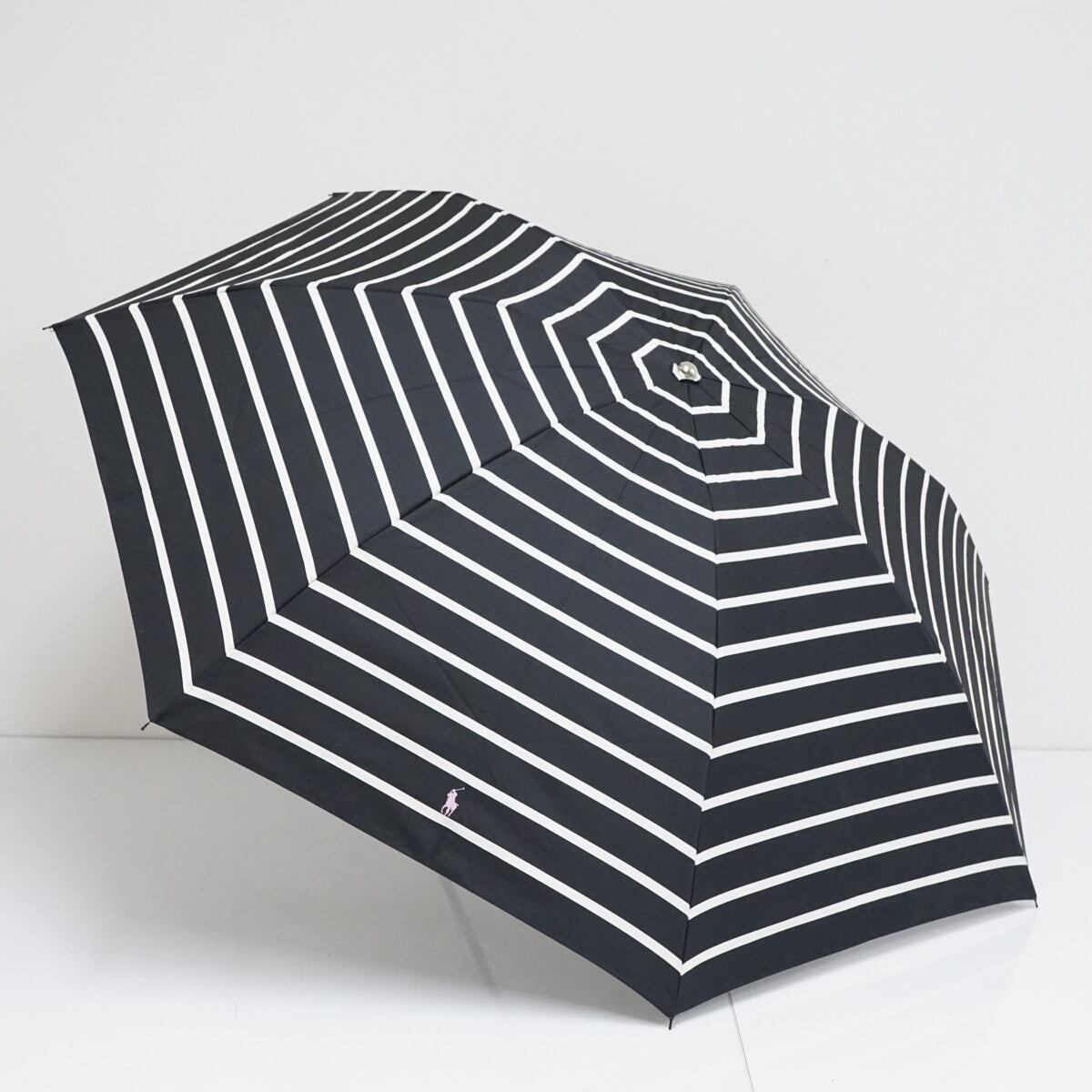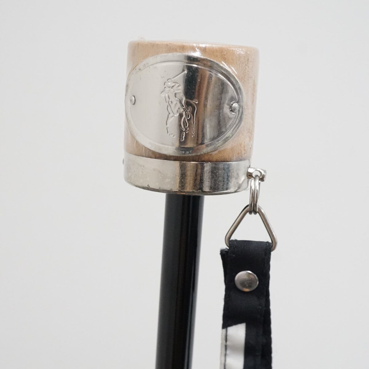 折りたたみ傘 POLO RALPH LAUREN ポロラルフローレン USED美品 ボーダー ブラック×ホワイト ロゴ 木製手元 ブランド 55cm FS9399