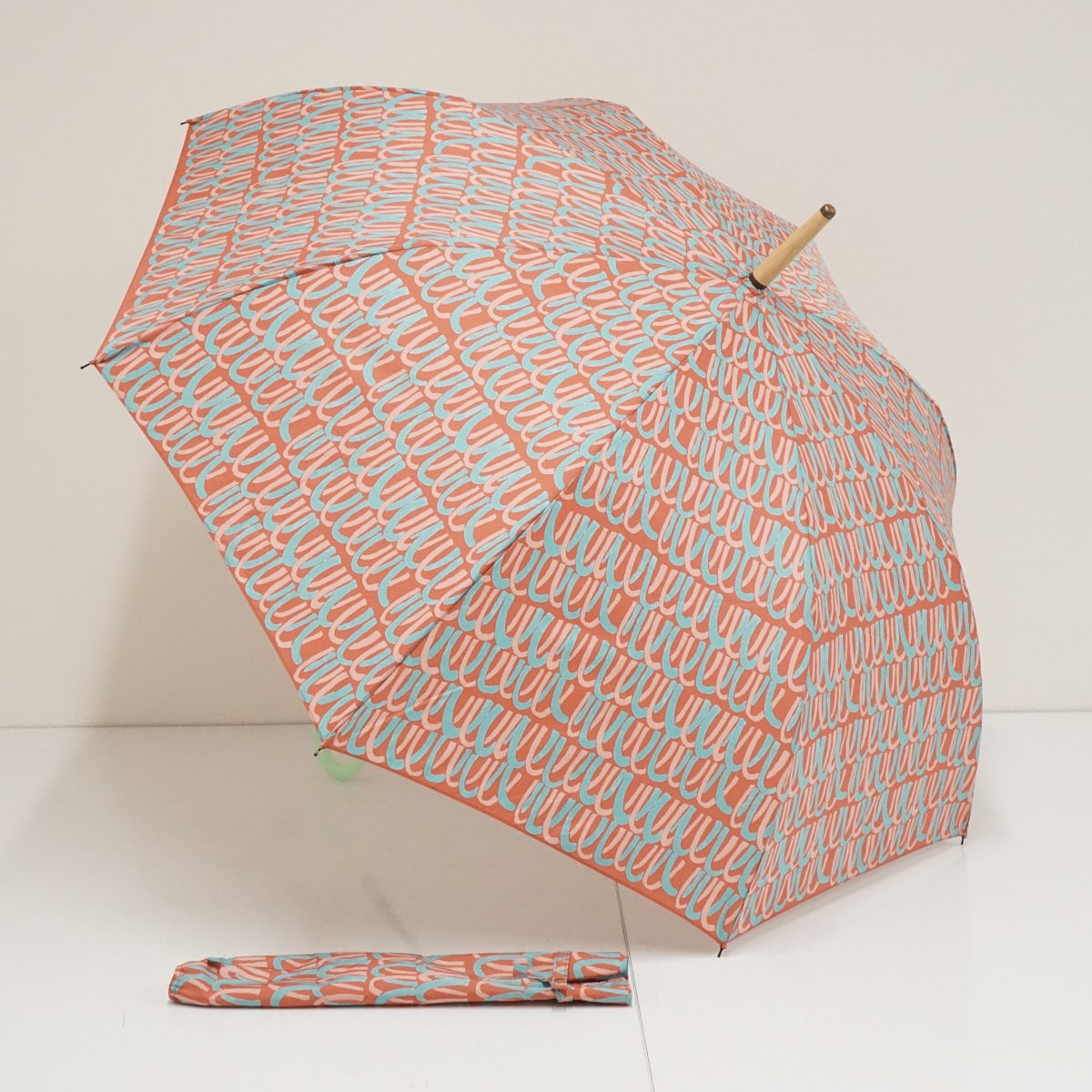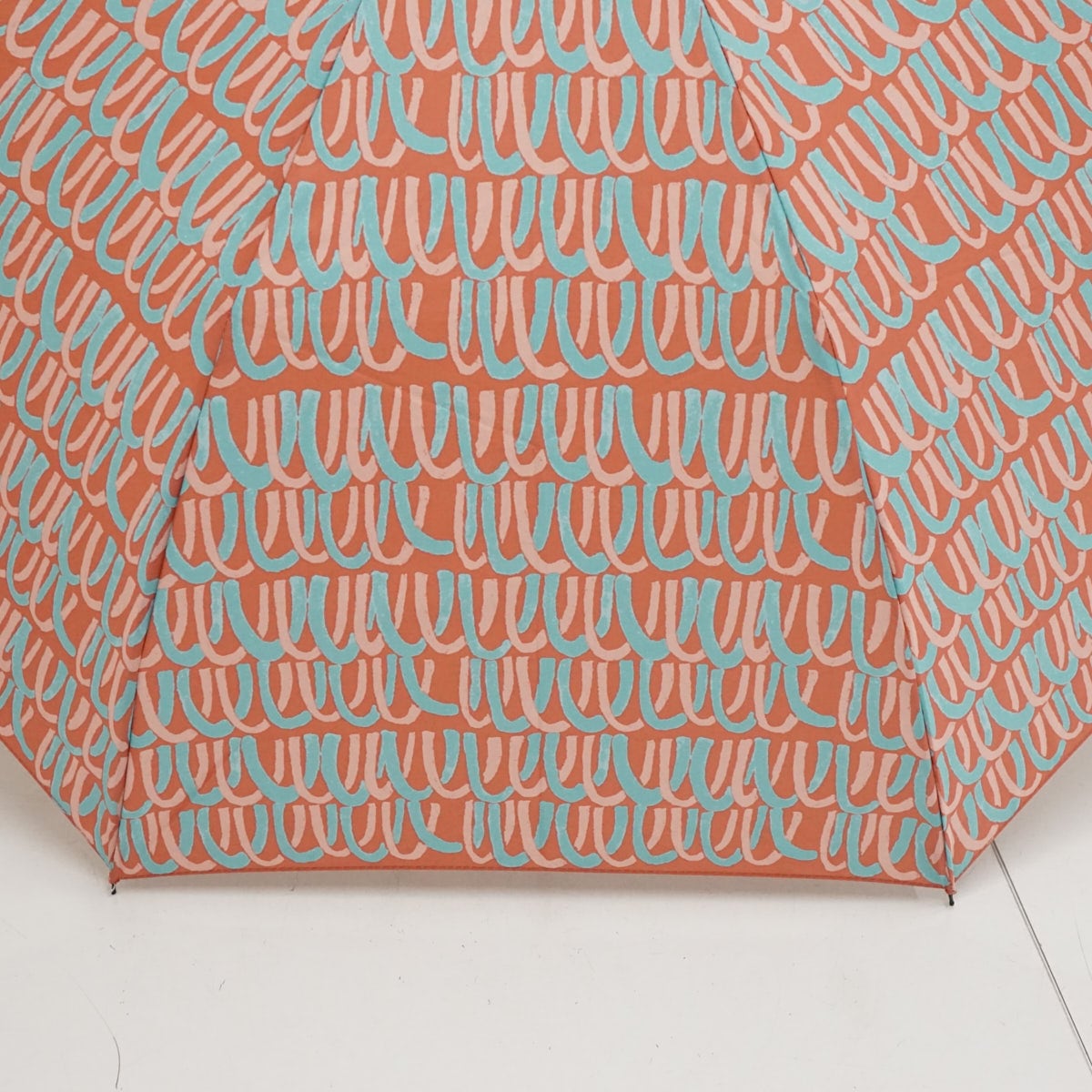 くすみがかったレッドカラーに、ピンクとライトブルーで波型のようにデザインが入った折傘です。