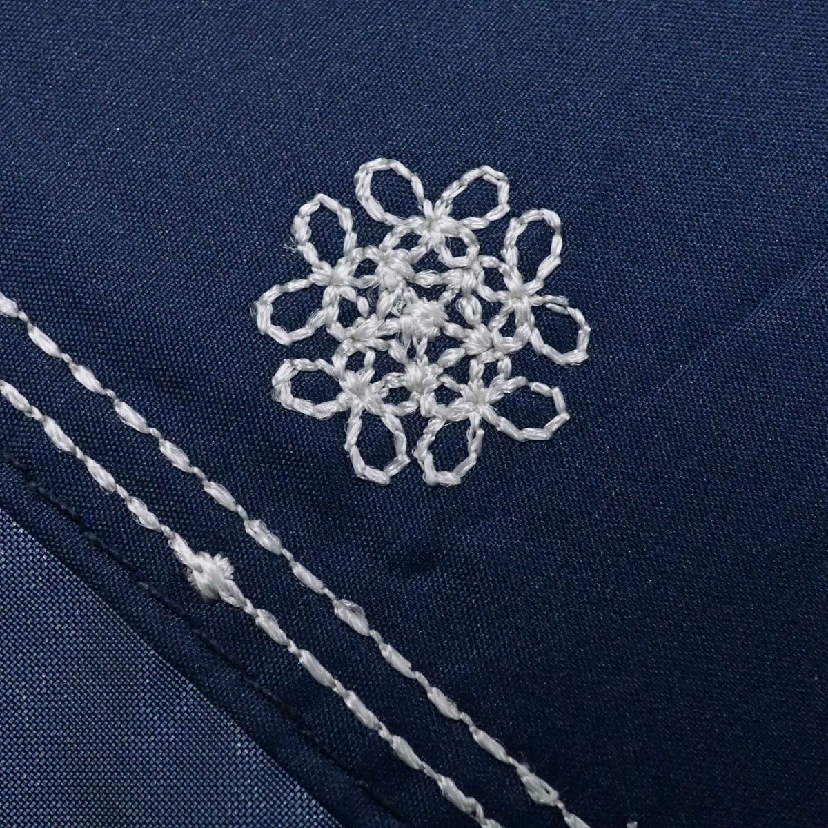 生地はネイビーで、外周にホワイトでフラワーの刺繍が施されています。
