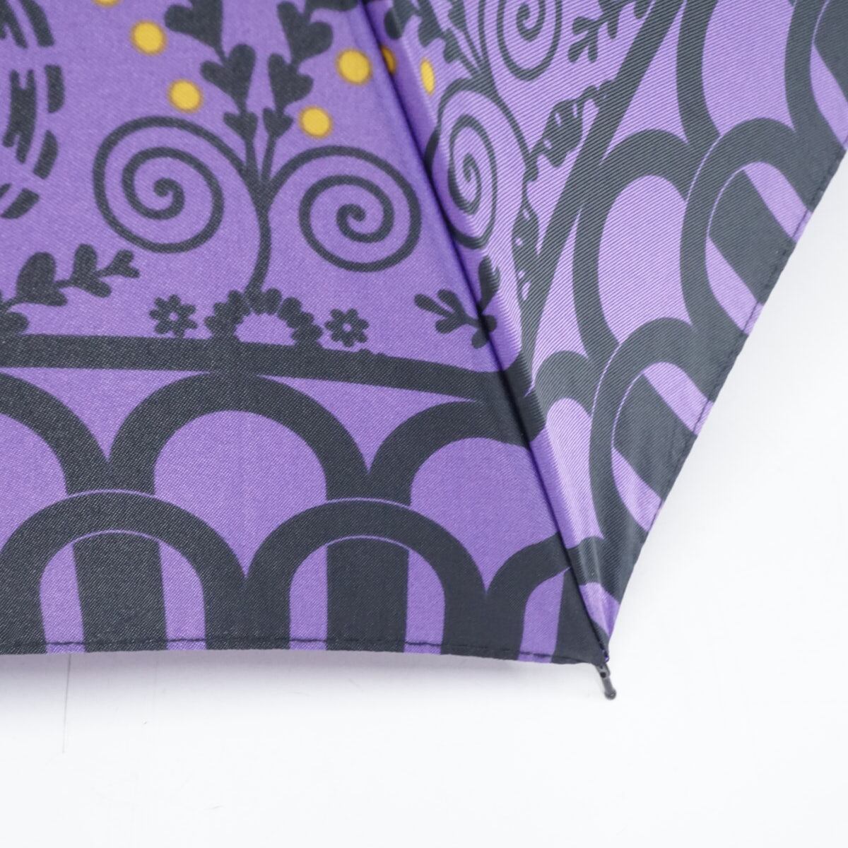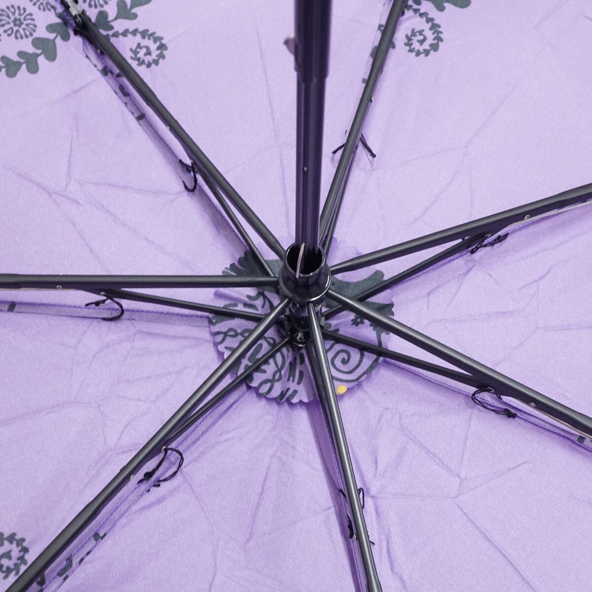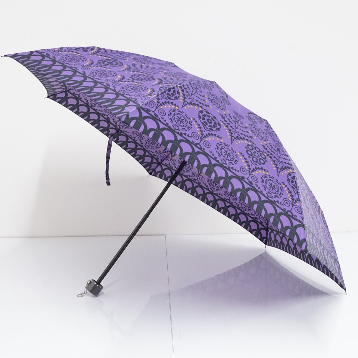 鮮やかなパープルの生地に、ブラックで草花や幾何学模様がプリントされた折りたたみ傘です。