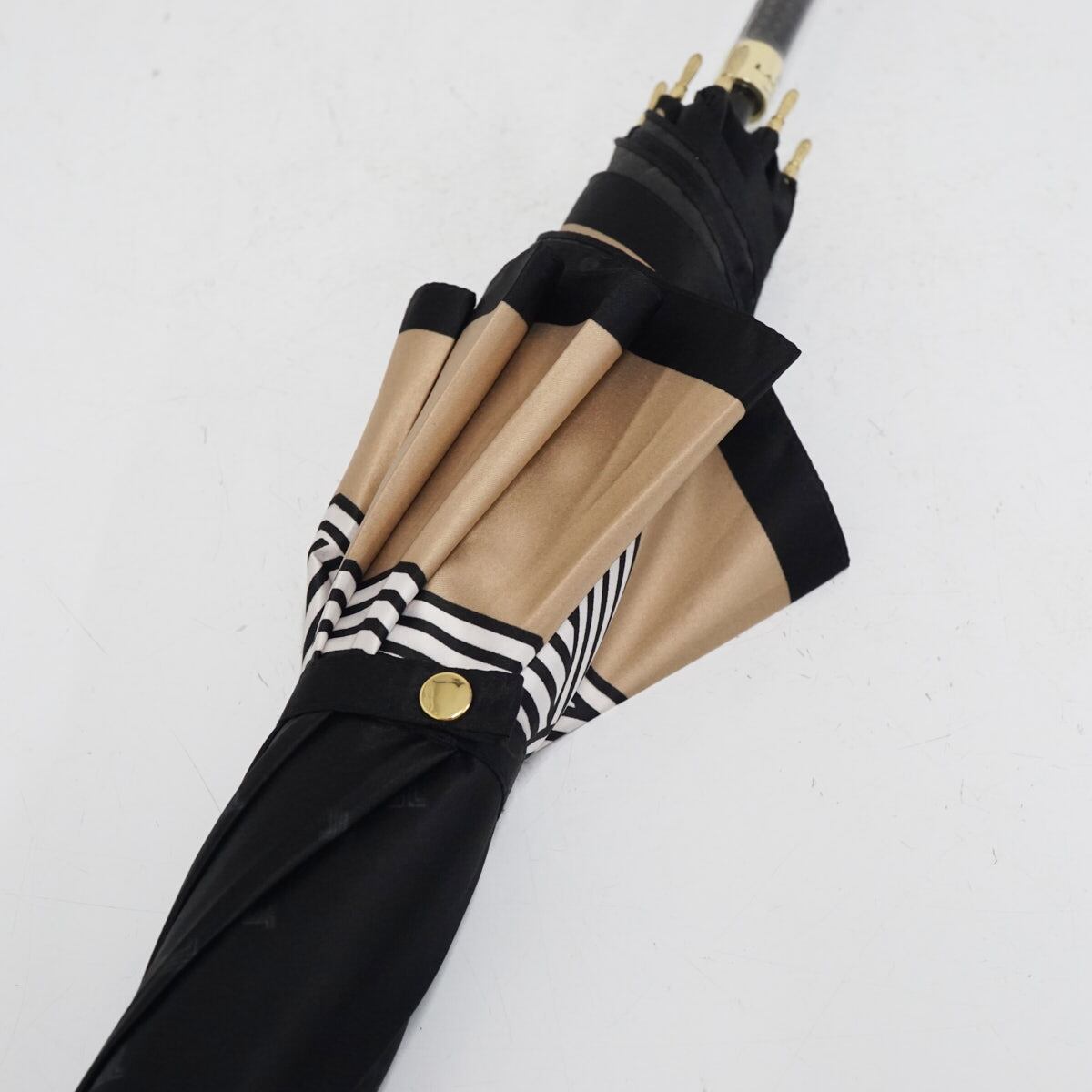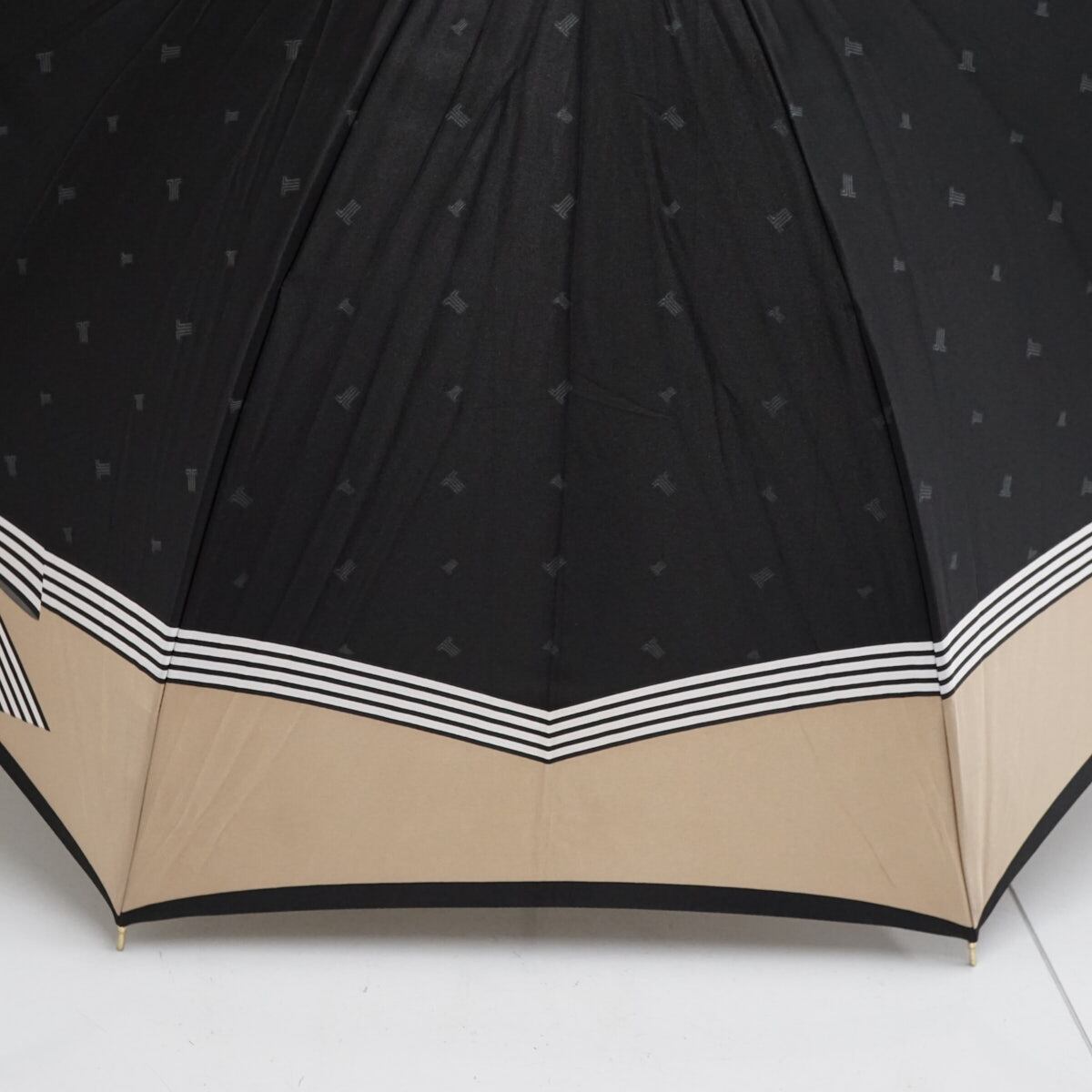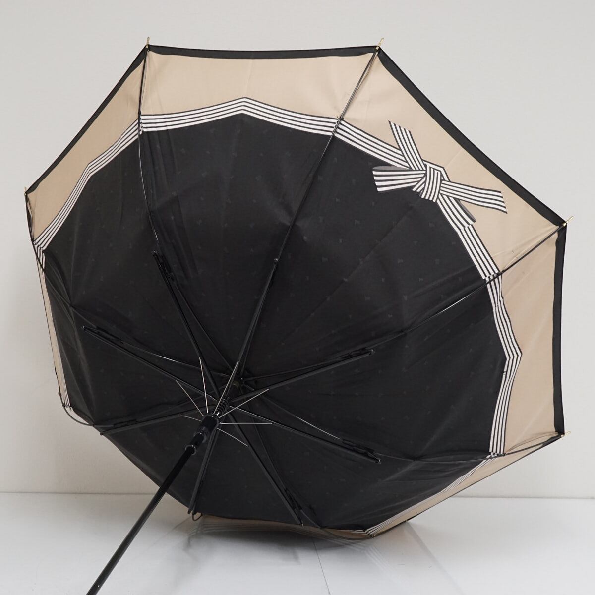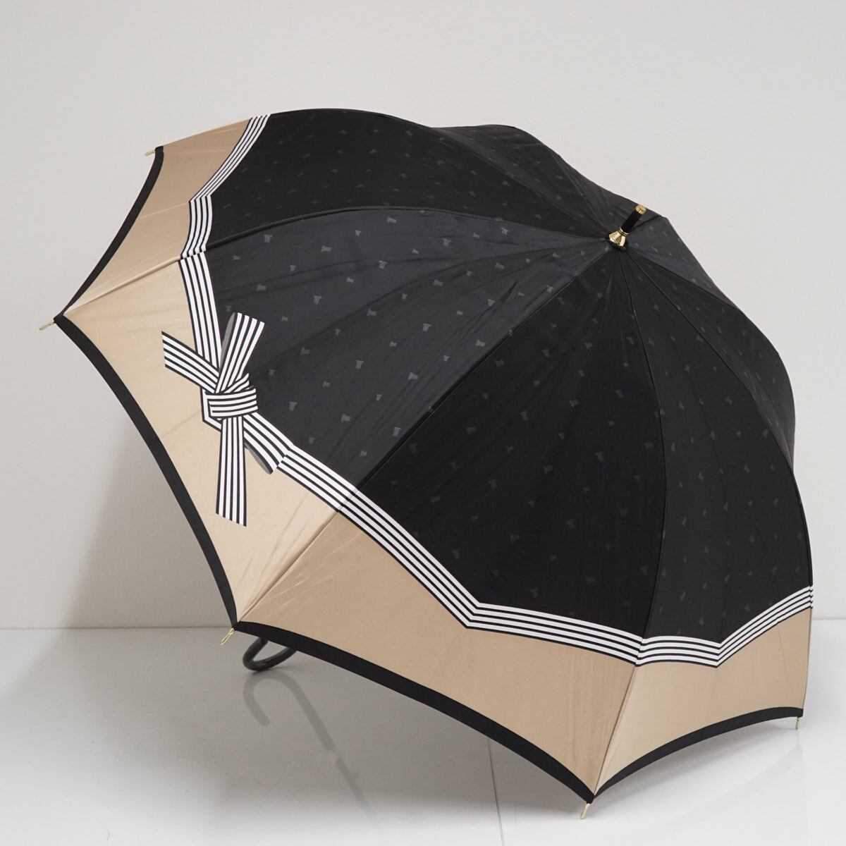 耐風傘 LANVIN en Bleu ランバンオンブルー USED美品 ブラック×ベージュ リボン ジャンプ グラス骨 60cm A3253