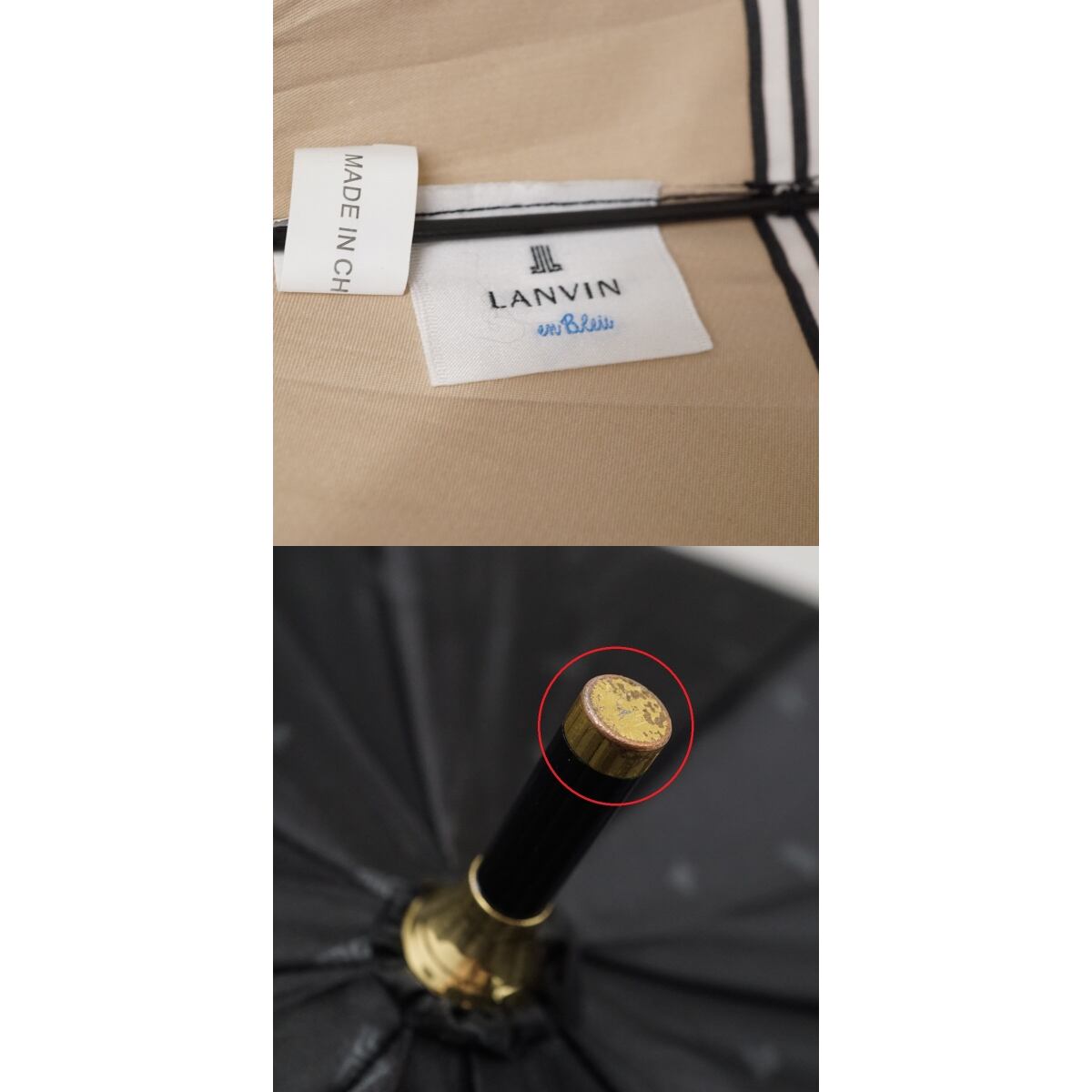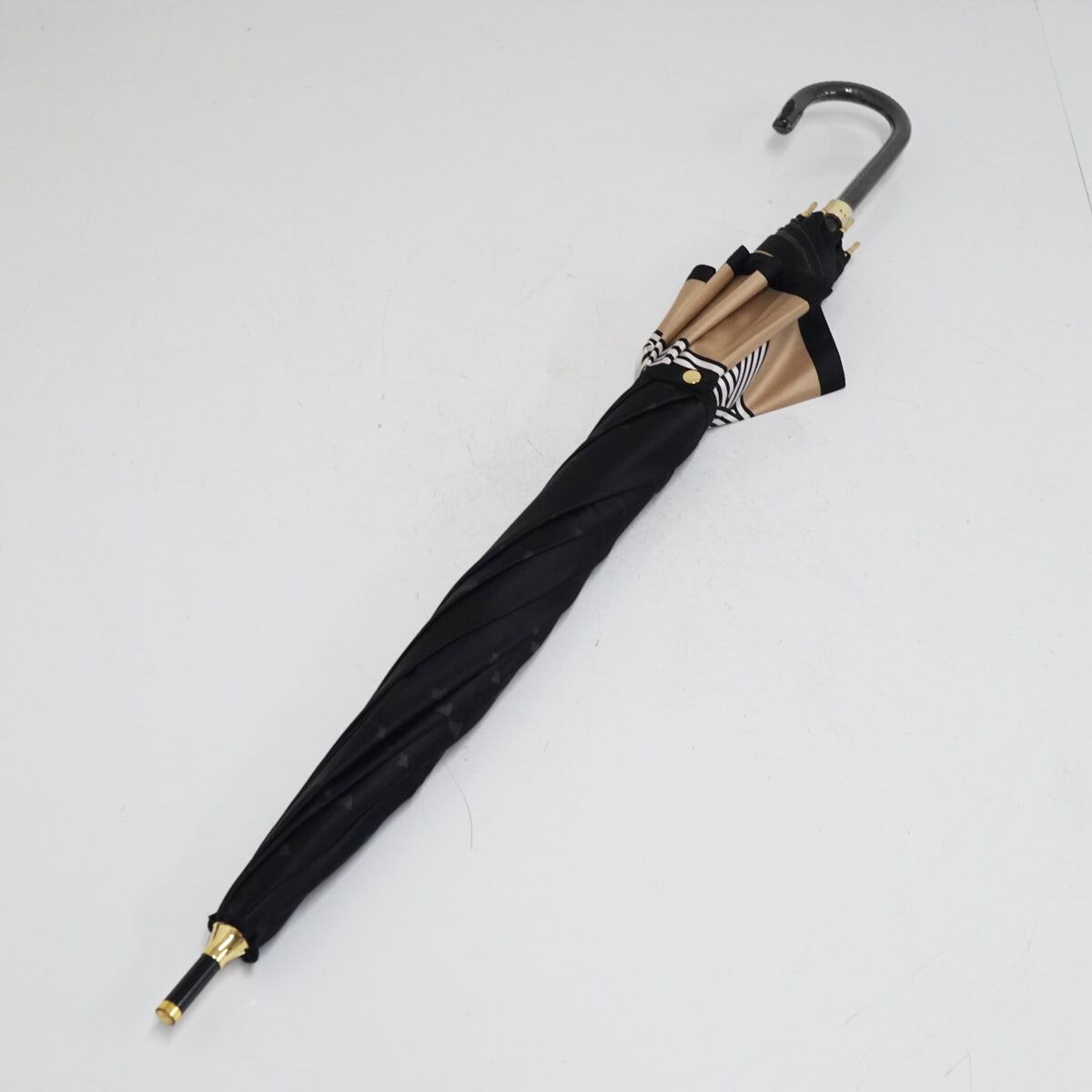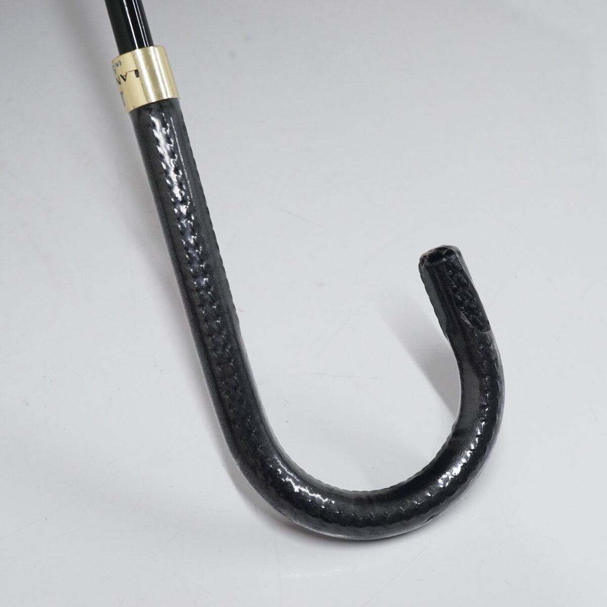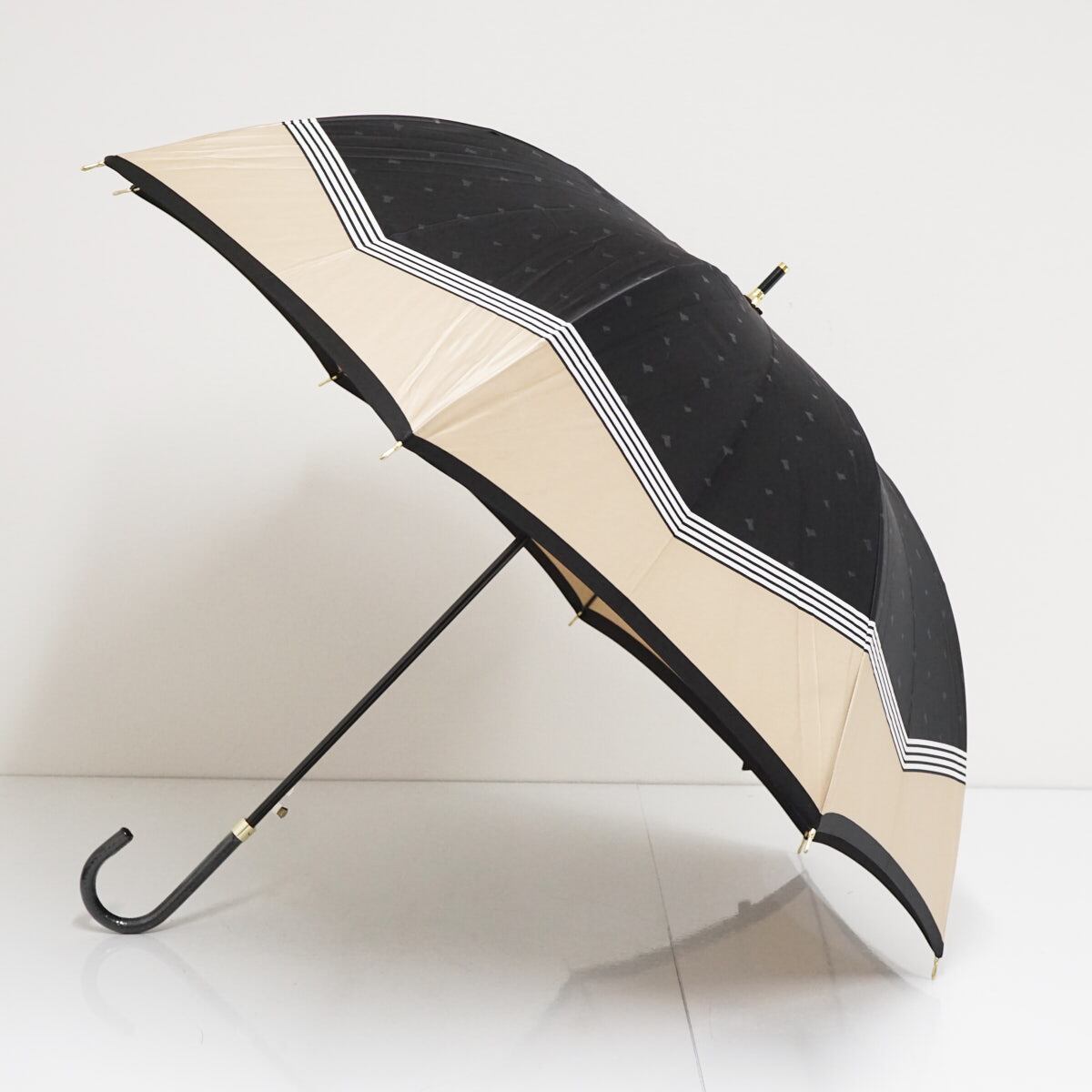耐風傘 LANVIN en Bleu ランバンオンブルー USED美品 ブラック×ベージュ リボン ジャンプ グラス骨 60cm A3253