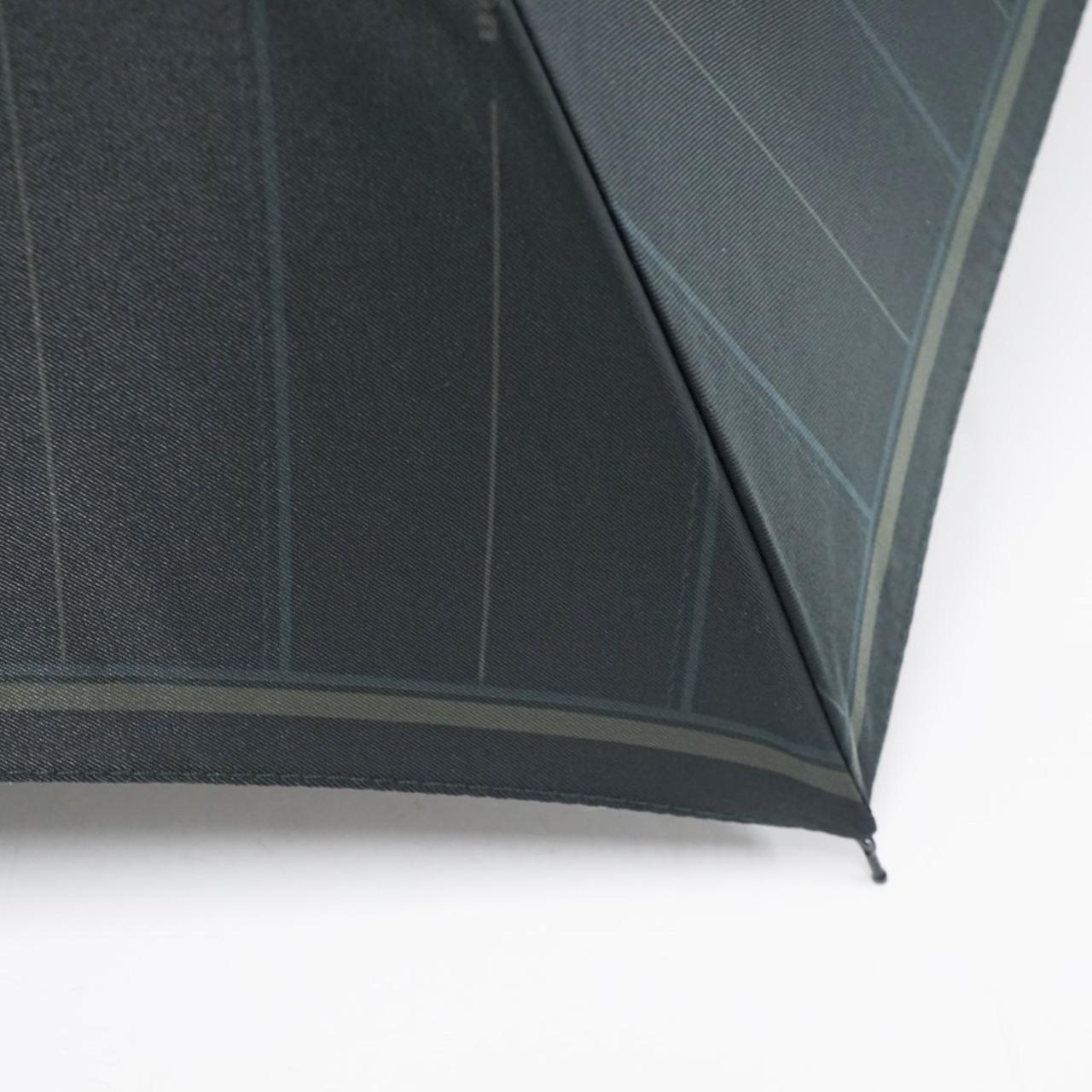 光沢のある深めのグリーンカラーの生地に、ブランドロゴと細めのストライプの入ったデザインです。