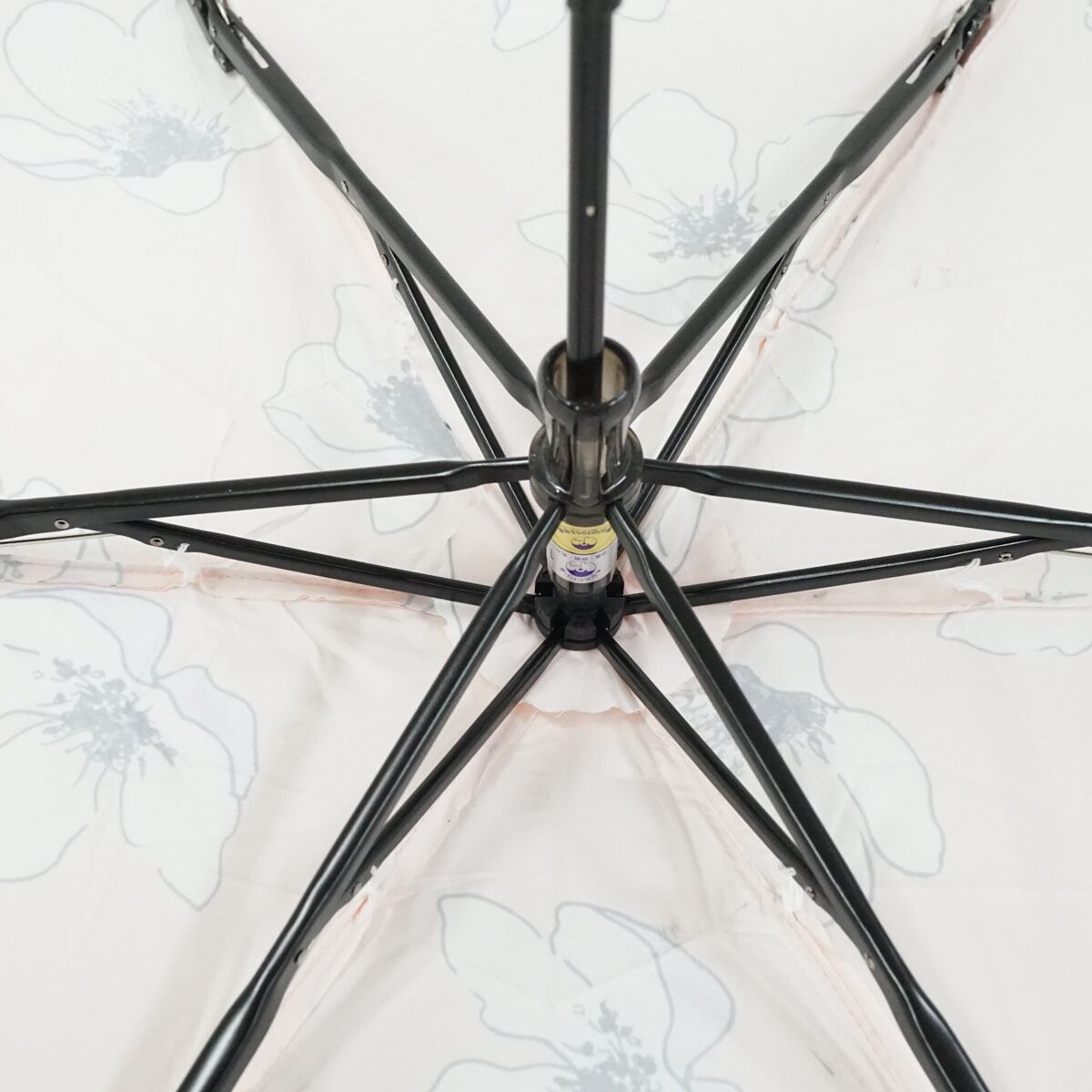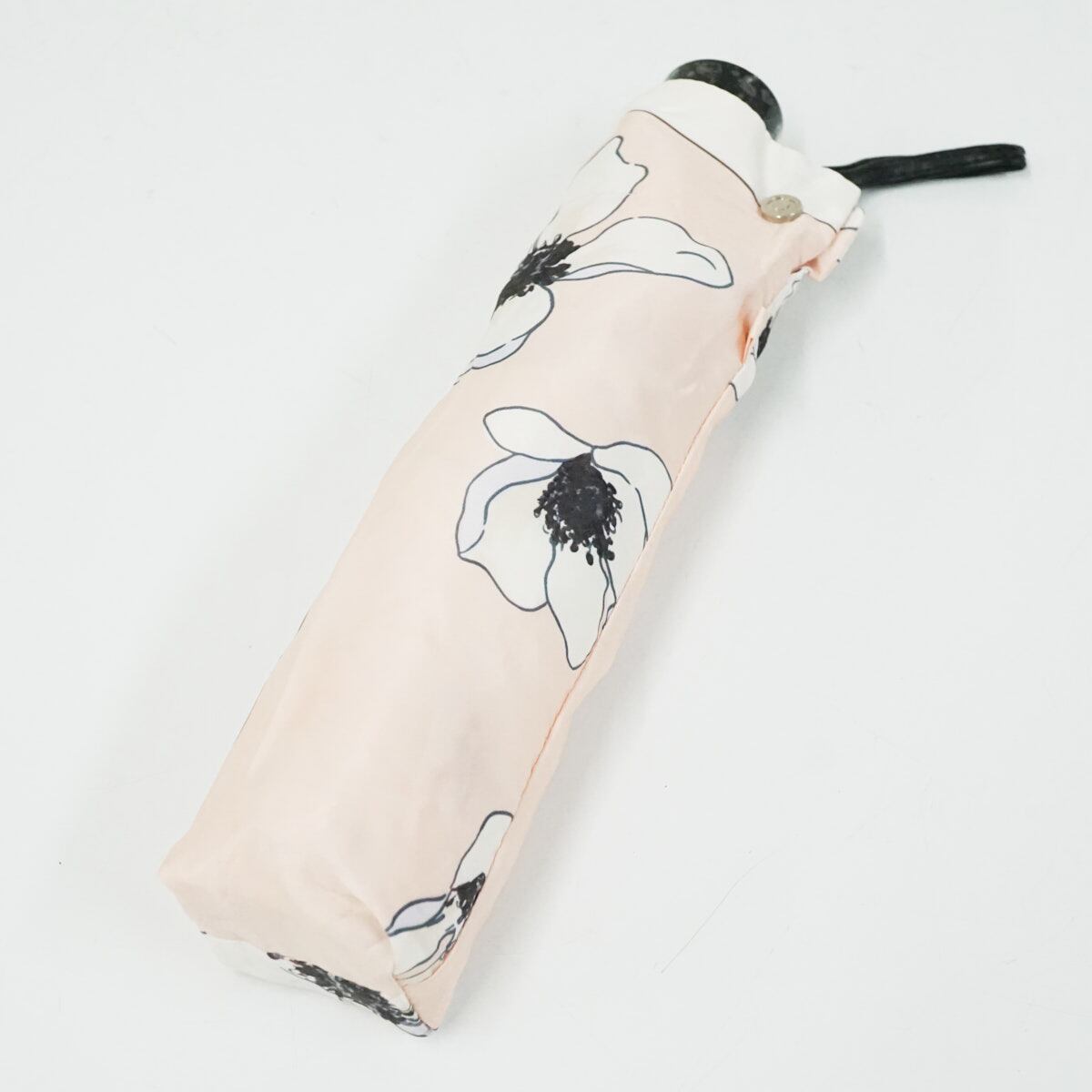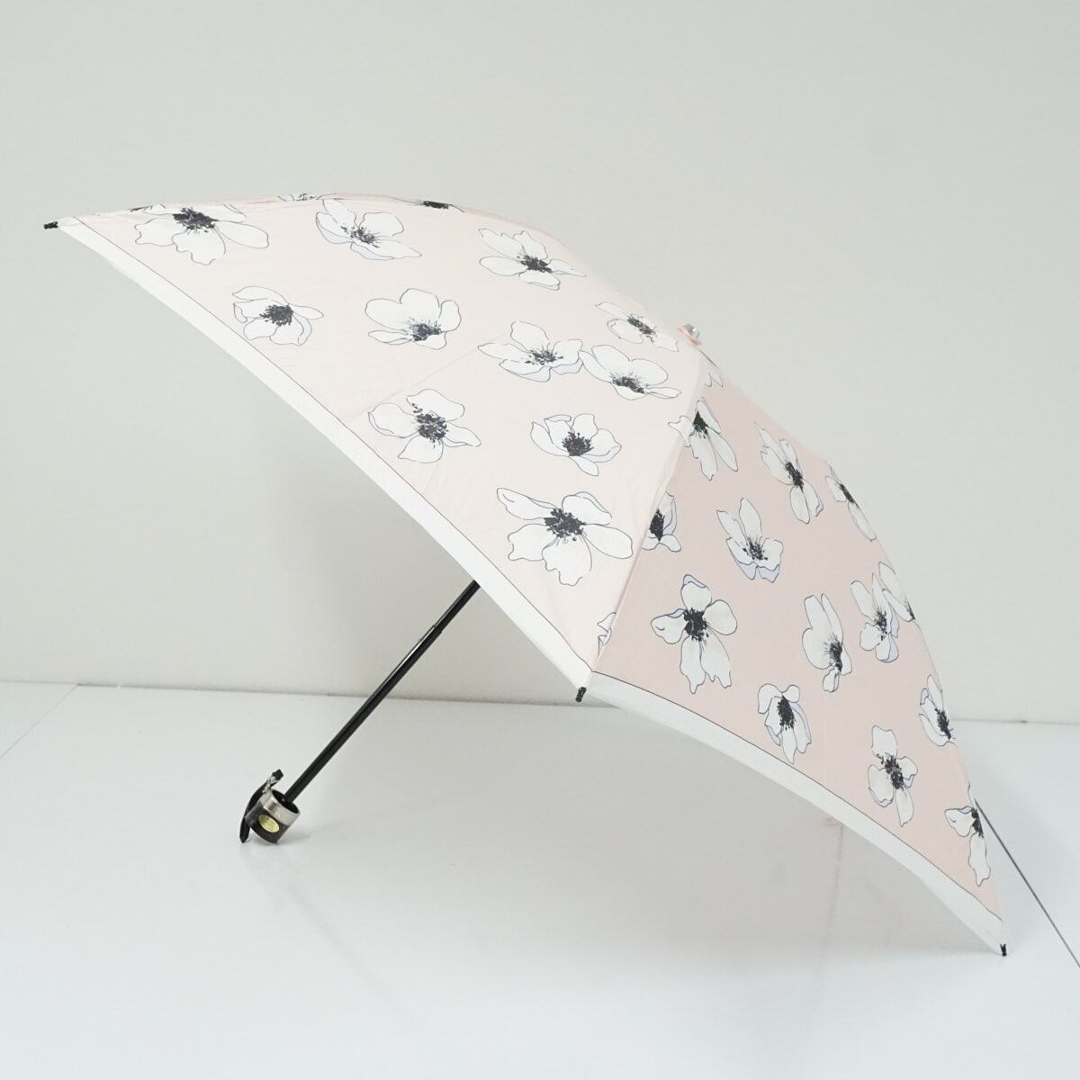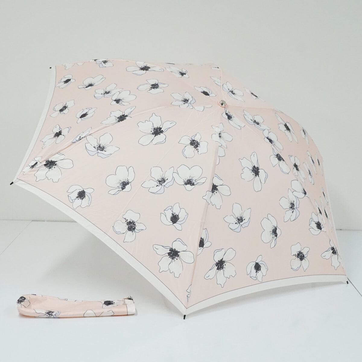光沢のあるライトピンクの生地にフラワーをデザインを施した傘です。
