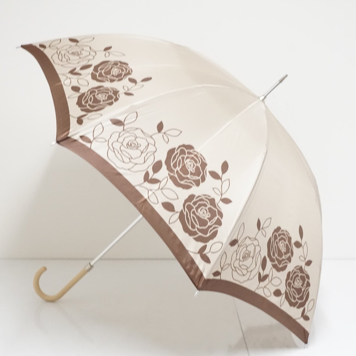 淡い光沢のある生地をベースにバラが散りばめられたエレガントなデザインの傘です。