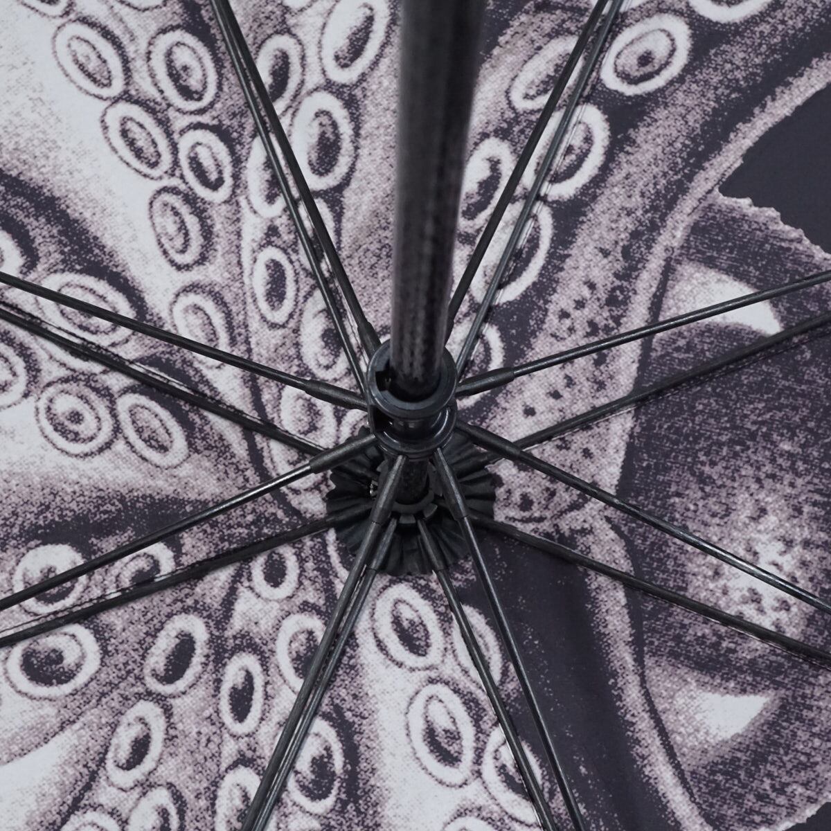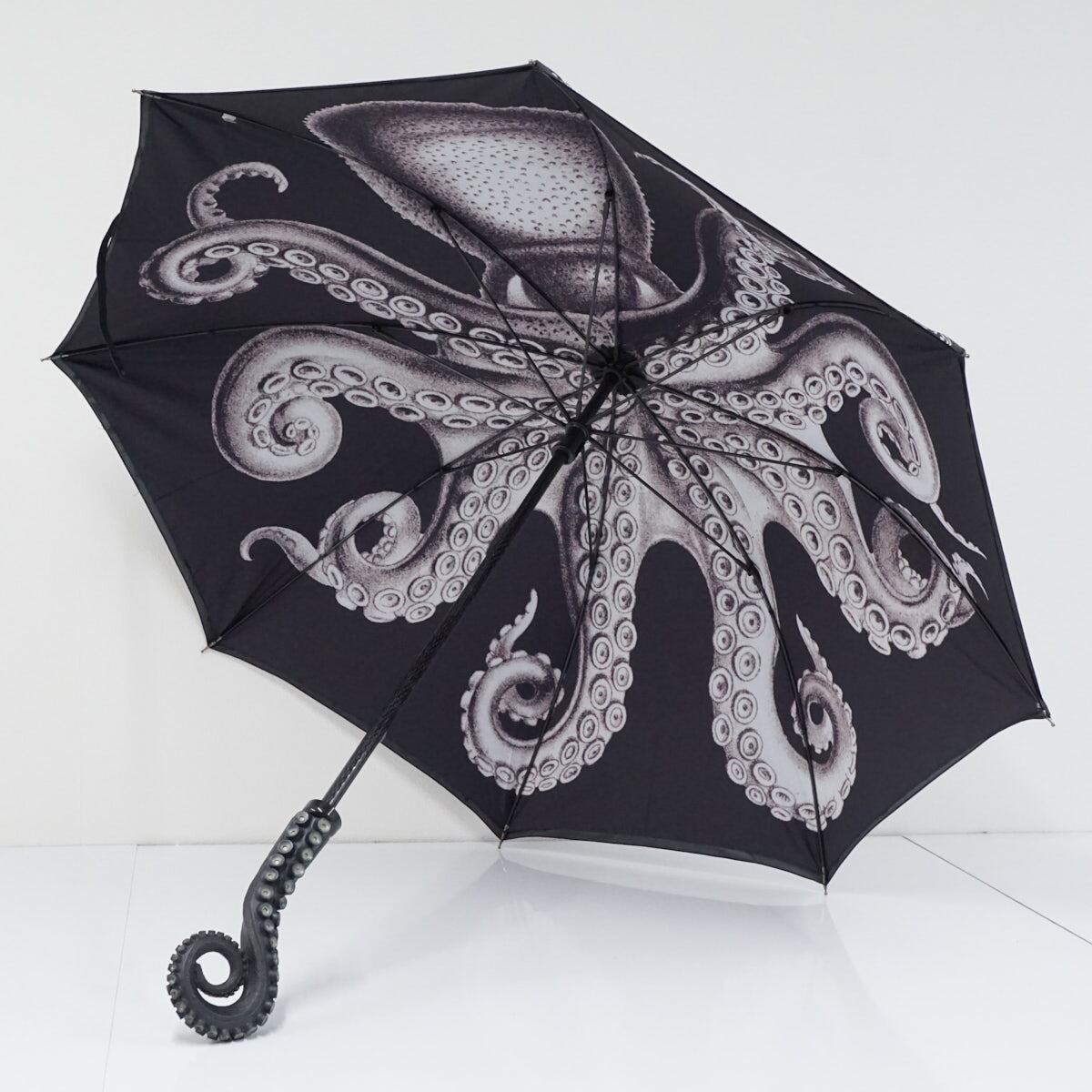 外側にはタコなどの様々な海洋生物が描かれており、内側には一面に大きなタコが描かれたアーティスティックな傘です。