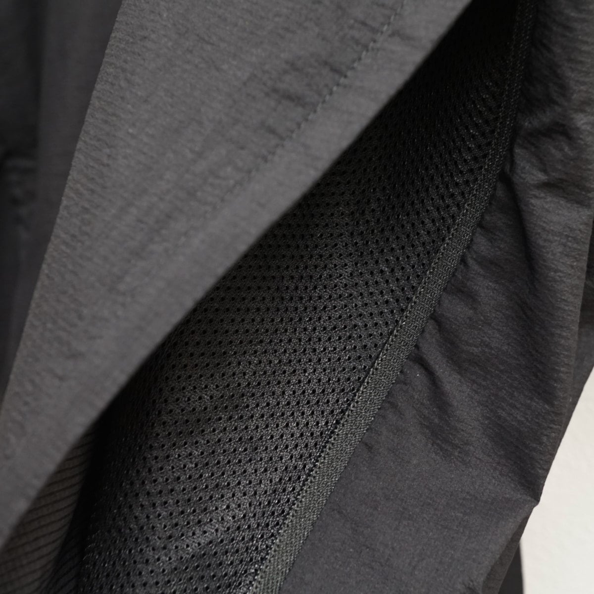 保温用のミドルレイヤーとのレイヤリングがしやすいように、袖下を中心にややゆとりを持たせたデザインで、