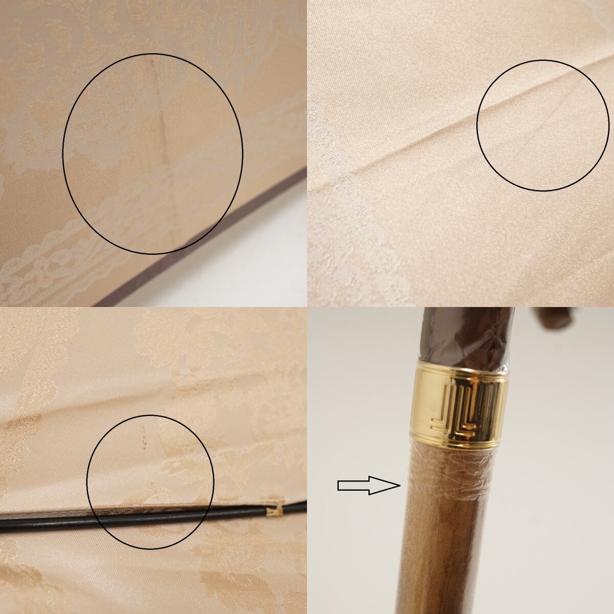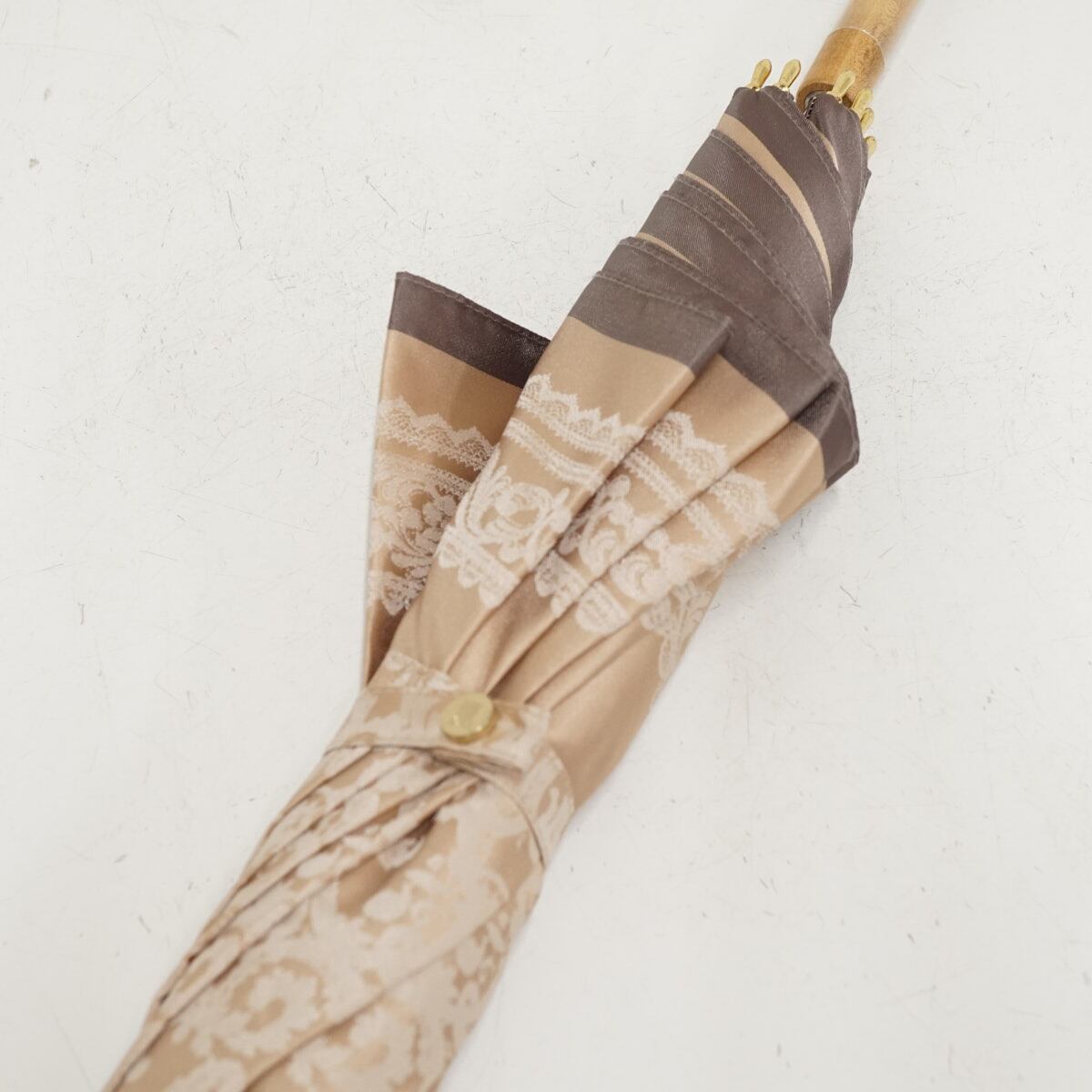 上品な光沢のあるピンクベージュ系の生地にレース柄がゴージャスでシックなラグジュアリーなデザインの傘です。