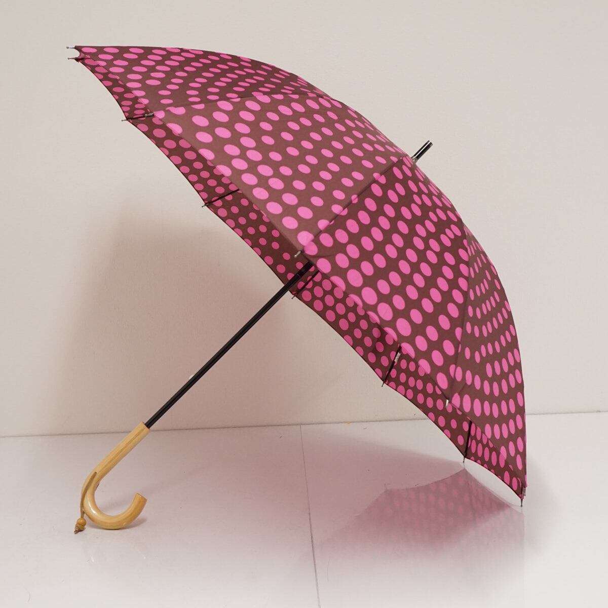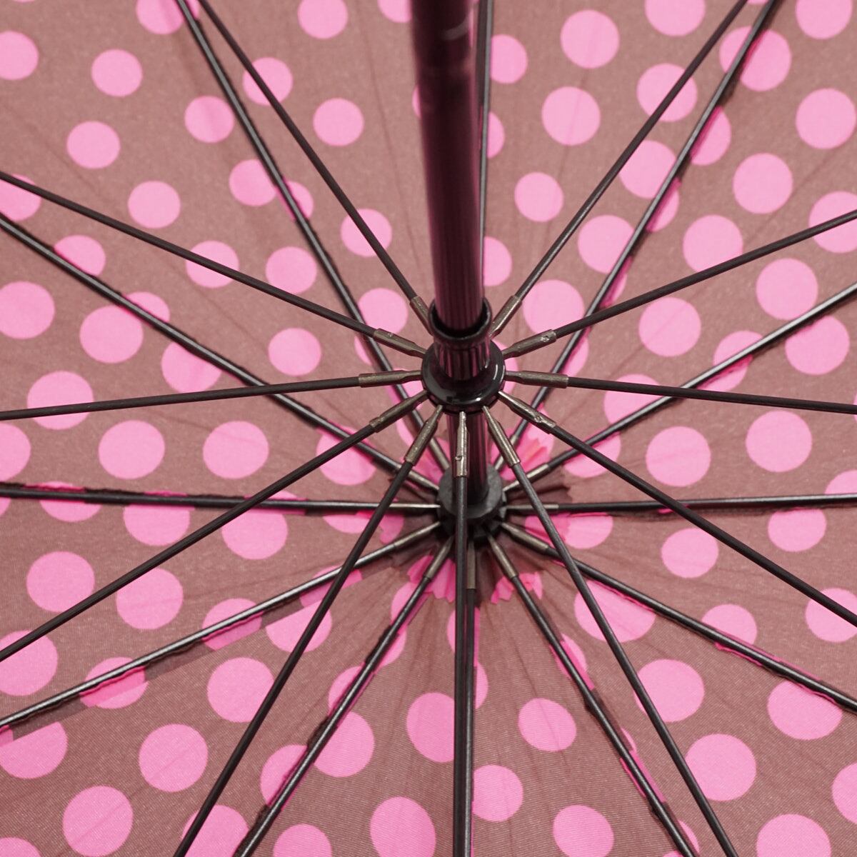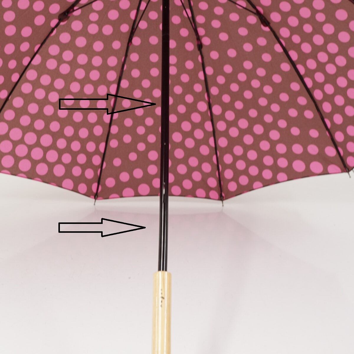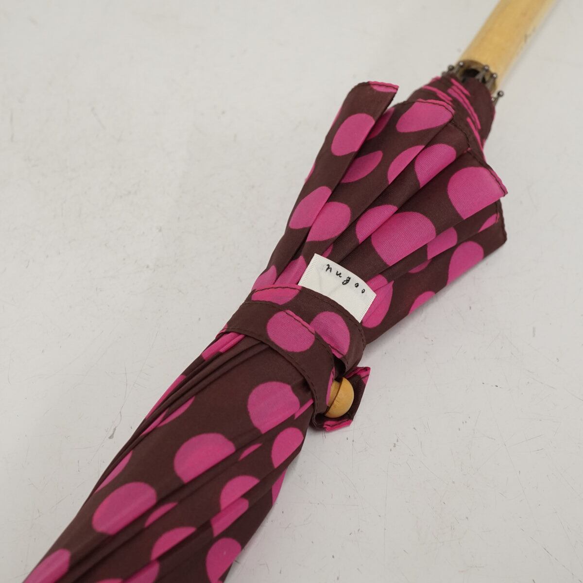 12本傘 nugoo 拭う USED美品 ドット ピンク×ブラウン 多間 手開き 木製手元 鮫小紋 ストラップ付 55cm A3314
