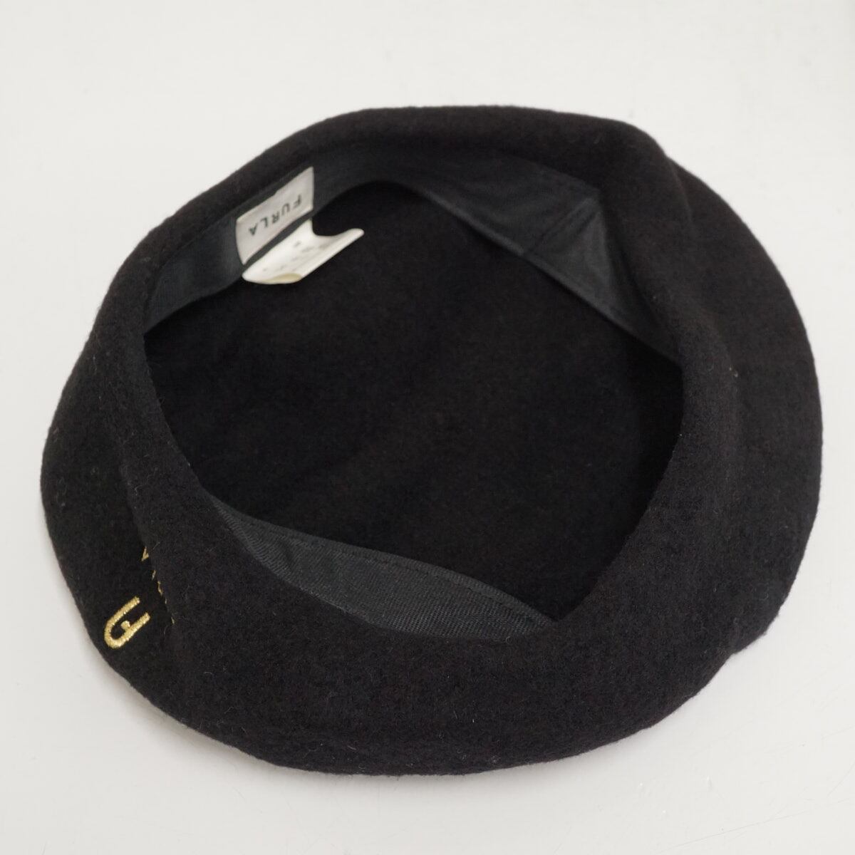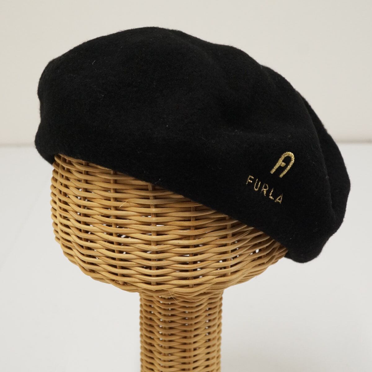 FURLA フルラ ロゴ入りバスクベレー帽 USED美品 ブラック 刺繍 秋冬 ブランド M〜Sサイズ ムーンバット X8106