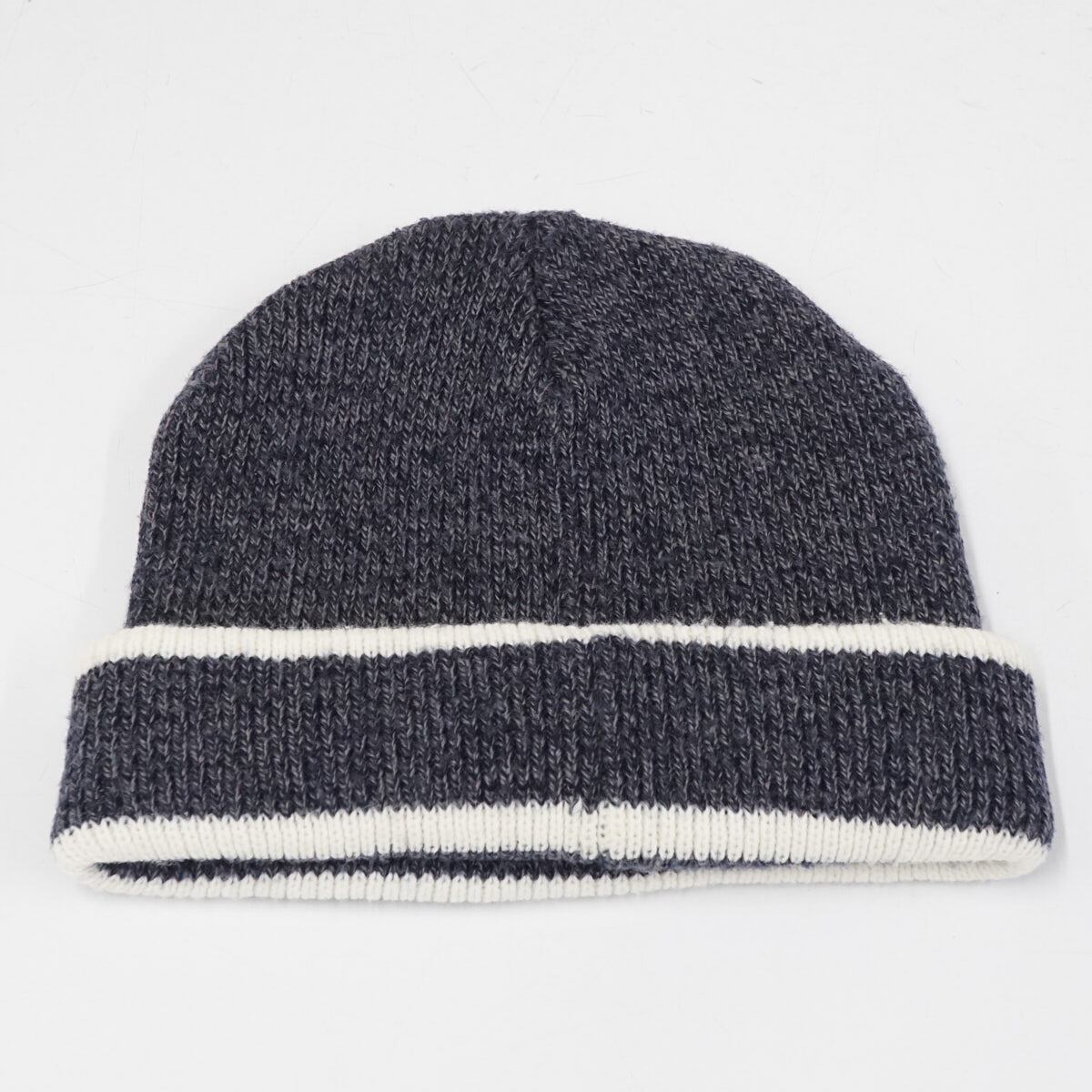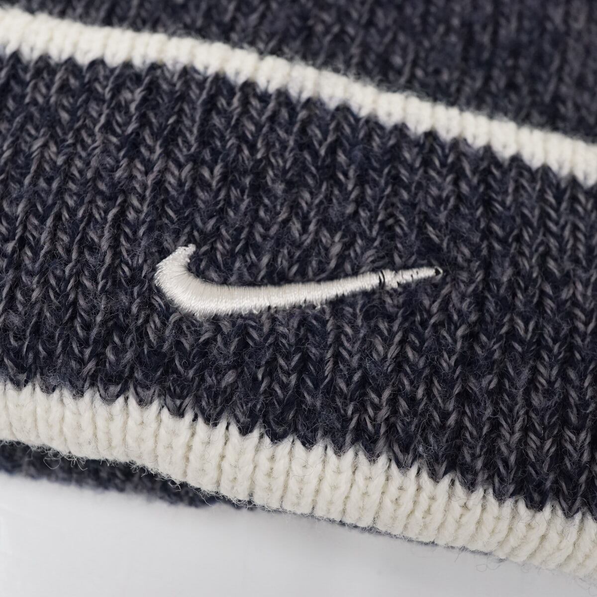 ネイビーの生地にロゴ刺繍とホワイトのラインが入ったナイキのニット帽です。