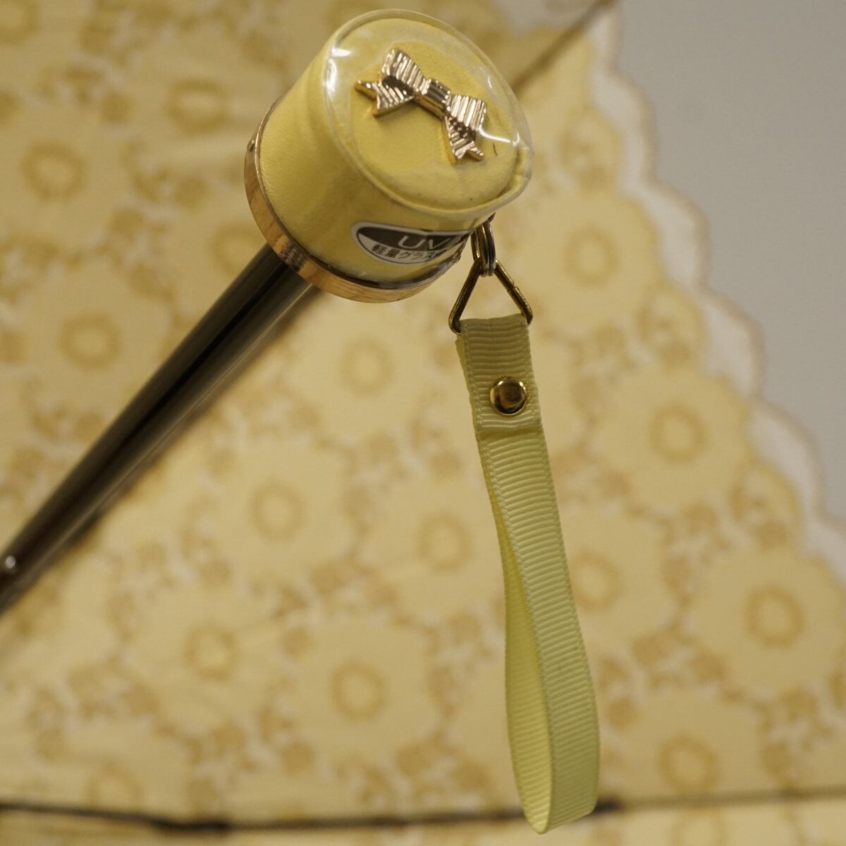 イエローカラーの光沢ある生地に、フラワーが描かれているデザインです。