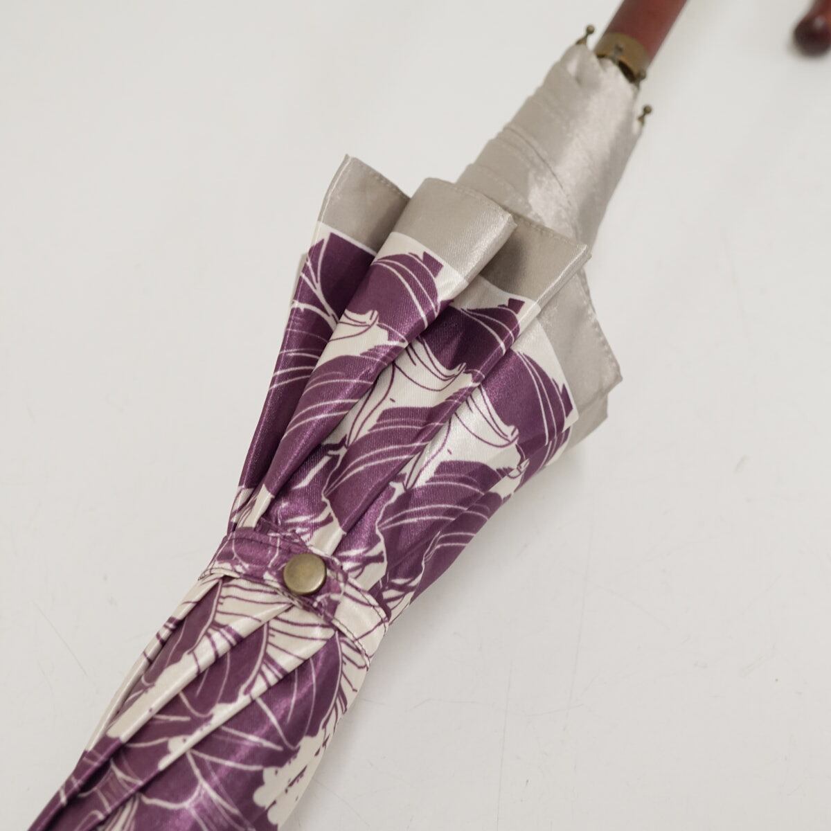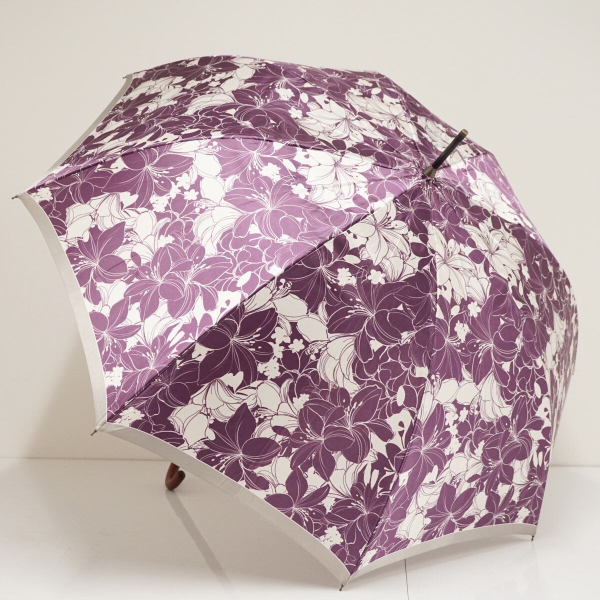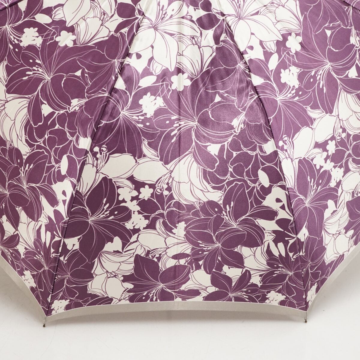 光沢のあるパープルとホワイトの生地に大きめのフラワーが全体に描かれています。