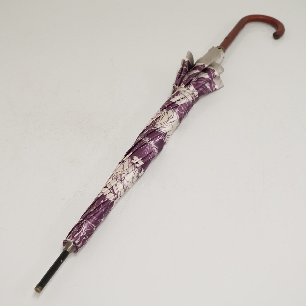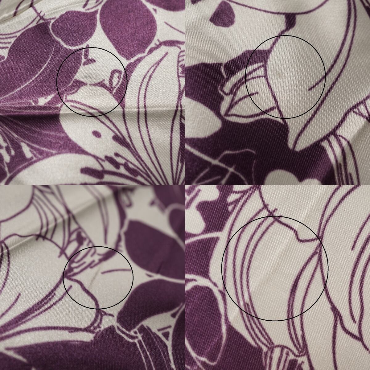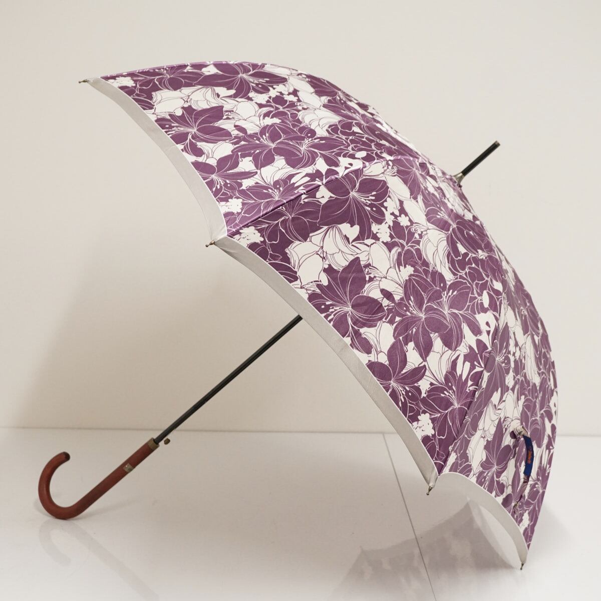 光沢のあるパープルとホワイトの生地に大きめのフラワーが全体に描かれています。