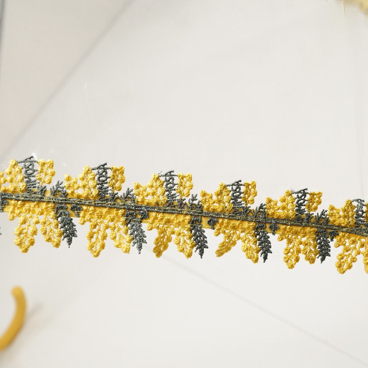 透明なビニール傘のシンプルな魅力と、カラフルで明るいレースの上品さが組み合わさり、魅力的なデザインの雨傘です。